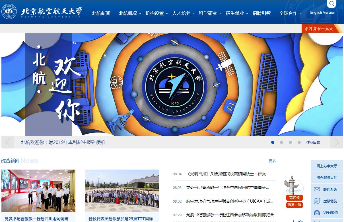 北京航空航天大學(簡稱北航)成立于1952年,由當時的清華大學、北洋大學、廈門大學、四川大學等八所院校的航空系合并組建,是新中國第一所航空航天高等學府,現(xiàn)隸屬于工業(yè)和信息化部。學校所在地北京,分為學院路校區(qū)、沙河校區(qū),占地3000多畝,總建筑面積170余萬平方米。建校以來,北航一直是國家重點建設(shè)的高校,是全國第一批16所重點高校之一,也是80年代恢復學位制度后全國第一批設(shè)立研究生院的22所高校之一,首批進入“211工程”,2001年進入“985工程”,2013年入選首批“2011計劃”國家協(xié)同創(chuàng)新中心,2017年入選國家“雙一流”建設(shè)高校名單。學校第十六次黨員代表大會提出以建設(shè)扎根中國大地的世界一流大學為發(fā)展遠景目標。近年來,學校著力提升辦學境界和格局,大力促進空天信融合發(fā)展的學科態(tài)勢,持續(xù)優(yōu)化創(chuàng)新人才培養(yǎng)體系,積極推進一流師資隊伍建設(shè),加快推動科研創(chuàng)新轉(zhuǎn)型發(fā)展,務(wù)實開展高水平的國際交流合作,大力推進辦學條件和民生改善,全面加強黨的建設(shè)和思想政治工作,各項事業(yè)發(fā)展取得了突出的成績。綜合辦學能力和核心競爭力不斷增強,躋身國內(nèi)高水平大學的第一方陣,國際影響力顯著提升。學校學科繁榮,特色鮮明。截止2018年4月,有工、理、管、文、法、經(jīng)、哲、教育、醫(yī)和藝術(shù)10個學科門類。有8個一級學科國家重點學科(并列全國高校第7名),28個二級學科國家重點學科,10個北京市重點學科,10個國防特色學科,14個A類學科,其中航空宇航科學與技術(shù)、儀器科學與技術(shù)、材料科學與工程、軟件工程為A+學科。有60個本科專業(yè),23個博士學位授權(quán)一級學科點,40個碩士學位授權(quán)一級學科點,20個博士后科研流動站。學校突出學科基礎(chǔ)地位,構(gòu)建空天信融合、理工文交叉、醫(yī)工結(jié)合的一流學科體系,形成珠峰引領(lǐng)、高峰集群、高原拓展的良性學科生態(tài)。在航空、航天、動力、信息、材料、儀器、制造、管理等學科領(lǐng)域具有明顯的比較優(yōu)勢,形成了航空航天與信息技術(shù)兩大優(yōu)勢學科群,國防科技主干學科達到國內(nèi)一流水平,工程學、材料科學、物理學、計算機科學、化學五個學科領(lǐng)域的ESI排名進入全球前1%,工程學進入全球前1‰,具備了建設(shè)世界一流學科的基礎(chǔ)。在2017年“軟科世界一流學科排名”中,航空航天工程學科為世界第二、中國第一。學校名師薈萃,人杰地靈。截止2018年4月,目前學校教職工總數(shù)達到3928人,其中專任教師2172人。專任教師中,73.75%具有高級職稱,83.60%具有博士學位。匯聚了以23位兩院院士、27位中組部“千人計劃”創(chuàng)新項目入選者、31位“973”計劃首席科學家、65位“長江學者獎勵計劃”教授、50位“國家杰出青年科學基金”獲得者、3位國家級教學名師等為代表的高層次人才,引進諾貝爾獎獲得者3人,全職在校工作的青年長江學者11位,國家優(yōu)秀青年科學基金獲得者38位,青年千人58位,涌現(xiàn)出眾多國家一等獎獲得者、領(lǐng)域?qū)<液托吞柨値?,以及一大批年輕有為、造詣精深的專家學者。學校精育良才,立德樹人。有全日制在校生30000余人,其中本科生與研究生比例為1:1,在校攻讀學位的外國留學生近1300人。學校堅持立德樹人根本任務(wù),突出人才培養(yǎng)中心地位,把培養(yǎng)拔尖人才與強化愛國擔當相結(jié)合,在知識創(chuàng)造中培養(yǎng)人才,在人才培養(yǎng)中創(chuàng)造知識,著力培養(yǎng)理想高遠、學識一流、胸懷寰宇、致真唯實的領(lǐng)軍領(lǐng)導人才。打造一流本科生教育,推進大類招生,擴大專業(yè)自主選擇權(quán),突出厚基礎(chǔ)、個性化、導師制、小班化培養(yǎng),健全完全學分制。推進通識教育、書院育人,發(fā)揮華羅庚班、吳大觀班、人文社會科學實驗班及高等理工學院、中法工程師學院等實驗班和榮譽學院的引領(lǐng)輻射作用。構(gòu)建知識學習、能力實踐、國際交流三位一體大課堂,強化跨學科實踐、社會實踐和創(chuàng)新創(chuàng)業(yè)實踐。研究生教育堅持面向國家戰(zhàn)略需求,立足國際學術(shù)前沿,改革創(chuàng)新教育教學機制,重點實施尖端優(yōu)質(zhì)生源匯聚、精品課程體系構(gòu)筑、國際交流深度拓展、多方聚力協(xié)同育人、創(chuàng)新激勵分類優(yōu)秀、卓越導師隊伍建設(shè)等行動計劃,著力打造“重創(chuàng)新、強能力、高規(guī)格”的人才培養(yǎng)質(zhì)量品牌,探索出大飛機班、發(fā)動機班、信息安全班等定制化高層次人才聯(lián)合培養(yǎng)模式。擁有國家級人才培養(yǎng)模式創(chuàng)新實驗區(qū)6個、實驗教學示范中心5個、教學團隊5個、特色專業(yè)建設(shè)點11個和精品課程37門。人才培養(yǎng)碩果累累,涌現(xiàn)出了以“北航1號”、“北航2號”和“北航3號”探空火箭為代表的一大批學生科技創(chuàng)新作品。2010年以來,研究生有近400人次獲省部級及以上科技成果獎,其中國家級科技獎勵署名達74人次,在國際頂級學術(shù)刊物上發(fā)表論文的數(shù)量顯著增長,全國工程碩士實習實踐優(yōu)秀成果獲得者、全國做出突出貢獻的工程碩士學位獲得者等國家級榮譽稱號數(shù)量