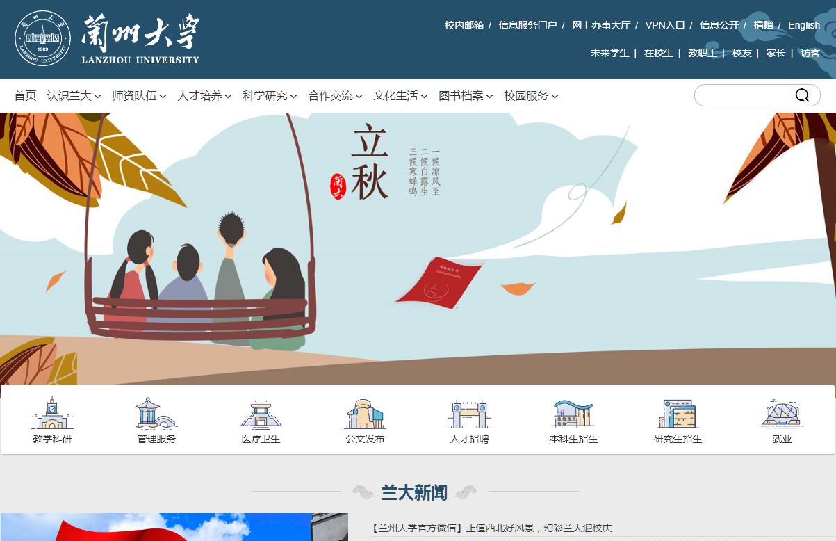 蘭州大學是教育部直屬的全國重點綜合性大學,是國家“985工程”和“211工程”重點建設高校之一。學校創(chuàng)建于1909年,其前身是清末新政期間設立的甘肅法政學堂,是甘肅近代高等教育開端之標志,開啟了西北高等教育的先河。1928年擴建為蘭州中山大學,1945年定名為國立蘭州大學。新中國成立后,蘭州大學堅持黨的教育方針,堅持正確的辦學方向,發(fā)展壯大,迅速崛起。在高等學校院系調整中,被確定為國家十四所綜合性大學之一;在“開發(fā)大西北”、“建立戰(zhàn)略后方”的戰(zhàn)略目標指引下,成為國家高等教育格局中具有重要戰(zhàn)略地位的一所大學,肩負起為國家特別是西部培養(yǎng)高級專門人才與發(fā)展科學、技術和文化的歷史重任。改革開放以來,學校緊緊抓住國家實施“科教興國”、“人才強國”戰(zhàn)略和“211工程”、“985工程”的歷史機遇,以解放思想為先導,以改革開放為動力,全面提高辦學水平,2002年和2004年,原甘肅省草原生態(tài)研究所、蘭州醫(yī)學院先后并入蘭州大學,使學校的學科更加齊全,綜合優(yōu)勢更加突出,迎來了歷史上的快速發(fā)展時期,并以辦學歷史長、辦學實力強、辦學成績突出,進入一流大學建設行列。學校所在地蘭州居大陸腹地、處黃河上游、為西北重鎮(zhèn)、乃山水美城,歷史文化底蘊深厚,多民族文化在這里交匯,是興學育才上選之地。校園面積3,800.137畝(不含未辦理土地證的面積),建有3個校區(qū)、3個分部,有2所附屬醫(yī)院、1所口腔醫(yī)院。學?,F(xiàn)有本科生19,510人,碩士研究生10,773人,博士研究生2,180人。學?,F(xiàn)有在職教職工3,590人,其中教學科研人員2,028人,專職管理人員805人,在站博士后131人,其中師資博士后27人。教授等正高職546人,副教授等副高職719人,臨床醫(yī)學教授112人,副教授249人。研究生導師1,620人,其中博士研究生指導教師521人,碩士研究生指導教師1099人。兩院院士14人,“千人計劃”特聘教授11人,“萬人計劃”領軍人才10人,教育部“長江學者獎勵計劃”特聘教授18人,國家杰出青年基金獲得者19人,百千萬人才工程國家級人選12人,“創(chuàng)新人才推進計劃”中青年科技創(chuàng)新領軍人才6人,教育部“高等學校教學名師”4人,“千人計劃”青年項目人選6人,“萬人計劃”青年拔尖人才5人,教育部“長江學者獎勵計劃”青年學者項目人選4人,國家優(yōu)秀青年科學基金獲得者21人,教育部新世紀(跨世紀)人才129人,甘肅省高等學校教學名師27人,甘肅省領軍人才88人,國家自然科學基金委創(chuàng)新研究群體4個,教育部創(chuàng)新團隊8個,高等學校學科創(chuàng)新引智基地7個,國家級教學團隊5個。蘭州大學學科門類齊全,學科特色鮮明,涵蓋了12個學科門類?,F(xiàn)有8個國家重點學科,2個國家重點(培育)學科,35個省級重點學科,3個省級重點(培育)學科。有2個國家重點實驗室,2個國家地方聯(lián)合工程實驗室,6個教育部重點實驗室,4個教育部工程研究中心,1個農業(yè)部重點實驗室,15個甘肅省重點實驗室(含培育基地),2個甘肅省工程技術研究中心,9個甘肅省工程研究中心(工程實驗室),2個甘肅省高校重點實驗室,5個國家國際科技合作基地,7個高等學校學科創(chuàng)新引智基地,2個教育部人文社會科學重點研究基地,1個教育部區(qū)域和國別研究培育基地,4個教育部國別和區(qū)域研究中心(備案),5個甘肅省高等學校人文社會科學重點研究基地,1個甘肅省哲學社會科學重大研究基地,1個甘肅高校精準扶貧智庫,3個甘肅高校新型智庫。蘭州大學是我國首批具有學士、碩士、博士學位授予權,首批建立博士后科研流動站,首批設置文、理科國家基礎科學研究與教學人才培養(yǎng)基地,首批入選國家大學生創(chuàng)新性實驗計劃的高校之一。經(jīng)教育部批準建有研究生院。學校現(xiàn)有100個本科專業(yè),45個碩士學位授權一級學科,23個博士學位授權一級學科,18個碩士專業(yè)學位授權類型,1個博士專業(yè)學位授權類型,19個博士后科研流動站。有6個國家級人才培養(yǎng)基地,7個國家級實驗教學示范中心,2個國家級人才培養(yǎng)模式創(chuàng)新實驗區(qū),16個國家級特色專業(yè),8個省部級基礎科學研究和教學人才培養(yǎng)基地,11個省級實驗教學示范中心,14個省級特色專業(yè)。畢業(yè)生素以基礎扎實、知識面寬、勤奮實干而深受社會歡迎。自建校以來,已為國家培養(yǎng)了10多萬名各類人才,許多人成為著名的專家學者、企業(yè)家和優(yōu)秀的黨政管理人才。1999年至今,先后有14位校友當選為院士。蘭州大學的科學研究素以基礎研究見長,同時廣泛開展應用研究。近年來,學校堅持貼近國家目標,立足西北特色,大力扶植新的學科增長點,承擔國家重大項目和服務地方經(jīng)濟社會發(fā)展的能力均大幅提高。已先后獲得國家、部委和省級科技成果獎700余項,部編輯出版各種專著、教材、譯著1400余部。2016以第一單位發(fā)表SCI論文1,547篇,排名全國高校第39位;2007-2016年發(fā)表SCI論文12,220篇,被引用155,512次,篇均被引12.73次,排名全國高校第24位。2017年11月,美國湯森路透集團發(fā)布了最新基本科學指標數(shù)據(jù)ESI,蘭州大學共有12個學科進入ESI全球前1%,分別是化學、物理學、材料學、地球科學、植物動物學、數(shù)學、工程學、生物和生物化學、環(huán)境和生態(tài)