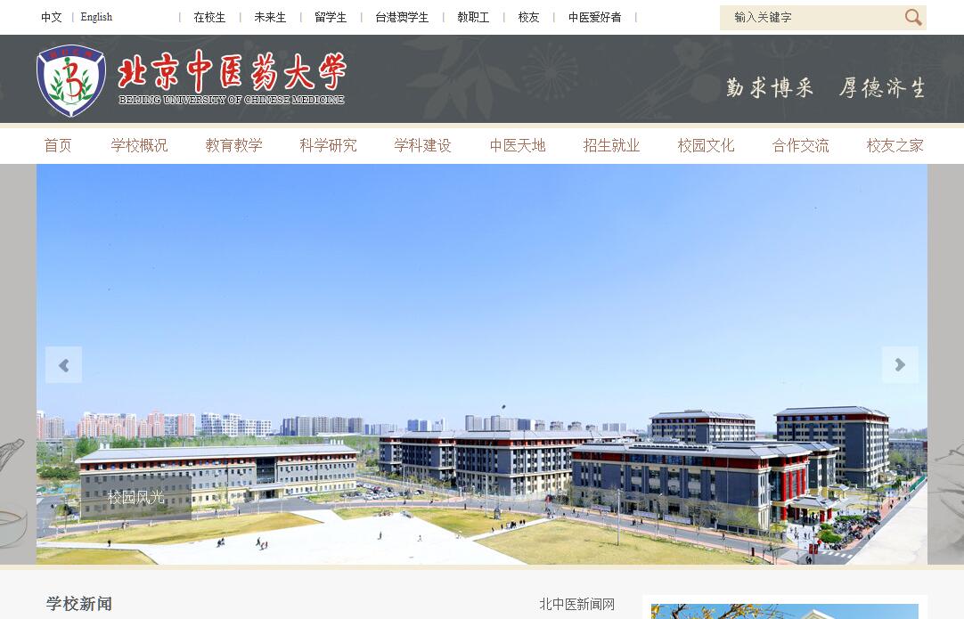 北京中醫(yī)藥大學(xué)是一所以中醫(yī)藥學(xué)為主干學(xué)科的全國重點(diǎn)大學(xué),是唯一進(jìn)入國家“211工程”建設(shè)的高等中醫(yī)藥院校,是國家“985優(yōu)勢學(xué)科創(chuàng)新平臺”建設(shè)高校,是國家一流學(xué)科建設(shè)高校,直屬教育部管理,由教育部、國家衛(wèi)生健康委員會、國家中醫(yī)藥管理局和北京市共建。學(xué)校現(xiàn)任黨委書記谷曉紅,校長徐安龍。北京中醫(yī)藥大學(xué)始建于1956年,前身為北京中醫(yī)學(xué)院,是國務(wù)院批準(zhǔn)最早創(chuàng)辦的高等中醫(yī)藥院校。1960年,被中央確定為全國重點(diǎn)高校;1971年,與中國中醫(yī)研究院合并;1977年,兩院分開,恢復(fù)獨(dú)立辦學(xué);1993年,更名為北京中醫(yī)藥大學(xué);1996年,入選國家“211工程”重點(diǎn)建設(shè)大學(xué);2000年,與北京針灸骨傷學(xué)院合并,組建新的北京中醫(yī)藥大學(xué);2011年,入選國家“985工程優(yōu)勢學(xué)科創(chuàng)新平臺”建設(shè)高校;2017年,中醫(yī)學(xué)、中西醫(yī)結(jié)合、中藥學(xué)3個學(xué)科入選國家“雙一流”建設(shè)學(xué)科名單。學(xué)?,F(xiàn)有3個校區(qū),分別為和平街校區(qū)、望京校區(qū)和良鄉(xiāng)校區(qū)。在長期的辦學(xué)實(shí)踐中,學(xué)校秉承“勤求博采、厚德濟(jì)生”校訓(xùn),倡導(dǎo)“人心向?qū)W、傳承創(chuàng)新”理念,堅持“立德樹人、以文化人”宗旨,弘揚(yáng)“追求卓越、止于至善”精神,彰顯特色、強(qiáng)化優(yōu)勢,是我國培養(yǎng)高層次創(chuàng)新型中醫(yī)藥人才的教育基地、高等中醫(yī)藥教育改革的示范基地、中醫(yī)藥知識創(chuàng)新和技術(shù)創(chuàng)新的研究基地、防治重大疾病和疑難疾患的醫(yī)療基地、弘揚(yáng)優(yōu)秀傳統(tǒng)文化的人文基地、推進(jìn)中醫(yī)藥走向世界的國際交流基地,為人類健康事業(yè)發(fā)展和文明進(jìn)步做出了重要貢獻(xiàn),已經(jīng)成為在國內(nèi)外享有盛譽(yù)的集教學(xué)、科研、醫(yī)療于一體的著名中醫(yī)藥高等學(xué)府。學(xué)校現(xiàn)有教職工5020人,專任教師1285人,其中具有高級專業(yè)技術(shù)職務(wù)者占66.3%,具有碩士以上學(xué)位者占85.45%,有博士生導(dǎo)師335名。學(xué)校有“國醫(yī)大師”6人,全國名中醫(yī)3人,“首都國醫(yī)名師”33人,“長江學(xué)者”特聘教授3人,國家杰出青年科學(xué)基金獲得者3人,優(yōu)秀青年科學(xué)基金獲得者1人,“973”項目首席科學(xué)家4人,“萬人計劃”科技創(chuàng)新領(lǐng)軍人才4人,“萬人計劃”教學(xué)名師1人,第七屆國務(wù)院學(xué)科評議組成員3人,百千萬人才工程國家級人選7人,國家級有突出貢獻(xiàn)中青年專家8人,中醫(yī)藥高等學(xué)校教學(xué)名師4人,享受政府特殊津貼專家130人,形成了一支以國內(nèi)外著名專家學(xué)者和國內(nèi)有影響的中青年教授為主的師資隊伍。學(xué)?,F(xiàn)有全日制在校生11644人,其中本、??粕?264人,碩士研究生3594人,博士研究生786人,臺港澳學(xué)生508人,留學(xué)生537人。另有繼續(xù)教育學(xué)生2467人,遠(yuǎn)程教育學(xué)生18155人,目前全校各類在校生達(dá)32266人。學(xué)校致力于構(gòu)建面向未來以高層次教育為主的人才培養(yǎng)體系,目前設(shè)有中醫(yī)學(xué)、中藥學(xué)、中藥制藥、藥學(xué)、針灸推拿學(xué)、康復(fù)治療學(xué)、公共事業(yè)管理(衛(wèi)生事業(yè))、藥事管理、信息管理與信息系統(tǒng)、護(hù)理學(xué)、英語(醫(yī)學(xué)、中醫(yī)藥國際傳播)、法學(xué)(醫(yī)藥衛(wèi)生)12個本科專業(yè)。學(xué)校是全國高等中醫(yī)藥院校中首批建立博士學(xué)科點(diǎn)和博士后科研流動站的單位之一,設(shè)有中醫(yī)學(xué)、中藥學(xué)、中西醫(yī)結(jié)合3個博士后科研流動站。中醫(yī)學(xué)、中藥學(xué)、中西醫(yī)結(jié)合均具有一級學(xué)科博士學(xué)位授權(quán),囊括42個二級學(xué)科博士學(xué)位授予點(diǎn),并有45個碩士學(xué)位授予點(diǎn)。5個專業(yè)學(xué)位類別,下設(shè)14個領(lǐng)域,包括9個博士學(xué)位授權(quán)點(diǎn),14個碩士學(xué)位授權(quán)點(diǎn)。學(xué)?,F(xiàn)有一級學(xué)科國家重點(diǎn)學(xué)科2個,涵蓋二級學(xué)科國家重點(diǎn)學(xué)科15個;國家中醫(yī)藥管理局重點(diǎn)學(xué)科48個;一級學(xué)科北京市重點(diǎn)學(xué)科2個,二級學(xué)科北京市重點(diǎn)學(xué)科8個。重點(diǎn)學(xué)科建設(shè)在全國中醫(yī)藥院校中保持領(lǐng)先地位。學(xué)校現(xiàn)有省部級以上科研基地48個,其中國家級國際科技合作基地2個;教育部重點(diǎn)實(shí)驗(yàn)室3個;教育部工程研究中心2個;高等學(xué)校學(xué)科創(chuàng)新引智基地2個;國家中醫(yī)藥管理局三級實(shí)驗(yàn)室14個;國家中醫(yī)藥管理局重點(diǎn)研究室11個;北京市重點(diǎn)實(shí)驗(yàn)室6個;北京市教委工程研究中心1個;北京市國際科技合作基地6個;北京中醫(yī)藥文化研究基地1個。學(xué)?,F(xiàn)有東直門醫(yī)院(第一臨床醫(yī)學(xué)院)、東方醫(yī)院(第二臨床醫(yī)學(xué)院)、第三附屬醫(yī)院(第三臨床醫(yī)學(xué)院)、棗莊醫(yī)院(第四臨床醫(yī)學(xué)院)、深圳醫(yī)院(第五臨床醫(yī)學(xué)