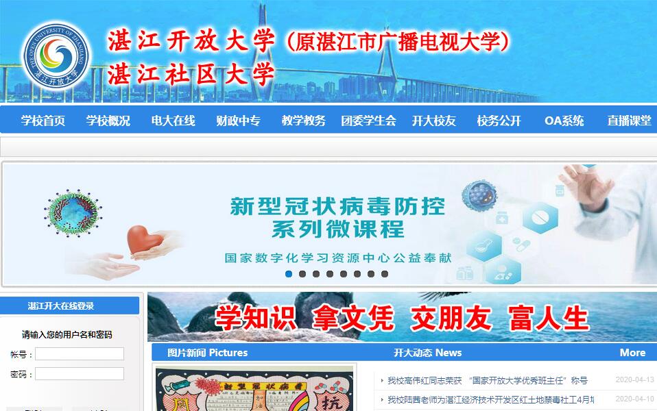 湛江開放大學(xué)(原湛江市廣播電視大學(xué))、湛江市業(yè)余大學(xué)位于美麗的海濱城市——廣東省湛江市。湛江市業(yè)余大學(xué)創(chuàng)辦于1979年,湛江市廣播電視大學(xué)創(chuàng)辦于1980年,兩所學(xué)校一直以來實行兩塊牌子一套班子的管理模式。2001年,湛江市人民政府決定,湛江市廣播電視大學(xué)兼并湛江市財政成人中等專業(yè)學(xué)校,組建新的湛江市廣播電視大學(xué)。2008年,湛江市政府批準湛江市廣播電視大學(xué)增掛湛江社區(qū)大學(xué)牌子。2017年11月,湛江市委、市政府批準湛江市廣播電視大學(xué)更名為湛江開放大學(xué)。湛江開放大學(xué)現(xiàn)有教職工99人,其中,中、高級職稱58人,此外還外聘了100余名教師。學(xué)校有3個校區(qū),分別是校本部、附屬財政中專和赤坎教學(xué)部,校園總面積30畝,建筑面積3萬多平方米。學(xué)?,F(xiàn)有網(wǎng)絡(luò)中心1個、多媒體教室45間、多功能計算機室11間、多功能電子閱覽室1個。學(xué)校設(shè)有辦公室、教學(xué)科、教務(wù)科、招生科、培訓(xùn)科、總務(wù)科、信息技術(shù)中心、中專部、赤坎教學(xué)部等九個行政科室和理工、文法、經(jīng)濟等三個教研室。學(xué)校管轄徐聞、雷州、遂溪、廉江、吳川五縣(市)電大。湛江開放大學(xué)堅持面向社會,服務(wù)經(jīng)濟,為湛江市培養(yǎng)實用型人才的宗旨,在改革中不斷發(fā)展。1997年經(jīng)廣東省專家組評估,被廣東省高等教育廳授予廣東廣播電視大學(xué)先進學(xué)校稱號;1999年經(jīng)廣東省電大批準成為首批參加中央電大“人才培養(yǎng)模式改革和開放教育試點”項目研究的市級電大之一。2002年通過了由教育部組織的開放教育試點項目研究的中期評估。湛江電大先后開設(shè)了理工、財經(jīng)、文法等40多個??茖I(yè)和9個“專升本”專業(yè),現(xiàn)有在校生7800多人,其中:本科學(xué)生1800多人,??茖W(xué)生4200多人,中專學(xué)生1800多人。湛江開放大學(xué)積極走聯(lián)合辦學(xué)之路,與十多家名牌大學(xué)聯(lián)合舉辦大專、本科、研究生學(xué)歷教育。2014年湛江市廣播電視大學(xué)被評為“廣東省示范性基層電大”,2015年被評為“國家開放大學(xué)招生優(yōu)秀集體”、“廣東開放大學(xué)招生先進單位”和“湛江市文明單位”, 2016年在全省電大系統(tǒng)績效考核中被評為優(yōu)秀。