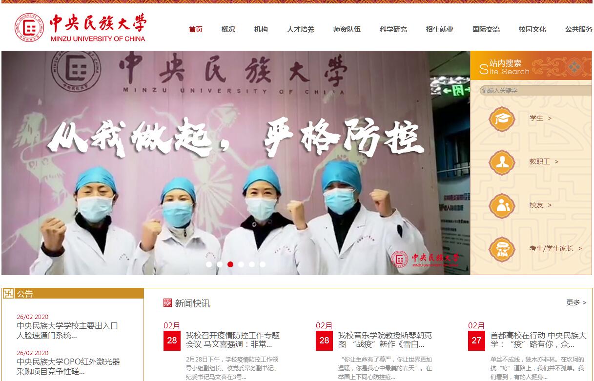 中央民族大學(Minzu University of China)坐落于北京學府林立的海淀區(qū),南鄰國家圖書館,北依中關(guān)村科技園,校園環(huán)境典雅,古樸幽美,人文氛圍濃郁,具有鮮明的民族特色。中央民族大學的前身是1941年9月中國共產(chǎn)黨在延安創(chuàng)辦的民族學院。1951年6月,中央民族學院在北京正式成立,烏蘭夫任首任院長。1993年11月,更名為中央民族大學?,F(xiàn)任校黨委書記張京澤、校長黃泰巖。黨和國家歷屆領(lǐng)導集體始終關(guān)心和重視中央民族大學的建設和發(fā)展。建校初至1966年,毛澤東、劉少奇、周恩來、朱德等黨和國家領(lǐng)導人先后14次接見學校師生代表。改革開放以后,鄧小平3次接見師生代表。1993年學校更名為中央民族大學時,國家主席江澤民同志為學校題寫了新校名。2001年6月,學校50周年校慶之際,國務院總理朱镕基同志到校視察,并代表中央政府提出了“把中央民族大學建成世界一流的民族大學”的奮斗目標。同年,胡錦濤、李嵐清等國家領(lǐng)導人親自審批了國家民委、教育部、國家計委、財政部四部委聯(lián)合上報的《關(guān)于進一步辦好中央民族大學的請示》。2002年6月,國家民委、教育部、北京市人民政府簽署了《關(guān)于重點共建中央民族大學的協(xié)議》。在黨和國家的高度重視下,學校1978年被批準為國家重點大學,在其后發(fā)展中,先后進入“211工程”、“985工程”和“一流大學、一流學科”國家重點建設大學行列。學校建校之初,一批學界名流,如潘光旦、吳文藻、費孝通、翁獨健、吳澤霖、馮家昇、楊成志、林耀華、傅樂煥、于道泉、聞宥、馬學良、王鍾翰等到校任教,成為學校教學科研和學科建設的重要奠基人?,F(xiàn)有教職工總數(shù)為1893人,其中專任教師1196人,專任教師中教授、副教授678人,占專任教師總數(shù)的57%。他們當中有戴慶廈、牟鐘鑒、胡振華、施正一、劉秉江、馬躍、靡若如、李魁正、楊圣敏、金炳鎬、薛達元等知名專家學者,還有不斷涌現(xiàn)的諸多中青年新秀,已漸成學界翹楚。另外,學校每年都聘有130多名外籍專家任教。學校目前有教育部“長江學者獎勵計劃”特聘教授3人、教育部“長江學者獎勵計劃”青年學者1人、中組部“千人計劃”特聘教授1人、“國家百千萬人才工程”人選12人、教育部“新世紀優(yōu)秀人才支持計劃”人選56人,國家民委突出貢獻專家11人。國家級教學名師2人,北京市教學名師16人,享受國務院政府特殊津貼113人。學校與35個國家和地區(qū)的150余所大學和科研機構(gòu)建立了交流合作關(guān)系,每年都有一批在相關(guān)學科領(lǐng)域有重要影響的著名學者來校訪問講學、交流。學?,F(xiàn)有24個學院,有覆蓋10個學科門類的64個本科專業(yè)、5個一級學科博士學位授權(quán)點、5個博士后科研流動站,26個一級學科碩士學位授權(quán)點,國家級重點學科3個、省部級重點學科一級5個、二級13個,省部交叉重點學科1個,2個國家文科基礎(chǔ)學科人才培養(yǎng)和科學研究基地, 1個教育部人文社會科學重點研究基地,6個國家民委人文社會科學重點研究基地,1個國家民委-教育部共建重點實驗室,1個教育部民族教育發(fā)展中心重點研究基地,1個北京市重點工程中心,1個國家級實驗教學示范中心,5個北京市實驗教學示范中心。學校面向全國31個省、自治區(qū)、直轄市和臺港澳地區(qū)招生,現(xiàn)有全日制在校生16858人,其中本科生11283人,碩士、博士研究生4708人,少數(shù)民族預科生184人(本校);本科生(含預科生)中,少數(shù)民族學生比例為50%。學校是“中國政府獎學金”留學生接收學校,有來自50多個國家的近700名留學生在校學習。建校以來,學校為國家輸送了10萬余名各民族畢業(yè)生。其中有知名專家學者近千名,少數(shù)民族省部級領(lǐng)導干部近百名,地廳級領(lǐng)導干部近千名,縣處級領(lǐng)導干部萬余名,他們在不同的崗位上為國家的民族團結(jié)與發(fā)展事業(yè)做出了突出的貢獻。中央民族大學已成為培養(yǎng)少數(shù)民族杰出人才和民族團結(jié)表率的搖籃。學校現(xiàn)占地面積為38萬平方米,另規(guī)劃新校區(qū)占地面積81萬平方米。校園建筑面積59.2萬平方米,教學行政用房20余萬平方米,資產(chǎn)總值34億元。擁有各類圖書和電子圖書430萬余冊,民族學、中國少數(shù)民族語言文學圖書文獻資料藏量居國內(nèi)高校前列。學校出版社是全國民族學科教材和著作的出版基地,《中央民族大學學報》和《民族教育研究》是面向國內(nèi)外發(fā)行的全國核心期刊。民族博物館藏有3萬余件珍貴的民族文物,已經(jīng)成為學生愛國主義教育和教學實踐基地。目前,全校師生員工高舉習近平新時代中國特色社會主義思想偉大旗幟,深入貫徹落實黨的十九大精神,不忘初心,牢記使命,服務于國家戰(zhàn)略和民族團結(jié)進步事業(yè),服務于少數(shù)民族和民族地區(qū)發(fā)展,確定學校發(fā)展的“三步走”階段性目標,實施質(zhì)量立校、人才強校、特色興校、管理強校和開放辦校五大戰(zhàn)略,以改革創(chuàng)新精神和攻堅克難的勇氣,奮力推進特色鮮明的世界一流大學建設。