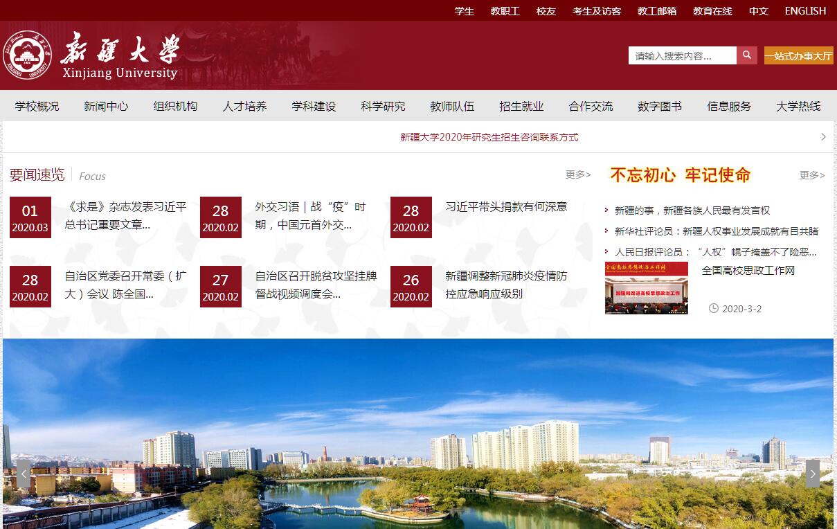 新疆大學是一所有著悠久辦學歷史、光榮革命傳統(tǒng)、鮮明辦學特色的綜合性大學,在國家高等教育布局中具有重要的作用和特殊的區(qū)域地位,是自治區(qū)高等教育的領頭羊和排頭兵。1924年,新疆大學的前身——新疆俄文法政專門學校創(chuàng)立,拉開了新疆高等教育的序幕。1935年1月,改建為新疆學院。抗日戰(zhàn)爭期間,俞秀松、林基路、杜重遠等一批共產黨人和文學家茅盾、哲學家張仲實、藝術家趙丹等一批進步人士來校任教,提出了“以民族為形式,以馬列為內容”的教育思想,掀起了轟轟烈烈的抗日救國宣傳活動,社會影響日增,學校被譽為“抗大第二”。1960年,新疆大學正式成立,學??缛肓诵碌陌l(fā)展時期,在國家歷次確立重點建設大學時,新疆大學均位居其中。1978年,學校被國務院確定為第一批88所重點高等院校之一,全國16所綜合性重點大學之一。1997年,學校被列入國家首批“211工程”重點建設高校。2000年,被教育部確定為國家西部大開發(fā)重點建設大學。同年,新疆大學與原新疆工學院合并組建新的新疆大學。2004年,學校成為新疆維吾爾自治區(qū)人民政府、教育部“區(qū)部共建”高校。2012年,學校被列為國家“中西部高校綜合實力提升工程”建設高校(“一省一校”)。2017年,進入全國首批42所一流大學建設高校行列。2018年,列入“部省合建”高校行列。在90余年的發(fā)展歷程中,學校以維護祖國統(tǒng)一、民族團結、國家安全、社會穩(wěn)定為己任,把服務國家發(fā)展戰(zhàn)略和自治區(qū)經濟社會發(fā)展需要作為學校的使命擔當和歷史責任,秉承“團結、奮進、求實、創(chuàng)新”的校訓,扎根中國大地、立足新疆大學實際,以立德樹人為根本任務,以辦好人民滿意的大學為根本宗旨,為新疆經濟社會發(fā)展培養(yǎng)了20余萬名各民族專門人才,譜寫了新疆高等教育發(fā)展的壯麗篇章。新疆大學現(xiàn)有24個學院,1個研究生院,1個獨立學院,1個教學研究部,4個教學實踐中心,8個研究所,1個干旱半干旱可持續(xù)發(fā)展國際研究中心?,F(xiàn)有經濟學、法學、文學、歷史學、理學、工學、管理學、藝術學、哲學九個學科門類,涵蓋了高級專門人才培養(yǎng)和科學研究的主要領域。學校先后被列入國家級卓越工程師、卓越法律人才培養(yǎng)計劃實施高校,教育部本科專業(yè)綜合改革試點高校。現(xiàn)有2個國家級重點學科,1個國家重點培育學科;6個自治區(qū)高峰學科、7個自治區(qū)高原學科;14個博士學位授權一級學科、31個碩士學位授權一級學科,11個博士后科研流動站,10個碩士專業(yè)學位類別;91個本科專業(yè),包括10個國家特色專業(yè),19個自治區(qū)緊缺人才專業(yè),12個自治區(qū)重點專業(yè)。2017年,新疆大學共獲得各類科研項目908項,資助經費達到17494萬元。承擔5項重點重大項目,其中教育部哲學社會科學研究重大課題攻關項目1項,國家自然科學基金-新疆聯(lián)合基金重點項目4項;公開發(fā)表學術論文1454篇;獲自治區(qū)科學技術進步特等獎1項、二等獎6項、三等獎4項。新疆大學現(xiàn)有省部級以上科研平臺(團隊)56個,其中,自治區(qū)級協(xié)同創(chuàng)新中心2個;科技部省部共建國家重點實驗室培育基地1個,國家國際科技合作基地1個,教育部重點實驗室3個,自治區(qū)重點實驗室(工程技術研究中心)11個,自治區(qū)高校重點實驗室7個;教育部工程研究中心1個,自治區(qū)工程技術研究中心2個;教育部人文社會科學重點研究基地1個,自治區(qū)高校人文社科重點研究基地9個;國家理科基礎科學研究與教學人才培養(yǎng)基地1個;科技部重點領域創(chuàng)新團隊1個,教育部創(chuàng)新團隊4個,科技廳天山創(chuàng)新團隊1個,教育廳創(chuàng)新團隊10個;自治區(qū)資源共享平臺1個。現(xiàn)有各類在讀學生36157人,其中普通本科生21025人,全日制碩士研究生5159人,博士研究生453人,非全日制研究生1039人,留學生904人,成人本??粕?577人。學?,F(xiàn)有專任教師1879人(含雙肩挑教師),具有高級職稱教師占專任教師總數(shù)的48.86%,具有博士學位教師占專任教師總數(shù)的38.03%?,F(xiàn)有中國工程院院士1名,教育部“長江學者”特聘教授4名,“全國高校黃大年式教師團隊”1個,國家“千人計劃”(新疆項目)7人,“萬人計劃”4人,國家新世紀百千萬人才工程國家級人選3人,教育部“新世紀優(yōu)秀人才支持計劃”10人,自治區(qū)天山學者40人,自治區(qū)突出貢獻優(yōu)秀專家14人,享受國務院政府特殊津貼專家39人,自治區(qū)級教學能手15人、教學名師23人。學校先后與美國、俄羅斯等30多個國家和地區(qū)的160多所大學和科研院所建立了教育交流與合作關系,與60多所國外大學和教育機構簽署了教育交流與科研合作協(xié)議,在吉爾吉斯斯坦、俄羅斯設立3所孔子學院/孔子課堂。學校是上海合作組織大學項目學校、教育部富布萊特項目學校、教育部美大處項目學校,是中國政府獎學金自主招生項目學校、孔子學院獎學金項目學校和新疆政府獎學金項目學校。2010年,教育部安排清華大學為組長、西安交通大學、武漢大學、中南大學為副組長,北京師范大學、北京外國語大學、大連理工大學、同濟大學、東華大學、中國礦業(yè)大學為成員的10所高校對口支援新疆大學,2013年中國人民大學和中山大學加入支援高校團隊。新疆大學