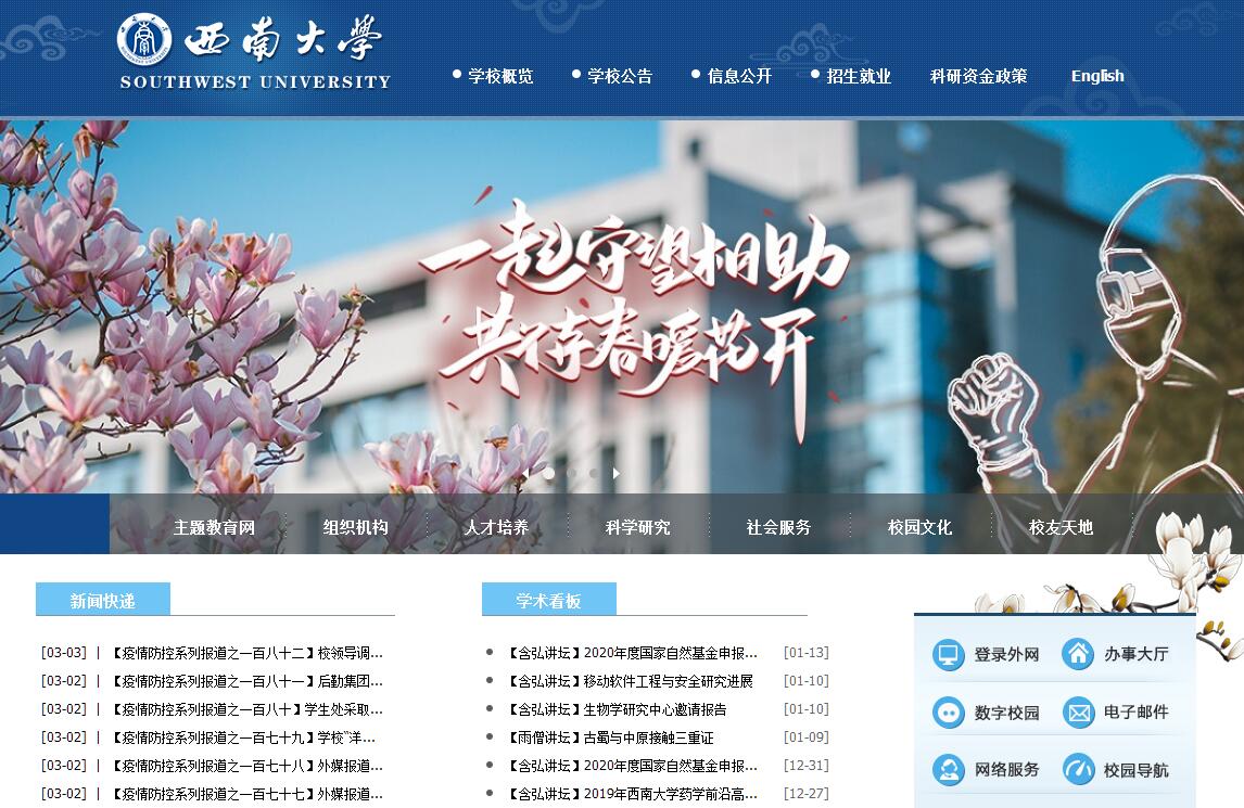西南大學(xué)(Southwest University)是教育部直屬,教育部、農(nóng)業(yè)部、重慶市共建的重點綜合大學(xué),是國家"211工程"和"985工程優(yōu)勢學(xué)科創(chuàng)新平臺"建設(shè)高校?,F(xiàn)任黨委書記舒立春教授、校長張衛(wèi)國教授。學(xué)校主體位于重慶市北碚區(qū),坐落于縉云山麓、嘉陵江畔,占地8000余畝,校舍面積165萬平方米,綠地率達40%,泱泱校園,宏麗莊重,氣象萬千,是聞名遐邇的花園式學(xué)校,教育部表彰的文明校園。學(xué)校溯源于1906年建立的川東師范學(xué)堂,幾經(jīng)傳承演變,1936年更名為四川省立教育學(xué)院。1950年,四川省立教育學(xué)院的教育、國文、外文、史地、數(shù)學(xué)等系與1940年成立的國立女子師范學(xué)院合并建立西南師范學(xué)院,農(nóng)藝、園藝和農(nóng)產(chǎn)制造等系與1946年創(chuàng)辦的私立相輝學(xué)院等合并建立西南農(nóng)學(xué)院。1985年,兩校分別更名為西南師范大學(xué)、西南農(nóng)業(yè)大學(xué)。2000年,重慶市輕工業(yè)職業(yè)大學(xué)并入西南師范大學(xué);2001年,西南農(nóng)業(yè)大學(xué)、四川畜牧獸醫(yī)學(xué)院、中國農(nóng)業(yè)科學(xué)院柑桔研究所合并組建為新的西南農(nóng)業(yè)大學(xué)。2005年,西南師范大學(xué)、西南農(nóng)業(yè)大學(xué)合并組建為西南大學(xué),開啟了學(xué)校發(fā)展嶄新篇章。百余年來,篳路藍縷,玉汝于成,數(shù)代西南大學(xué)人以其弘毅堅韌、自強不息的奮斗鑄就了"特立西南、學(xué)行天下"的大學(xué)精神,不斷豐富著"含弘光大,繼往開來"的校訓(xùn)內(nèi)涵。百余年來,學(xué)校始終以國家富強和民族振興為己任,杏壇育人,勸課農(nóng)桑,積淀了深厚的人文底蘊。一大批名師先賢曾執(zhí)教于此,春風(fēng)化雨,躬耕不輟。數(shù)十萬畢業(yè)生從這里走向四面八方,成為民族復(fù)興大業(yè)的建設(shè)者和各行各業(yè)的中堅骨干。學(xué)校學(xué)科門類齊全,綜合性強、特色鮮明,現(xiàn)有53個一級學(xué)科,涵蓋了哲、經(jīng)、法、教、文、史、理、工、農(nóng)、醫(yī)、管、藝等12個學(xué)科門類,其中有3個國家重點學(xué)科、2個國家重點(培育)學(xué)科,28個一級學(xué)科具有博士學(xué)位授予權(quán)、51個一級學(xué)科具有碩士學(xué)位授予權(quán),有1種專業(yè)博士學(xué)位、19種專業(yè)碩士學(xué)位,另有博士后科研流動站22個,有6個學(xué)科領(lǐng)域進入ESI世界排名前1%。學(xué)校堅持以人才培養(yǎng)為根本,培養(yǎng)具有強烈社會責(zé)任感、深厚人文底蘊、扎實專業(yè)知識、富有創(chuàng)新精神和實踐能力的高素質(zhì)人才。學(xué)校現(xiàn)有32個學(xué)院(部),105個本科專業(yè),其中國家級特色專業(yè)20個、重慶市特色專業(yè)43個。教學(xué)資源豐富,現(xiàn)有國家級實驗教學(xué)示范中心4個、國家級虛擬仿真實驗中心3個、重慶市實驗教學(xué)示范中心13個,有國家級精品課程46門、重慶市精品課程96門,有國家級大學(xué)生文化素質(zhì)教育基地1個?,F(xiàn)有在校學(xué)生5萬余人,其中普通本科生近4萬人,碩士、博士研究生11000余人,留學(xué)生800余人。學(xué)?,F(xiàn)有專任教師2968人,其中教授572人、副教授1115人,博士生導(dǎo)師331人、碩士生導(dǎo)師1398人,中國科學(xué)院院士1人、中國工程院院士1人、資深教授1人、國家級教學(xué)名師3人、國家級有突出貢獻中青年專家5人、"千人計劃"入選者12人、"國家特支計劃"入選者9人、"長江學(xué)者"13人、"國家杰出青年基金"獲得者2人、"973"項目首席科學(xué)家2人、"百千萬人才工程"國家級人選12人、國務(wù)院學(xué)位委員會委員和學(xué)科評議組成員8人,國家級教學(xué)團隊4個、教育部創(chuàng)新團隊3個。學(xué)校建有國家重點實驗室1個、國家工程技術(shù)研究中心1個、國家地方聯(lián)合工程實驗室1個、省部共建國家重點實驗室培育基地1個、教育部或農(nóng)業(yè)部重點實驗室10個、教育部工程研究中心3個、"111計劃"創(chuàng)新引智基地3個、國家野外科學(xué)觀測試驗站2個、農(nóng)業(yè)部科學(xué)觀測實驗站2個、國土資源部野外基地2個、國家大學(xué)科技園1個、重慶市重點實驗室12個、重慶市工程實驗室(工程技術(shù)研究中心)25個、教育部人文社科重點研究基地1個、文化部公共文化研究基地1個、國家體育總局重點實驗室(共建)1個、重慶市人文社會科學(xué)重點研究基地13個。"十二五"期間,學(xué)校國家級科研立項數(shù)量達900余項,科研經(jīng)費總量達到20.35億元,獲"973"項目、"863"項目(課題)、國家社會科學(xué)基金重大項目、國家重點研發(fā)計劃項目、國家重大文化工程項目等國家級項目700余項,獲得授權(quán)專利1000余項,育成動植物新品種50個,出版專著800余部,自然科學(xué)在SCIE、EI、ISTP在三大檢索論文數(shù)量達5400余篇,人文社會科學(xué)在SSCI、A&HCI、CSSCI三大檢索論文數(shù)量達3600余篇。"十二五"以來獲國家科技進步二等獎2項、國家自然科學(xué)二等獎1項、中國專利優(yōu)秀獎1項、教育部普通高??茖W(xué)研究優(yōu)秀成果獎(人文社會科學(xué))20余項、重慶市科學(xué)技術(shù)獎一等獎8項。學(xué)校注重發(fā)揮自身優(yōu)勢,服務(wù)地方經(jīng)濟社會發(fā)展。堅持"立足重慶、面向西南