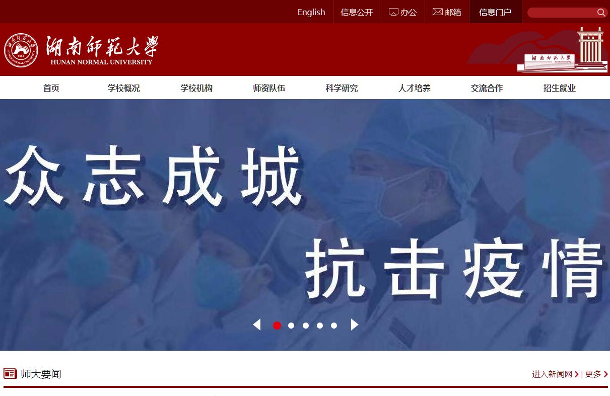 湖南師范大學(xué)創(chuàng)建于1938年,位于歷史文化名城長沙,是國家“211工程”重點(diǎn)建設(shè)的大學(xué)、國家“雙一流”建設(shè)高校、教育部普通高等學(xué)校本科教學(xué)工作水平評估優(yōu)秀高校。學(xué)?,F(xiàn)有7個(gè)校區(qū),占地2700余畝,建筑面積119余萬平方米。主校區(qū)西偎麓山,東瀕湘江,風(fēng)光秀麗,是全國綠化“400佳”單位之一。學(xué)校設(shè)有24個(gè)學(xué)院,85個(gè)本科招生專業(yè),本科和研究生教育覆蓋哲學(xué)、經(jīng)濟(jì)學(xué)、法學(xué)、教育學(xué)、文學(xué)、歷史學(xué)、理學(xué)、工學(xué)、醫(yī)學(xué)、管理學(xué)、藝術(shù)學(xué)等11大學(xué)科門類。學(xué)校擁有倫理學(xué)、英語語言文學(xué)、中國近現(xiàn)代史、發(fā)育生物學(xué)、理論物理、基礎(chǔ)數(shù)學(xué)等6個(gè)國家重點(diǎn)學(xué)科,湖湘文化研究、課程與教學(xué)改革及其哲學(xué)與比較研究、現(xiàn)代合成與分離分析化學(xué)、蛋白質(zhì)化學(xué)與分子生物學(xué)等9個(gè)“211工程”三期重點(diǎn)建設(shè)學(xué)科,以外國語言文學(xué)為主建學(xué)科的“語言與文化”學(xué)科群世界一流建設(shè)學(xué)科,哲學(xué)、生物學(xué)、物理學(xué)等3個(gè)湖南省優(yōu)勢特色重點(diǎn)學(xué)科,中國語言文學(xué)、馬克思主義理論、法學(xué)、政治學(xué)、音樂與舞蹈學(xué)、體育學(xué)等22個(gè)“十二五”省級重點(diǎn)學(xué)科;目前,化學(xué)、臨床醫(yī)學(xué)2個(gè)學(xué)科進(jìn)入ESI(全球基本科學(xué)指標(biāo))前1%;擁有21個(gè)博士學(xué)位授權(quán)一級學(xué)科、1個(gè)博士專業(yè)學(xué)位授權(quán)點(diǎn)、37個(gè)碩士學(xué)位授權(quán)一級學(xué)科和21種碩士專業(yè)學(xué)位類別,以及18個(gè)博士后科研流動(dòng)站;擁有教育部人文社會(huì)科學(xué)重點(diǎn)研究基地湖南師范大學(xué)道德文化研究中心、國家體育總局體育社會(huì)科學(xué)重點(diǎn)研究中心;擁有中國語言文學(xué)、歷史學(xué)國家文科基礎(chǔ)學(xué)科人才培養(yǎng)和科學(xué)研究基地、國家生命科學(xué)與技術(shù)人才培養(yǎng)基地、全國大學(xué)生文化素質(zhì)教育基地、教育部基礎(chǔ)教育課程研究湖南師范大學(xué)中心、國家紅色經(jīng)典藝術(shù)教育示范基地、國家卓越法律人才教育培養(yǎng)基地、國家卓越醫(yī)生教育培養(yǎng)計(jì)劃項(xiàng)目試點(diǎn)高校等14個(gè)國家級人才培養(yǎng)和科學(xué)研究基地(中心);擁有省部共建淡水魚類發(fā)育生物學(xué)國家重點(diǎn)實(shí)驗(yàn)室,石化新材料與資源精細(xì)利用、動(dòng)物多肽藥物創(chuàng)制2個(gè)國家地方聯(lián)合工程實(shí)驗(yàn)室,蛋白質(zhì)組學(xué)與發(fā)育生物學(xué)、微生物分子生物學(xué)2個(gè)省部共建國家重點(diǎn)實(shí)驗(yàn)室培育基地,蛋白質(zhì)化學(xué)及魚類發(fā)育生物學(xué)、化學(xué)生物學(xué)及中藥分析、低維量子結(jié)構(gòu)與調(diào)控、高性能計(jì)算與隨機(jī)信息處理4個(gè)省部共建教育部重點(diǎn)實(shí)驗(yàn)室,擁有多倍體魚繁殖與育種技術(shù)教育部工程研究中心、農(nóng)業(yè)部鯉鯽遺傳育種中心;擁有“中國特色社會(huì)主義道德文化”、“生物發(fā)育工程及新產(chǎn)品研發(fā)”、“量子效應(yīng)及其應(yīng)用”3個(gè)湖南省“2011協(xié)同創(chuàng)新中心”;擁有湖南魚類遺傳育種中心,湖南省湘繡傳承與創(chuàng)新工程技術(shù)研究中心,體適能與運(yùn)動(dòng)康復(fù)等9個(gè)湖南省重點(diǎn)實(shí)驗(yàn)室及多肽藥物等2個(gè)湖南省工程實(shí)驗(yàn)室,擁有5個(gè)湖南省高校重點(diǎn)實(shí)驗(yàn)室和5個(gè)湖南省高校產(chǎn)學(xué)研合作示范基地;是湖南首批省級重點(diǎn)智庫;擁有湖南省道德建設(shè)研究基地等8個(gè)湖南省社會(huì)科學(xué)研究基地,縣域發(fā)展研究中心等5個(gè)湖南省高校哲學(xué)社會(huì)科學(xué)重點(diǎn)研究基地;擁有國家級特色專業(yè)建設(shè)點(diǎn)9個(gè),國家級人才培養(yǎng)模式創(chuàng)新實(shí)驗(yàn)區(qū)4個(gè),國家級精品課程10門,國家級精品資源共享課9門,中國大學(xué)視頻公開課6門,國家級雙語教學(xué)示范課程3門,國家級教學(xué)成果獎(jiǎng)9項(xiàng),國家級實(shí)驗(yàn)教學(xué)示范中心4個(gè),國家大學(xué)生校外實(shí)踐教育基地2個(gè),是首批“國家大學(xué)生創(chuàng)新性實(shí)驗(yàn)計(jì)劃”項(xiàng)目實(shí)施單位,是國家第二批深化創(chuàng)新創(chuàng)業(yè)教育改革示范高校。學(xué)?,F(xiàn)有專任教師1800余人。其中中國科學(xué)院院士3人(含雙聘院士2人),中國工程院院士2人(含雙聘院士1人),國務(wù)院學(xué)科評議組成員4人,“長江學(xué)者獎(jiǎng)勵(lì)計(jì)劃”人選8人,中組部“千人計(jì)劃”人選5人,國家級教學(xué)團(tuán)隊(duì)4個(gè),教育部“長江學(xué)者與創(chuàng)新團(tuán)隊(duì)發(fā)展計(jì)劃”創(chuàng)新團(tuán)隊(duì)2個(gè);擁有國家“百千萬人才工程”人選10人,享受國務(wù)院政府特殊津貼者78人,國家有突出貢獻(xiàn)的中青年專家6人,國家杰出青年科學(xué)基金獲得者10人(含學(xué)科特區(qū)3人),國家“萬人計