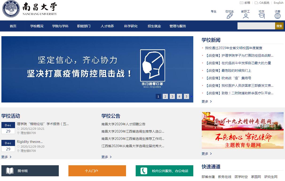 南昌大學是國家“雙一流”計劃世界一流學科建設高校,是江西省唯一的國家“211工程”重點建設高校,是教育部與江西省部省合建高校,是江西省高水平大學整體建設高校。學校地處“英雄城”南昌市,擁有前湖、青山湖、東湖、鄱陽湖和撫州5個校區(qū),其中前湖主校區(qū)占地面積4520畝,校舍建筑面積130萬平方米。學校辦學始于1921年創(chuàng)辦的江西公立醫(yī)學專門學校和1940年創(chuàng)建的國立中正大學。1993年,江西大學與江西工業(yè)大學合并組建南昌大學,開創(chuàng)了全國高等教育體制改革的先河。2005年,南昌大學與江西醫(yī)學院合并組建新南昌大學,揭開了學校改革發(fā)展的嶄新一頁。黨和國家領導人、教育部和江西省委、省政府高度重視學校的建設與發(fā)展。2008年10月,習近平同志視察學校時深情寄語“南昌大學前景無限”。2016年2月,習近平總書記再次親臨學校視察,就高校科研創(chuàng)新和人才培養(yǎng)發(fā)表重要講話,并勉勵學校走創(chuàng)新發(fā)展之路,希望當代大學生珍惜韶華,用青春鋪路,讓理想延伸。學校現(xiàn)設有人文社科學部、理工學部和醫(yī)學部,擁有12個學科門類的100多個本科專業(yè),3個國家重點(培育)學科, 15個博士學位授權一級學科, 46個碩士學位授權一級學科,1種博士專業(yè)學位授權和23種碩士專業(yè)學位授權(其中工程碩士有20個領域),11個博士后科研流動站。學校設有5所附屬醫(yī)院,共有9個國家臨床重點專科。學校的化學、臨床醫(yī)學、農(nóng)業(yè)科學、工程學、材料科學學科進入ESI世界排名前1%,其中農(nóng)業(yè)科學(食品科學與工程為主)、臨床醫(yī)學學科進入ESI世界排名前5‰。在全國第四輪學科整體水平評估中,食品科學與工程學科位列第3名。學校本部現(xiàn)有教職工4481人(其中專任教師2597人,正副教授1429人),其中“雙聘”院士4人,國家“973計劃”首席科學家2人,國家“千人計劃”創(chuàng)新項目入選者5人、“青年千人計劃”入選者4人,國家“萬人計劃”領軍人才8人、青年拔尖人才1人,國家“杰出青年科學基金”獲得者4人、“優(yōu)秀青年科學基金”獲得者2人,“長江學者”特聘教授5人,中科院“百人計劃”人選2人,全國優(yōu)秀博士學位論文指導教師1人,國家“百千萬人才工程”16人,國際食品科學院院士1人,國務院學位委員會學科評議組成員1人,教育部科學技術委員會學部委員2人,國家科技部領軍人才3人,教育部“新(跨)世紀優(yōu)秀人才支持計劃”12人。學校涌現(xiàn)了國際護理界最高榮譽獎“南丁格爾獎章”獲得者鄒德鳳、全國優(yōu)秀共產(chǎn)黨員江風益等一批崇尚師德、愛崗敬業(yè)的典型。學校本部現(xiàn)有全日制本科學生35660人,各類研究生14864人,國(境)外學生963人。學校積極探索拔尖創(chuàng)新人才培養(yǎng)新模式,成立了“際鑾書院”,推行跨學科、跨學院培養(yǎng)人才的改革。2014年,學校榮獲國家級教學成果二等獎3項。建校以來,學校共培養(yǎng)了40多萬優(yōu)秀人才,為國家和地方經(jīng)濟社會發(fā)展作出了重要貢獻。學校是教育部普通高校本科教學工作水平評估優(yōu)秀高校,順利接受本科教學工作審核評估,具備扎實的辦學基礎。現(xiàn)有1名國家教學名師,1個國家級教學團隊,1門國家級雙語教學示范課程,2門國家級精品課程,1門國家級英語授課品牌課程,4門國家級精品視頻公開課,2門國家級精品資源共享課,3門國家級精品在線開放課程,3個國家級專業(yè)綜合改革試點項目,9種“十二五”國家級規(guī)劃教材,9個國家級特色專業(yè),2個國家級虛擬仿真實驗教學中心,5個國家實驗教學示范中心,2個國家級大學生校外實踐教育基地,4個國家級工程實踐教育中心,14個本科國家級卓越人才教育培養(yǎng)計劃專業(yè)。學校是全國首批深化創(chuàng)新創(chuàng)業(yè)教育改革示范高校,是教育部中國教育和科研計算機網(wǎng)(CERNET)江西主節(jié)點單位,是江西唯一參與中國下一代互聯(lián)網(wǎng)示范工程CNGI建設的高校。學?,F(xiàn)有1個國家重點實驗室,1個國家工程技術研究中心,1個國家地方聯(lián)合工程研究中心,1個國家國際合作基地,1個教育部人文社會科學重點研究基地,1個全國紅色旅游創(chuàng)新發(fā)展研究基地,2個教育部重點實驗室,3個教育部工程研究中心,1個國家級大學科技園,9個江西省協(xié)同創(chuàng)新中心。2017年,學校獲批國家自然科學基金項目273項,直接經(jīng)費首次突破1億元,立項數(shù)位列全國第22位,獲批國家社會科學基金項目24項,其中一次性中標國家社科基金重大項目3項,立項數(shù)并列全國高校第26位。學校協(xié)同創(chuàng)新能力不斷增強,取得了一批原創(chuàng)性、標志性、有特色的科研成果。江風益教授團隊“硅襯底高光效GaN基藍色發(fā)光二極管”項目摘得2015年度唯一國家技術發(fā)明一等獎,這是自國家科學技術獎設立以來,首次由地方高校獲得的一等獎,正助推江西打造“南昌光谷”。學校高水平科研論文取得突破,先后在Science、Nature子刊和Cell Stem Cell上發(fā)表。學校還與政府、企事業(yè)單位開展全方位、多層次合作,促進科技成果轉化,推進政產(chǎn)學研用緊密結合。學校重視國際化辦學,先后與30多個國家(地區(qū))的100余所高校、科研機構建立了穩(wěn)定的交流與合作關系。在法國普瓦