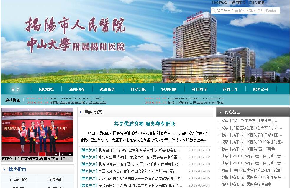 揭陽市人民醫(yī)院是一所集醫(yī)療、教學(xué)、科研、保健、康復(fù)、急救于一體的三級(jí)甲等綜合醫(yī)院,前身是1890年由美國醫(yī)生蘇阿拿創(chuàng)建的教會(huì)醫(yī)院--真理醫(yī)館,至今已經(jīng)歷了128個(gè)春秋,先后易名為“真理醫(yī)院”、“揭陽縣人民醫(yī)院”、“揭陽市人民醫(yī)院”。2013年10月成為中山大學(xué)非直屬附屬醫(yī)院。2014年9月成為粵東五市3個(gè)國家首批住院醫(yī)師規(guī)范化培訓(xùn)基地之一,設(shè)置20個(gè)專業(yè)基地,普寧市人民醫(yī)院、普寧華僑醫(yī)院、潮州市人民醫(yī)院為協(xié)同醫(yī)院。醫(yī)院位于榕江北河之濱,坐落在揭陽市區(qū)天福路,環(huán)境優(yōu)美,布局合理,占地面積近5萬平方米,業(yè)務(wù)用房建筑面積7.7萬平方米?,F(xiàn)有在職職工1780人,高級(jí)職稱231人,其中正高級(jí)職稱63人。享受國務(wù)院特殊津貼專家8人,獲中國醫(yī)師獎(jiǎng)1人、全國衛(wèi)生系統(tǒng)先進(jìn)工作者榮譽(yù)稱號(hào)2人、全國先進(jìn)工作者榮譽(yù)稱號(hào)1人、南粵先鋒優(yōu)秀共產(chǎn)黨員稱號(hào)1人,獲“廣東好人”稱號(hào)2人,獲潮汕星河科技獎(jiǎng)7人,市優(yōu)秀專家和拔尖人才21人,另有1人當(dāng)選為廣東省第十二次黨代會(huì)代表。近年來,先后引進(jìn)了博士、碩士研究生100多名。開放床位2379張,共有51個(gè)臨床和醫(yī)技科室。配套有西門子Force開源CT,西門子第三代光子雙源CT,美國瓦里安Trilogy直線加速器、Clinic IX直線加速器,3.0T核磁共振(2部),飛利浦FD20大平板血管造影機(jī)(DSA)等。飛利浦第三代“TOF”技術(shù)高性能64排PET-CT于2017年10月15日投入使用,同時(shí)設(shè)立潮汕派特CT中心,合作對(duì)象包括汕頭、潮州、揭陽三市8家三級(jí)醫(yī)院。醫(yī)院學(xué)科設(shè)置齊全,專科發(fā)展均衡,擁有廣東省醫(yī)學(xué)特色專科腫瘤科以及重癥醫(yī)學(xué)科、神經(jīng)內(nèi)科、普通外科、胸外科、兒科5個(gè)省級(jí)臨床重點(diǎn)??坪拖瘍?nèi)科、腫瘤科2個(gè)省重點(diǎn)扶持建設(shè)臨床??啤M瑫r(shí),打造了腫瘤防治中心,分子診斷中心&數(shù)字病理國際遠(yuǎn)程會(huì)診中心,重癥孕產(chǎn)婦急救中心,危重新生兒救治中心,影像中心,血透中心,健康管理中心,內(nèi)鏡中心和婦科、胃腸、肝膽等9個(gè)專業(yè)組成的腔鏡診療中心等多個(gè)粵東一流的醫(yī)療中心。2018年,醫(yī)院順利通過“國家胸痛中心”和“中國綜合卒中中心”認(rèn)證,成為粵東地區(qū)唯一“雙中心”均獲得國家認(rèn)證的醫(yī)療機(jī)構(gòu),心腦血管疾病學(xué)科建設(shè)進(jìn)入國家先進(jìn)行列;同時(shí),藥品臨床試驗(yàn)機(jī)構(gòu)通過國家GCP認(rèn)證,成為國家藥物臨床試驗(yàn)新基地,醫(yī)院逐步從單純的“臨床醫(yī)療型”向“科研教學(xué)型”轉(zhuǎn)變,為醫(yī)院的可持續(xù)發(fā)展奠定了良好的基礎(chǔ)。近年來,醫(yī)院著力推進(jìn)各項(xiàng)技術(shù)發(fā)展,打造一批粵東地區(qū)優(yōu)勢???,推進(jìn)醫(yī)療業(yè)務(wù)持續(xù)快速發(fā)展。現(xiàn)有婦科、胃腸、肝膽、胸外、關(guān)節(jié)、脊柱、泌尿、神經(jīng)外科、耳鼻喉科等9個(gè)專業(yè)開展腔鏡技術(shù),腔鏡手術(shù)率達(dá)50%以上,其中婦科腔鏡率達(dá)80%以上,還開展了粵東首例小兒婦科腹腔鏡手術(shù),技術(shù)水平粵東領(lǐng)先、國內(nèi)先進(jìn);內(nèi)鏡診療水平發(fā)展迅猛,率先在我市開展了成人、小兒呼吸內(nèi)鏡介入診療技術(shù)和神經(jīng)內(nèi)鏡、消化內(nèi)鏡微創(chuàng)技術(shù),消化內(nèi)科ERCP微創(chuàng)治療膽總管結(jié)石術(shù)2017年完成395例,手術(shù)量及技術(shù)水平均為粵東第一,完成膠囊內(nèi)鏡401例,排名全省第二;此外,心臟冠脈介入支架植入技術(shù)水平不斷提高,急性心?;颊咴谠核劳雎蕪?006年開展首例冠脈介入技術(shù)前的11.6%降至目前的0.4%,下降28倍。同時(shí),粵東首例心血管介入“雜交手術(shù)”,以及主動(dòng)脈支架置入、缺血性腦血管病支架置入、顱內(nèi)動(dòng)脈瘤介入栓塞術(shù)、椎間孔鏡下椎間盤髓核摘除術(shù)、三叉神經(jīng)痛微血管減壓術(shù)、靜脈曲張Trivex旋切術(shù)等先進(jìn)技術(shù)順利開展;成功救治24周6天、0.8公斤超低胎齡極低體重早產(chǎn)患兒和揭陽市首例重癥H7N9禽流感患者。此外,2015年8月始,婦科主任江少如聯(lián)合導(dǎo)師中山大學(xué)附屬第一醫(yī)院姚書忠教授,開展了國內(nèi)最先進(jìn)的腹腔鏡下宮頸環(huán)扎術(shù)治療復(fù)發(fā)性流產(chǎn),為來自新加坡、西班牙、印度等4個(gè)國家和北京、上海、內(nèi)蒙古、新疆、四川、浙江等20多個(gè)省份的宮頸機(jī)能不全患者實(shí)施手術(shù),幫助這些患者順利誕下健康足月小孩,取得良好的社會(huì)效益和醫(yī)療效益,備受贊譽(yù)。2013年3月起,中山大學(xué)腫瘤防治中心與醫(yī)院結(jié)成對(duì)口幫扶關(guān)系,共同打造粵東一流的腫瘤防治中心。依托高精的現(xiàn)代診療設(shè)備和專業(yè)的醫(yī)療團(tuán)隊(duì),醫(yī)院開展了分子診斷/分子病理聯(lián)合檢測、生物治療、影像向?qū)履[瘤射頻消融治療、精準(zhǔn)放療、腫瘤根治等一項(xiàng)項(xiàng)腫瘤治療技術(shù),為人