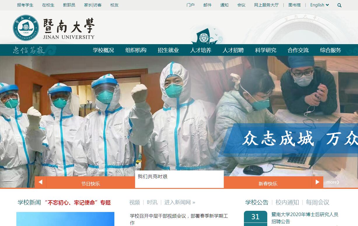 暨南大學(xué)是中國第一所由政府創(chuàng)辦的華僑學(xué)府,是國務(wù)院僑辦、教育部、廣東省共建的“211工程”重點綜合性大學(xué),直屬國務(wù)院僑辦領(lǐng)導(dǎo)?!棒吣稀倍殖鲎浴渡袝び碡暋罚骸皷|漸于海,西被于流沙,朔南暨,聲教訖于四海?!币饧疵嫦蚰涎?,將中華文化遠(yuǎn)播到五洲四海。學(xué)校的前身是1906年清政府創(chuàng)立于南京的暨南學(xué)堂。后遷至上海,1927年更名為國立暨南大學(xué)。抗日戰(zhàn)爭期間,遷址福建建陽。1946年遷回上海,1949年8月合并于復(fù)旦大學(xué)、交通大學(xué)等高校。新中國成立后,暨南大學(xué)于1958年在廣州重建,“文革”期間一度停辦,1978年在廣州復(fù)辦。改革開放后,學(xué)校快速發(fā)展。1996年6月,暨南大學(xué)成為全國面向21世紀(jì)重點建設(shè)的大學(xué)。2011年4月,國務(wù)院僑辦、教育部、廣東省政府簽署共建暨南大學(xué)協(xié)議。2015年6月,學(xué)校入選廣東省高水平大學(xué)重點建設(shè)高校。2017年9月,學(xué)校入選國家“雙一流”建設(shè)高校。素有“華僑最高學(xué)府”之稱的暨南大學(xué),恪守“忠信篤敬”之校訓(xùn),注重以中華民族優(yōu)秀的傳統(tǒng)道德文化培養(yǎng)造就人才。學(xué)校積極貫徹“面向海外,面向港澳臺”的辦學(xué)方針,建校至今,共培養(yǎng)了來自世界五大洲170多個國家和港澳臺地區(qū)的各類人才30余萬人,堪稱桃李滿天下。作為中國歷史最悠久的大學(xué)之一,暨南大學(xué)在中國高等教育史上有著重要地位:第一所由國家創(chuàng)辦的華僑高等學(xué)府,校名一直沿用的百年名校之一,全國首批試行學(xué)分制的高校,最早在綜合性大學(xué)里開辦醫(yī)學(xué)院的大學(xué),最早設(shè)立華僑華人問題研究機(jī)構(gòu)的大學(xué),最早創(chuàng)設(shè)商科的大學(xué)……目前,學(xué)校學(xué)科齊全,文理工醫(yī)兼?zhèn)洌O(shè)有36個學(xué)院,有62個系,17個直屬研究院(所);有本科專業(yè)94個,碩士學(xué)位授權(quán)一級學(xué)科點41個,博士學(xué)位授權(quán)一級學(xué)科點23個,專業(yè)學(xué)位授權(quán)類別27種;有博士后流動站16個,博士后科研工作站1個。近年來,在師生的努力下,學(xué)校學(xué)科建設(shè)和實力明顯提升。目前,學(xué)校有國家二級重點學(xué)科4個、國務(wù)院僑辦重點學(xué)科8個、國家中醫(yī)藥管理局重點學(xué)科2個、廣東省一級學(xué)科重點學(xué)科21個、廣東省二級學(xué)科重點學(xué)科4個。學(xué)校的工程學(xué)、化學(xué)、臨床醫(yī)學(xué)、藥理與毒理學(xué)、材料科學(xué)、生物學(xué)與生物化學(xué)、農(nóng)業(yè)科學(xué)、環(huán)境/生態(tài)學(xué)8個學(xué)科進(jìn)入ESI世界排名前1%。2013年1月教育部公布的全國高校學(xué)科評估排名中,我校7個一級學(xué)科上榜,其中應(yīng)用經(jīng)濟(jì)學(xué)、新聞傳播學(xué)、中藥學(xué)并列全國第五,中國語言文學(xué)、統(tǒng)計學(xué)并列全國第八,基礎(chǔ)醫(yī)學(xué)列第十一,光學(xué)工程列第十四。學(xué)校師資力量雄厚,結(jié)構(gòu)優(yōu)化,有專任教師2148人,其中中國科學(xué)院院士2人,中國工程院院士5人,長江學(xué)者(含特聘、講座、青年長江)21人,千人計劃入選者(含青年千人)25人,杰青、優(yōu)青獲得者33人,“珠江學(xué)者”36人,正高級職稱601人,副高級職稱839人,博士生導(dǎo)師623人,碩士生導(dǎo)師1270人。學(xué)校的辦學(xué)影響日益擴(kuò)大,面向全國31個省(市、自治區(qū))招生,已經(jīng)成為海外華裔及港澳臺地區(qū)學(xué)生報考深造首選的熱門高校,也是國內(nèi)規(guī)模最大的港澳臺僑高素質(zhì)人才培養(yǎng)基地。學(xué)校有國家級特色專業(yè)8個,國家級人才培養(yǎng)模式創(chuàng)新實驗區(qū)1個,國家級專業(yè)綜合改革試點2項,國家級實驗教學(xué)示范中心3個,國家級大學(xué)生校外實踐教育基地3個,國家級精品在線開放課程2門,國家級精品課程(含雙語教學(xué)示范課程)8門,國家級精品視頻公開課5門,國家級精品資源共享課5門,教育部來華留學(xué)英語授課品牌課程4門,是國家大學(xué)生文化素質(zhì)教育基地、國家對外漢語教學(xué)基地、國務(wù)院僑辦華文教育基地。學(xué)校目前有全日制學(xué)生36222人,其中本科生25862人,研究生10360人,來自114個不同國家和地區(qū)在校華僑、港澳臺和外國留學(xué)生11745人。學(xué)校校園文化豐富多彩,社團(tuán)活動精彩紛呈,創(chuàng)新創(chuàng)業(yè)氛圍濃厚,學(xué)生在“挑戰(zhàn)杯”、全國大學(xué)生創(chuàng)業(yè)大賽、全國大運會等多種國內(nèi)外文體藝等賽事中屢創(chuàng)佳績,暨南健兒蘇炳添、陳艾森等在奧運會等重大國際賽事上為國爭光,令國人振奮。學(xué)校入選全國首批深化創(chuàng)新創(chuàng)業(yè)教育改革示范高校。暨大畢業(yè)生深受海內(nèi)外用人單位好評,就業(yè)率一直位居同類院校前列。學(xué)??蒲袑嵙χ鸩皆鰪?qiáng),現(xiàn)設(shè)有國家部省級科研平臺83個??蒲谐晒T果累累,學(xué)校近年獲得國家科技進(jìn)步獎3項,國家技術(shù)發(fā)明獎1項,國際科技合作獎1項,國家自然科學(xué)基金項目立項數(shù)、SCI等權(quán)威索引收錄的國際論文數(shù)量持續(xù)增長;2011-2017年,學(xué)校共獲批國家社科