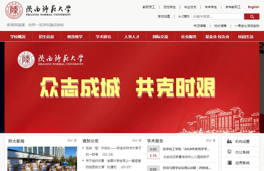 陜西師范大學(xué)是教育部直屬、世界一流學(xué)科建設(shè)高校,國家“211 工程”重點建設(shè)大學(xué),國家教師教育“985工程優(yōu)勢學(xué)科創(chuàng)新平臺”建設(shè)高校,是國家培養(yǎng)高等院校、中等學(xué)校師資和教育管理干部以及其他高級專門人才的重要基地,被譽為“教師的搖籃 ”。學(xué)校前身是1944年成立的陜西省立師范??茖W(xué)校,1954年更名為西安師范學(xué)院,1960年與陜西師范學(xué)院合并,定名為陜西師范大學(xué),1978年劃歸教育部直屬。建校70多年來,學(xué)校秉承“厚德、積學(xué)、勵志、敦行”的優(yōu)良傳統(tǒng),立足西部,面向全國,已發(fā)展成為一所有重要影響的綜合性一流師范大學(xué),為國家培養(yǎng)各類畢業(yè)生30余萬人,形成了“抱道不曲、擁書自雄”的學(xué)風(fēng)和“淳厚博雅、知行合一”的校風(fēng)?,F(xiàn)任黨委書記程光旭教授,校長游旭群教授。學(xué)校位于世界四大歷史文化名城之一的古都西安,占地面積2800畝,建有長安、雁塔兩個校區(qū)。長安校區(qū)從2000年開始建設(shè),目前已成為學(xué)校的主校區(qū),主要承擔(dān)本科三、四年級和研究生的教育培養(yǎng)任務(wù);雁塔校區(qū)已有六十多年的歷史,目前主要承擔(dān)本科一、二年級基礎(chǔ)課和通識課教學(xué)以及教師教育、繼續(xù)教育、遠(yuǎn)程教育、教師干部培訓(xùn)以及留學(xué)生教育等任務(wù)。雁塔校區(qū)古樸典雅、鐘靈毓秀,長安校區(qū)現(xiàn)代開放、氣勢恢宏。學(xué)校先后被教育部、陜西省人民政府授予“文明校園”稱號。學(xué)校設(shè)有研究生院和21個學(xué)院、1個基礎(chǔ)實驗教學(xué)中心及民族教育學(xué)院(預(yù)科教育),有65個本科專業(yè),18個博士學(xué)位授權(quán)一級學(xué)科,41個碩士學(xué)位授權(quán)一級學(xué)科,1個博士專業(yè)學(xué)位授權(quán)點(教育博士),24個碩士專業(yè)學(xué)位授權(quán)點(含工程碩士9個領(lǐng)域)。有國家重點學(xué)科4個,4篇博士論文入選全國百篇優(yōu)秀博士論文,7篇博士論文入選全國優(yōu)秀博士學(xué)位論文提名論文,68篇博士論文獲得陜西省優(yōu)秀博士論文稱號,16篇碩士論文獲全國優(yōu)秀教育碩士專業(yè)學(xué)位論文;有國家基礎(chǔ)學(xué)科人才培養(yǎng)和科學(xué)研究基地2個,教育部高等學(xué)校學(xué)科創(chuàng)新引智基地3個,國家工程實驗室1個,國家級實驗教學(xué)示范中心4個,國家級虛擬仿真實驗教學(xué)中心3個,教育部人文社會科學(xué)研究基地1個,教育部國別和區(qū)域研究中心4個,國家體育總局體育社會學(xué)重點研究基地1個,全國教育碩士專業(yè)學(xué)位研究生聯(lián)合培養(yǎng)示范基地1個,教育部重點實驗室和工程研究中心4個,陜西省重點實驗室和工程研究中心 17個,陜西省人文社會科學(xué)重點研究基地5個,陜西省哲學(xué)社會科學(xué)重點研究基地1個,中國特色社會主義理論體系研究中心1個,重點輿情信息研究中心1個,陜西省實驗教學(xué)示范中心12個,陜西省研究生聯(lián)合培養(yǎng)示范工作站5個,各類研究中心(所)60個。學(xué)校設(shè)有遠(yuǎn)程教育學(xué)院、教師干部教育學(xué)院等辦學(xué)機構(gòu),此外,還設(shè)有教育部西北高師師資培訓(xùn)中心、教育部西北教育管理干部培訓(xùn)中心、教育部基礎(chǔ)教育課程研究中心、陜西省基礎(chǔ)教育資源研發(fā)中心、陜西省教師教育指導(dǎo)中心和陜西省干部教育培訓(xùn)基地,以及中國唐史學(xué)會、中國古都學(xué)會等幾十個學(xué)術(shù)團體和學(xué)術(shù)機構(gòu)。學(xué)?,F(xiàn)有教師1752人,具有博士、碩士學(xué)位的教師占教師總數(shù)的91%,其中具有博士學(xué)位的71%。教師中有教授475人,副教授696人。雙聘院士5人,國家有突出貢獻(xiàn)中青年專家4人,國家“萬人計劃”哲學(xué)社會科學(xué)領(lǐng)軍人才3人,科技創(chuàng)新領(lǐng)軍人才1人,國家“千人計劃”特聘教授1人, “長江學(xué)者獎勵計劃”特聘教授、講座教授13人,國家百千萬人才工程入選者6人、國家杰出青年科學(xué)基金獲得者3人,國家級教學(xué)名師2人,國家“萬人計劃”青年拔尖人才2人,國家“千人計劃”青年人才5人,國家優(yōu)秀青年科學(xué)基金獲得者3人,全國、全省宣傳文化系統(tǒng)“四個一批”人才入選者7人,“新世紀(jì)優(yōu)秀人才支持計劃”入選者40人,陜西省“百人計劃”特聘專家38人(含短期項目1人),陜西省“百人計劃”青年項目入選者8人,陜西省“三秦學(xué)者”1人,陜西省有突出貢獻(xiàn)專家、陜西省“三五”人才、省重點領(lǐng)域頂尖人才、陜西省中青年科技創(chuàng)新領(lǐng)軍人才、省級教學(xué)名師等人才計劃入選者44人,陜西省科技新星、陜西高校人文社會科學(xué)青年英才支持計劃、陜西省百名青年文學(xué)藝術(shù)家扶持計劃等人才計劃入選者35人。學(xué)?,F(xiàn)有全日制本科生 17502人,研究生 17343人(其中全日制學(xué)生8341人,非全日制學(xué)生9002人),繼續(xù)教育和網(wǎng)絡(luò)教育學(xué)生66034人,外國留學(xué)生1100 余人。長期以來,學(xué)校以質(zhì)量為生命線,狠抓教學(xué)管理和改革,取得顯著成效。近年來,共獲國家級教學(xué)成果獎8項,省級教學(xué)成果獎100項;11個專業(yè)被評