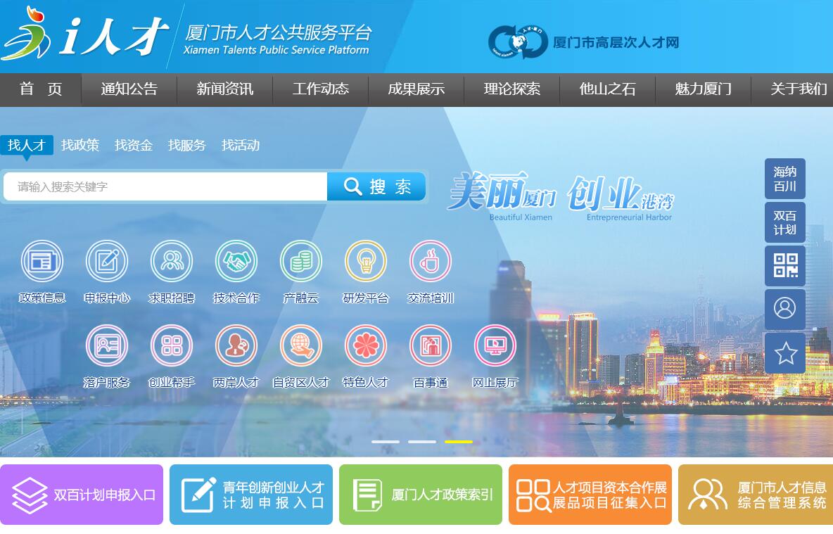 "i人才——廈門市人才公共服務平臺“針對人才來廈創(chuàng)業(yè)、工作和生活等各領域的有關需求,集聚和整合我市涉及人才服務的各類公共服務及優(yōu)質社會服務資源,為人才提供資訊獲取、政策查詢、項目申報、求職招聘、創(chuàng)業(yè)輔導、技術合作、投融資、交流培訓等多功能、全方位、專業(yè)化的“一站式”服務。廈門市認真貫徹落實國家“千人計劃”和福建省引才計劃精神,于2010年4月制定出臺《廈門市引進海外高層次人才暫行辦法》和《關于加快建設海西人才創(chuàng)業(yè)港,大力引進領軍型創(chuàng)業(yè)人才的實施意見》兩個政策文件,計劃用5-10年引進100名海外高層次人才和300名領軍型創(chuàng)業(yè)人才(簡稱“雙百計劃”),市財政每年安排1.5億元專項資金用于“雙百計劃”。為了開展好這項工作,廈門市成立了高層次人才引進專項小組,負責“雙百計劃”的組織領導和統(tǒng)籌協調。專項小組成員單位中,市公務員局和科技局負責人才項目的申報評審,市投促局負責人才項目對接,市財政局負責人才工作專項資金的管理使用。專項小組下設辦公室,作為日常辦事機構。