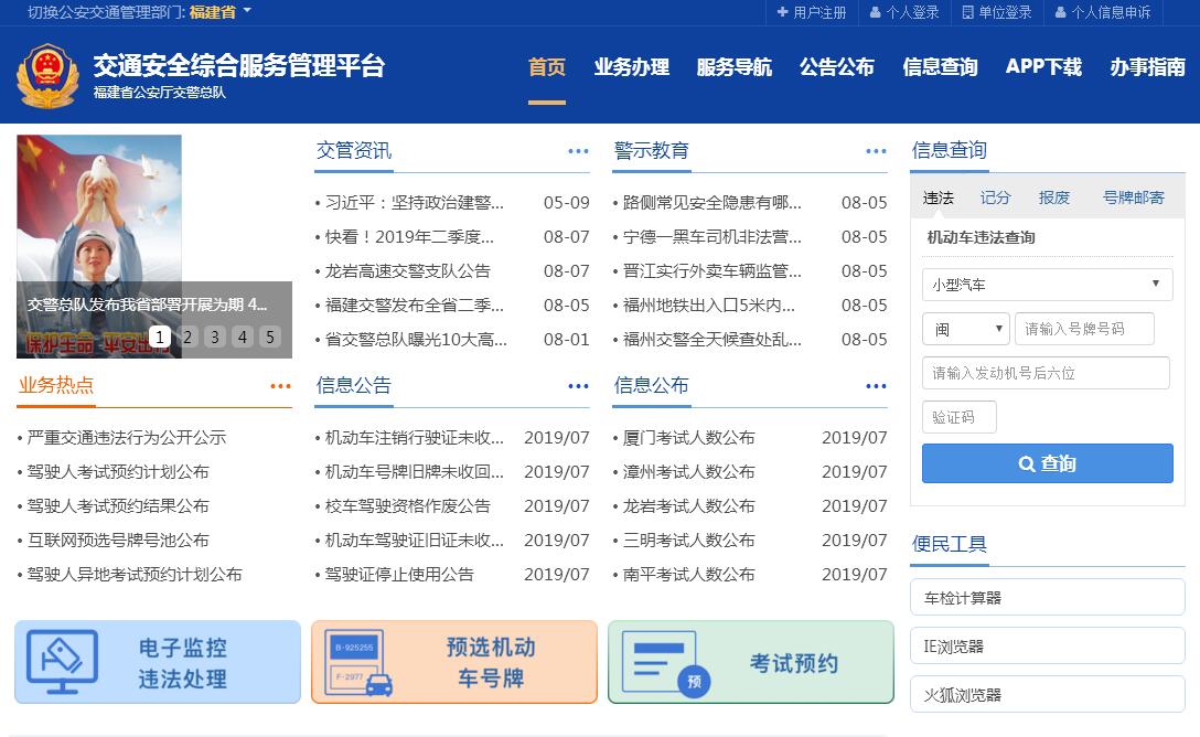 福建省公安廳交警總隊(duì)互聯(lián)網(wǎng)交通安全服務(wù)管理平臺(tái)是福建省公安廳交警總隊(duì)為更好地滿足人民群眾需求,加強(qiáng)社會(huì)管理,提升公安交通管理便民、利民、惠民 水平,建立的官方交通安全綜合服務(wù)管理平臺(tái)。主要提供電子監(jiān)控處理,繳納罰款,駕駛?cè)丝荚囶A(yù)約,期滿換證,超齡換證,損毀換證,遺失補(bǔ)證,延期換證,延期審驗(yàn),延期提交體檢證明,駕駛證變更聯(lián)系方式,預(yù)選機(jī)動(dòng)車號(hào)牌,補(bǔ)換領(lǐng)號(hào)牌,補(bǔ)換領(lǐng)行駛證,補(bǔ)領(lǐng)檢驗(yàn)合格標(biāo)志,機(jī)動(dòng)車檢驗(yàn)預(yù)約,機(jī)動(dòng)車變更聯(lián)系方式,機(jī)動(dòng)車業(yè)務(wù)公告及查詢,駕駛證業(yè)務(wù)公告/信息公布,駕駛證記分查詢,公告參數(shù)查詢,機(jī)動(dòng)車違法查詢,交管服務(wù)地圖,幫助中心,提供交通安全服務(wù),達(dá)到便民利民的目的。
