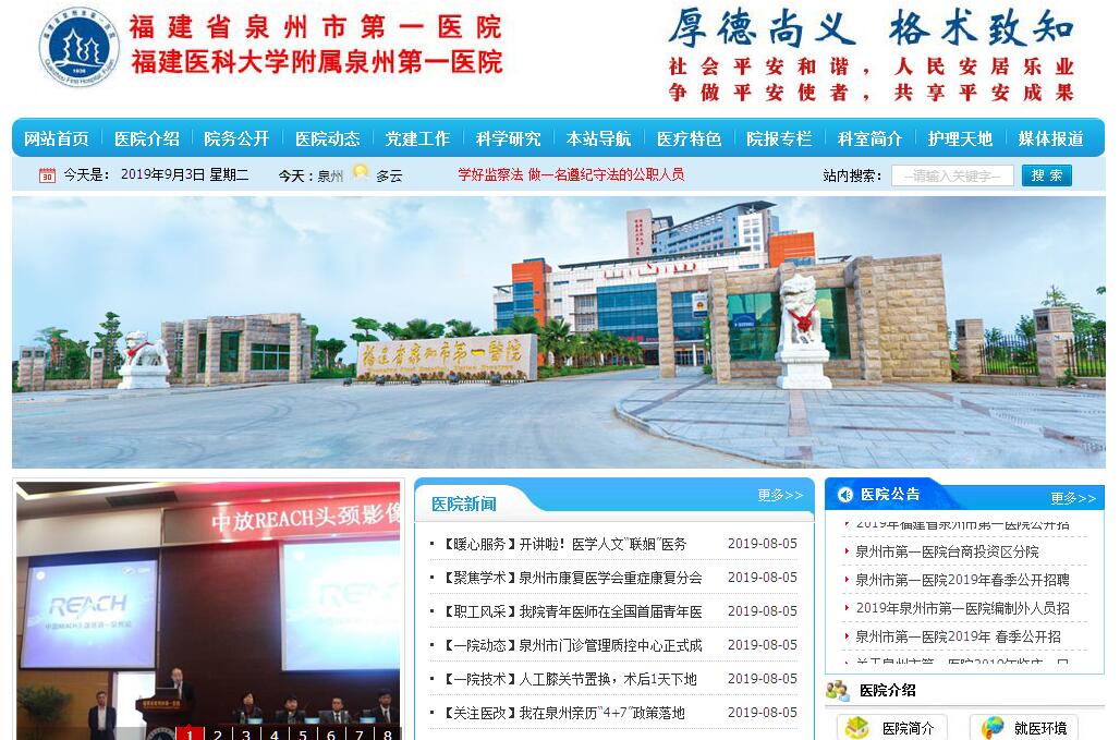 泉州市第一醫(yī)院(福建醫(yī)科大學(xué)附屬泉州第一醫(yī)院)創(chuàng)建于1936年,是一所融醫(yī)療、教學(xué)、科研和預(yù)防保健為一體的三級甲等綜合醫(yī)院?,F(xiàn)為及福建省南部省級區(qū)域醫(yī)療中心、國家住院醫(yī)師規(guī)范化培訓(xùn)基地、福建省住院醫(yī)師規(guī)范化培訓(xùn)基地、福建省??谱o(hù)士培訓(xùn)基地、福建高等醫(yī)學(xué)院校臨床教學(xué)基地、國家藥物臨床試驗(yàn)機(jī)構(gòu)。泉州市心血管病中心、泉州市腫瘤中心掛靠我院。中國胸痛中心、國家衛(wèi)計(jì)委高級卒中中心和支架人生俱樂部成員單位。福建省兒童醫(yī)療救治泉州分中心、福建省新生兒救護(hù)網(wǎng)絡(luò)泉州分中心。醫(yī)院開放床位2106張(東街院區(qū)1069張,城東院區(qū)1037張),51個病區(qū)(東街院區(qū)22個病區(qū),城東院區(qū)29病區(qū))。設(shè)有42個臨床科室,其中一級???0個,二級???2個,12個醫(yī)技科室和17個職能科室。2017年門診病人179萬人次,出院病人8.78萬人次。員工3029人,其中高級職稱人員385人,中級職稱827人;博士、碩士471人;國家級學(xué)術(shù)團(tuán)體常委、委員18人,省級學(xué)術(shù)團(tuán)體常委、副主委、主委60人。感染病科、血液內(nèi)科、心血管內(nèi)科、神經(jīng)內(nèi)科、麻醉科為省級臨床重點(diǎn)???;感染病科、血液內(nèi)科、心血管內(nèi)科、神經(jīng)內(nèi)科、檢驗(yàn)科、肝膽外科、胸外科、心臟外科為泉州市重點(diǎn)學(xué)科。腎內(nèi)科、呼吸內(nèi)科、神經(jīng)外科、普通外科、心血管外科、泌尿外科、婦產(chǎn)科、兒科、麻醉科、檢驗(yàn)科、重癥醫(yī)學(xué)科等多個學(xué)科具有較強(qiáng)的技術(shù)力量,配套有ICU、CCU、PICU、NICU、CSICU等重癥監(jiān)護(hù)病房。心血管病、感染性疾病學(xué)科群建設(shè)優(yōu)勢明顯,年心臟介入手術(shù)量和心臟外科手術(shù)量均居全省第4位;感染病診治平臺實(shí)力雄厚、功能齊全,居省內(nèi)前列。醫(yī)院是我省主要的醫(yī)學(xué)人才培養(yǎng)基地和醫(yī)學(xué)科研中心,是福建醫(yī)科大學(xué)、福建中醫(yī)藥大學(xué)內(nèi)科學(xué)、外科學(xué)、神經(jīng)病學(xué)、醫(yī)學(xué)檢驗(yàn)等12個專業(yè)博士、碩士學(xué)位授予點(diǎn)。近4年來培養(yǎng)碩(博)士61人、本科生180人、規(guī)培醫(yī)生170人及1000多位實(shí)習(xí)、進(jìn)修生;中標(biāo)科研項(xiàng)目144項(xiàng),其中國家級科研項(xiàng)目5項(xiàng),省級科研項(xiàng)目43項(xiàng),市級科研項(xiàng)目104項(xiàng);發(fā)表論文1197篇,其中SCI論文80篇。近年來,醫(yī)院加強(qiáng)管理,先后開展醫(yī)療質(zhì)量與安全專項(xiàng)整治、優(yōu)質(zhì)服務(wù)和作風(fēng)建設(shè)年等專項(xiàng)活動,進(jìn)一步優(yōu)化服務(wù)流程,改善就醫(yī)環(huán)境,提高醫(yī)療服務(wù)質(zhì)量,取得良好成效,在2016年福建省衛(wèi)計(jì)委對所轄二級以上醫(yī)院的群眾滿意度調(diào)查中名列綜合性醫(yī)院第17名。2014年、2015“中國地級城市醫(yī)院競爭力100強(qiáng)” 排名第51位,2015最佳互聯(lián)醫(yī)院中排名第44位。2016“中國地級城市醫(yī)院競爭力100強(qiáng)”排名第49位。2016“中國最佳互聯(lián)互通醫(yī)院100強(qiáng)”第43位,2016“福建省域醫(yī)院30強(qiáng)”第7位。2017“中國地級城市醫(yī)院競爭力100強(qiáng)” 排名第37位,2017“福建省域醫(yī)院30強(qiáng)”第6位。2017年11月3日,蘇智軍院長榮獲“第十屆華仁杯最具領(lǐng)導(dǎo)力中國醫(yī)院院長創(chuàng)新成就獎”。
