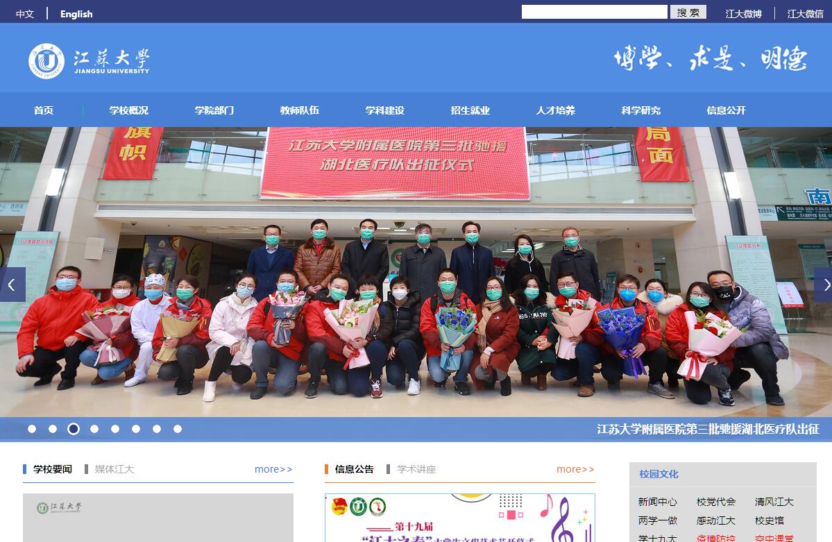 江蘇大學坐落在素有“天下第一江山”美譽的國家歷史文化名城——江蘇省鎮(zhèn)江市。學校是2001年8月經(jīng)教育部批準,由原江蘇理工大學、鎮(zhèn)江醫(yī)學院、鎮(zhèn)江師范專科學校合并組建的重點綜合性大學,是江蘇省人民政府和農(nóng)業(yè)農(nóng)村部共建高校、首批江蘇省高水平大學建設(shè)高校、全國本科教學工作水平優(yōu)秀高校、首批全國50所畢業(yè)生就業(yè)典型經(jīng)驗高校、全國創(chuàng)新創(chuàng)業(yè)典型經(jīng)驗高校和首批全國來華留學生質(zhì)量認證高校。學校具有百年辦學歷史,文化底蘊深厚。原江蘇理工大學的前身鎮(zhèn)江農(nóng)業(yè)機械學院,是為貫徹毛澤東同志關(guān)于“農(nóng)業(yè)的根本出路在于機械化”的重要指示,1960年由南京工學院(現(xiàn)東南大學)分設(shè)獨立建校的,辦學歷史可追溯到1902年劉坤一、張之洞等在南京創(chuàng)辦的三江師范學堂。學校作為國內(nèi)最早設(shè)立農(nóng)機專業(yè)、最早系統(tǒng)開展農(nóng)機教育的高校,堅持立足江蘇、服務(wù)行業(yè),始終以推動我國農(nóng)業(yè)機械化、現(xiàn)代化為使命,培養(yǎng)了我國第一批農(nóng)機本科、碩士和第一位農(nóng)機博士、博士后,為我國農(nóng)業(yè)裝備人才培養(yǎng)、科技創(chuàng)新,為推動農(nóng)民增收、農(nóng)業(yè)發(fā)展和農(nóng)村穩(wěn)定作出了積極的貢獻,形成了“工中有農(nóng),以工支農(nóng)”的鮮明辦學特色和獨特的文化情懷。學校辦學起點較高,綜合實力一直位居全國百強之列。早在1978年,學校就被國務(wù)院確定為全國88所重點大學之一,1981年成為全國首批具有博士、碩士、學士學位授予權(quán)的高校。近年來,學校聚焦內(nèi)涵發(fā)展,深入實施“高水平、有特色、國際化”發(fā)展戰(zhàn)略,國內(nèi)外辦學影響進一步擴大。THE、USNews、ARWU等國際權(quán)威世界大學排名,學校均躋身top1000。《2018中國大學評價》,學校綜合排名列全國第39位。學校辦學規(guī)模較大,辦學條件優(yōu)良。學科涵蓋工學、理學、醫(yī)學、管理學、經(jīng)濟學、哲學、法學、文學、教育學、歷史學、藝術(shù)學等11大學科門類。設(shè)有25個學院,89個本科專業(yè)。專任教師2550人(具有海外經(jīng)歷的比例達25%),集聚了一批以院士、“長江學者”、“千人計劃”、“國家杰青”、“萬人計劃”等為代表的高層次人才群體。在校生36000余人,其中全日制本科生23000余人,研究生12000余人,學歷留學生1800余人。江蘇大學京江學院全日制在校生近10000人。校園占地面積3000余畝,各類建筑面積120萬余平方米。教學科研儀器設(shè)備總值9.8億元。圖書館建筑面積5.1萬平方米,藏書305萬冊,訂閱各類數(shù)據(jù)庫113個,自建特色數(shù)據(jù)庫9個,建有教育部科技查新工作站和國際賽珍珠文獻資源中心。擁有一所集醫(yī)療、教育、科研、預防為一體的三級甲等附屬醫(yī)院。設(shè)有江蘇大學出版社和雜志社,出版圖書1500余種,辦有國際、國內(nèi)學術(shù)期刊11種,其中《江蘇大學學報》(自然科學版)、《排灌機械工程學報》、《高校教育管理》為全國中文核心期刊,《高校教育管理》、《江蘇大學學報》(社會科學版)分別為CSSCI來源期刊和擴展版來源期刊。學校辦學水平較高,擁有一批高水平學科。工程學、材料科學、臨床醫(yī)學、化學和農(nóng)業(yè)科學5個學科進入ESI排名全球前1%,ESI綜合排名列全國第56位。擁有2個國家重點學科,1個國家重點(培育)學科,6個江蘇高校優(yōu)勢學科,7個江蘇省“十三五”一級重點學科,2個江蘇省“十三五”一級重點(培育)學科。擁有14個一級學科博士點,44個一級學科碩士點,12個碩士專業(yè)學位類別,26個工程碩士授權(quán)領(lǐng)域。設(shè)有13個博士后科研流動站。學校堅持以學為中心、教為主體,不斷提升人才培養(yǎng)質(zhì)量。近年來,學校獲國家級教學成果獎5項,形成了一批以國家特色專業(yè)、國家級精品課程、國家精品視頻公開課、國家精品資源共享課、國家實驗教學示范中心、國家優(yōu)秀教學團隊為代表的優(yōu)質(zhì)教學資源;畢業(yè)生就業(yè)率一直保持在96%以上;學生在全國大學生重大賽事中表現(xiàn)搶眼,“挑戰(zhàn)杯”全國大學生課外學術(shù)科技作品競賽連續(xù)6屆喜捧“優(yōu)勝杯”,全國大學生創(chuàng)業(yè)計劃大賽連續(xù)4屆獲得雙金獎,校大學生男子排球隊屢獲全國冠軍,女子沙灘排球隊獲世界大學生運動會第7名,女子足球隊獲世界大學生“五人制”足球錦標賽季軍。學校堅持以貢獻謀發(fā)展,不斷提升科技創(chuàng)新與服務(wù)社會能力。“十三五”以來,學校獲批國家自然基金項目344項(連續(xù)5年居全國高校前50位),國家社科基金項目18項。截至目前,學校共獲得國家級科技成果獎13項、何梁何利基金科學與技術(shù)創(chuàng)新獎2項、國家杰出青年基金項目2項;擁有國家水泵及系統(tǒng)工程技術(shù)研究中心、混合動力車輛國家地方聯(lián)合工程中心、國家級新農(nóng)村發(fā)展研究院等一批國家級科技創(chuàng)新平臺;建有國家知識產(chǎn)權(quán)培訓(江蘇)基地。學校牽頭成立的現(xiàn)代農(nóng)業(yè)裝備與技術(shù)協(xié)同創(chuàng)新中心被認定為江蘇省首批高校協(xié)同創(chuàng)新中心。2015