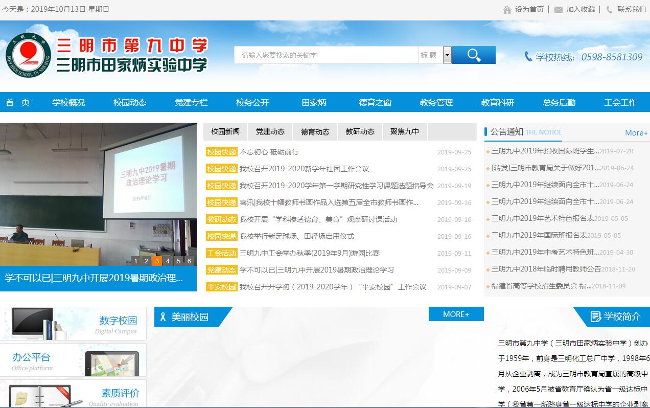 三明市第九中學(xué)(三明市田家炳實驗中學(xué))創(chuàng)辦于1959年,前身是三明化工總廠中學(xué),1998年6月從企業(yè)剝離,成為三明市教育局直屬的高級中學(xué),2006年5月被省教育廳確認(rèn)為省一級達(dá)標(biāo)中學(xué)(我省第一所躋身省一級達(dá)標(biāo)中學(xué)的企業(yè)剝離學(xué)校)。2006年11月由香港著名實業(yè)家田家炳先生慷慨捐資,經(jīng)市教育局同意,被命名為“三明市田家炳實驗中學(xué)”。學(xué)?,F(xiàn)有39個教學(xué)班,學(xué)生1900多人,教職工169名,特級教師2人,高級教師62人,省市學(xué)科帶頭人、教壇新秀、骨干教師27人。2018年3月,學(xué)校被確立為省首批示范高中建設(shè)學(xué)校。近年來,學(xué)校獲得了全國美術(shù)教育特色學(xué)校、全國學(xué)校藝術(shù)教育工作先進(jìn)單位、全國青少年普法教育先進(jìn)單位、省級文明學(xué)校、省五一勞動獎狀、省德育工作先進(jìn)學(xué)校、省中小學(xué)校藝術(shù)教育工作先進(jìn)集體、省中學(xué)示范圖書館、省依法治校示范學(xué)校、省現(xiàn)代教育技術(shù)實驗學(xué)校、省科技教育基地學(xué)校、省基礎(chǔ)教育學(xué)科(美術(shù))教學(xué)研究基地學(xué)校、省市學(xué)校特色發(fā)展項目試點校等多項榮譽(yù)。辦學(xué)特色鮮明。立足生源實際,因材施教,突出創(chuàng)建美術(shù)教育辦學(xué)特色,取得了一定的成效,每年都有近300名學(xué)生錄取到高校美術(shù)類本科專業(yè)學(xué)習(xí),為全國各大美院、高等院校輸送了一大批品學(xué)兼優(yōu)的美術(shù)類學(xué)生。連續(xù)七年,美術(shù)類學(xué)生專業(yè)、文化本科雙上線人數(shù)列全省高中校第一。宏志班成品牌。2002年7月以來,學(xué)校每年面向全市招收一個教學(xué)班的品學(xué)兼優(yōu)、家庭經(jīng)濟(jì)困難的宏志班學(xué)生,成立“宏志班獎學(xué)助學(xué)基金”,保證宏志班學(xué)生不因經(jīng)濟(jì)困難而輟學(xué)。以“特別有禮貌、特別有紀(jì)律、特別能吃苦、特別會感恩、特別有志氣、特別有作為”為班訓(xùn)的宏志班同學(xué)在校表現(xiàn)良好,學(xué)風(fēng)特別端正,成為全市學(xué)生的榜樣。已畢業(yè)的十屆宏志班學(xué)生高考本科上線率為100%,本一上線率達(dá)50%以上。校園活動豐富。學(xué)校十分注重學(xué)生的個性發(fā)展,積極開展豐富多彩的課余活動。學(xué)校建有動漫社、書法社、攝影社、意大利語社、模型社、科學(xué)制作社、科學(xué)dv社、花樣跳繩社、乒乓球社等30多個學(xué)生社團(tuán),將學(xué)生社團(tuán)活動納入學(xué)校的選修課程和校本課程體系中,社團(tuán)活動逐步課程化。辦學(xué)模式創(chuàng)新。作為北京外國語大學(xué)PASS留學(xué)基地分部,依托北京外國語大學(xué)特有的國際教育資源優(yōu)勢,與北京外國語大學(xué)合作舉辦國際課程班(面向全市初中畢業(yè)生招生)、留學(xué)意大利直通車課程班(面向高考后的高三畢業(yè)生)。2014年12月,首屆直通車課程班學(xué)生全部被意大利博洛尼亞大學(xué)、那不勒斯美術(shù)學(xué)院、比薩大學(xué)等高校錄取,并赴意大利留學(xué),成為我市高中首批國際留學(xué)生。教學(xué)質(zhì)量提升。面向全體學(xué)生,實施分層次教學(xué),推行“先學(xué)后研、五環(huán)導(dǎo)學(xué)”高效課堂教學(xué)模式,積極開展課題研究,開發(fā)校本課程,編寫校本教材,教學(xué)質(zhì)量顯著提高。近年來,高考成績穩(wěn)中有升,每年高考上線率均在99%以上,本科上線人數(shù)達(dá)500人以上,本科上線率達(dá)70%以上。學(xué)校堅持讓每一個學(xué)生走向成功的辦學(xué)理念,堅持嚴(yán)管理、重創(chuàng)新、求實效、出特色的辦學(xué)思路,堅持“三化”(教育教學(xué)管理規(guī)范化,辦學(xué)模式國際化,教育理念、教育設(shè)施、教育手段現(xiàn)代化)、“三特”(教師有特點、學(xué)生有特長、學(xué)校有特色)、“三名”(名教師、名學(xué)生、名學(xué)校)學(xué)校發(fā)展新時期的戰(zhàn)略定位。全體師生凝心聚力,正朝著創(chuàng)特色高中、建福建名校的目標(biāo)邁進(jìn)。