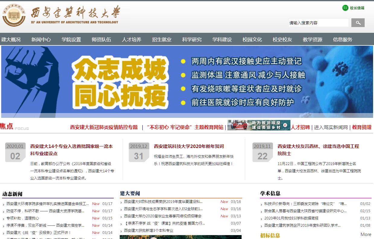 西安建筑科技大學坐落于歷史文化名城西安,現(xiàn)有雁塔、草堂兩個校區(qū)和一個科教產(chǎn)業(yè)園區(qū)。雁塔校區(qū)南眺馳名中外的唐代大雁塔,北臨舉世聞名的明代古城墻;草堂校區(qū)坐落在秦嶺北麓,毗鄰千年名剎草堂寺;華清科教產(chǎn)業(yè)園位于西安高新技術東開發(fā)區(qū)幸福林帶南段,東依景色怡人的浐灞生態(tài)園;兩校區(qū)和產(chǎn)業(yè)園區(qū)總占地4300余畝。學校辦學歷史悠久、底蘊深厚,最早可追溯到始建于1895年的北洋大學,1956年全國高等院校院系調整時,由原東北工學院、西北工學院、青島工學院和蘇南工業(yè)高等??茖W校的土木、建筑、市政系(科)整建制合并而成,積淀了我國近代高等教育史上最早的一批土木、建筑、市政類學科精華,時名西安建筑工程學院,是新中國西北地區(qū)第一所本科學制的建筑類高等學府,我國著名的土木、建筑“老八?!敝唬苯鸸I(yè)部直屬重點大學。1959年和1963年,學校先后易名為西安冶金學院、西安冶金建筑學院;1994年3月8日,經(jīng)原國家教委批準,更名為“西安建筑科技大學”。1998年,學校劃轉陜西省人民政府管理。現(xiàn)為“國家建設高水平大學項目”和“中西部高校基礎能力建設工程”實施院校、陜西省重點建設的高水平大學、陜西省和住房與城鄉(xiāng)建設部共建高校。經(jīng)過并校60年來的建設與發(fā)展,學校實力不斷增強,已經(jīng)成為一所以土木建筑、環(huán)境市政、材料冶金及其相關學科為特色,以工程技術學科為主體,工、管、藝、理、文、法、哲、經(jīng)、教等學科協(xié)調發(fā)展的多科性大學。學校被國際建筑師協(xié)會(UIA)授予"建筑教育特別貢獻獎",被國務院授予"全國就業(yè)先進工作單位",學校黨委被中共中央授予"全國先進基層黨組織"稱號。學校是國務院批準首批具有博士、碩士和學士學位授予權的單位。學校擁有原國家重點學科3個(結構工程、環(huán)境工程、建筑設計及其理論)。在2016年全國第四輪學科評估中,建筑學、城鄉(xiāng)規(guī)劃學、風景園林學、土木工程、環(huán)境科學與工程5個學科為B+(全國前20%);材料科學與工程為B(全國前30%);管理科學與工程為B-(全國前40%);2016年11月工程學進入ESI全球排名前1%。學校設有研究生院,現(xiàn)有一級學科博士點9個,博士后流動站7個,一級學科碩士點25個;具有10種類別的碩士專業(yè)學位授予權,其中工程碩士擁有16個授權領域。博士點涉及工學、管理學2個學科門類,碩士點涉及工學、管理學、藝術學、理學、法學、哲學、教育學等7個學科門類,基本涵蓋學校所有本科專業(yè)。學?,F(xiàn)有17個學院,63個本科專業(yè)面向全國第一批招生,有權招收保送生,實行本碩連讀。建筑學、城鄉(xiāng)規(guī)劃和風景園林、歷史建筑保護工程四個專業(yè)為五年學制,其它本科專業(yè)均為四年制。建筑學、城鄉(xiāng)規(guī)劃、土木工程、環(huán)境工程、建筑環(huán)境與能源應用工程、工程管理、材料科學與工程、給水排水工程、環(huán)境設計等9個專業(yè)為國家級特色專業(yè),15個專業(yè)為省級特色專業(yè)。建筑學等21個本科專業(yè)獲準陜西高?!耙涣鲗I(yè)”建設。建筑學、土木工程、工程管理、城鄉(xiāng)規(guī)劃、建筑環(huán)境與能源應用工程、給排水科學與工程、環(huán)境工程、材料科學與工程、冶金工程等9個本科專業(yè)相繼通過教育部專業(yè)評估或工程教育專業(yè)認證。學校擁有省部共建國家重點實驗室——西部綠色建筑國家重點實驗室,國家國際科技合作基地、國家級成果研究推廣中心、地方聯(lián)合工程研究中心、(虛擬仿真)實驗教學示范中心等7個,3個甲級資質設計研究院。陜西省依托學校成立了"陜西循環(huán)經(jīng)濟工程技術院"、“陜西省新型城鎮(zhèn)化和人居環(huán)境研究院”、“陜西省膜分離技術研究院”。學?,F(xiàn)有在校學生34000余人,其中全日制本科生19000余人,研究生5600余人,留學生近70人;繼續(xù)教育學院在冊學生9500余人。學?,F(xiàn)有教職工2800余名,其中專任教師1700余名,具有高級職稱者1000余人;擁有在職中國工程院院士2名、雙聘院士5名,國家教學名師、全國師德標兵1名、全國優(yōu)秀教師4名、全國模范教師2名、全國優(yōu)秀教育工作者1名、全國先進工作者1名、全國杰出專業(yè)技術人才1名、全國“五一”勞動獎章獲得者1名、“長江學者獎勵計劃”特聘教授1名,國家杰出青年基金獲得者4名、國家優(yōu)秀青年科學基金獲得者1名,“萬人計劃”6名、“百千萬人才工程”國家級人選7名、國家有突出貢獻中青年專家4名、科技部中青年科技創(chuàng)新領軍人才3名、中國青年科技獎獲得者2名、享受國務院政府特殊津貼者106名、教育部“新世紀優(yōu)秀人才支持計劃”人選3名、國家青年“千人計劃”1名、陜西省重點領域頂尖人才1名、陜西省有突出貢獻專家1名、陜西省“百人計劃”特聘教授29名、陜西省“三五人才”5名、陜西省“三秦學者”特聘教授3名,陜西省中青年科技創(chuàng)新領軍人才7名、擁有國家自然科學基金委創(chuàng)新研究群體科學基金資助項目獲準團隊1個、教育部“長江學者和創(chuàng)新團隊發(fā)展計劃”入選團隊2個、全國高校黃大年式教師團隊1個、國家級教學團隊3個、省級教學團隊29個、陜西省