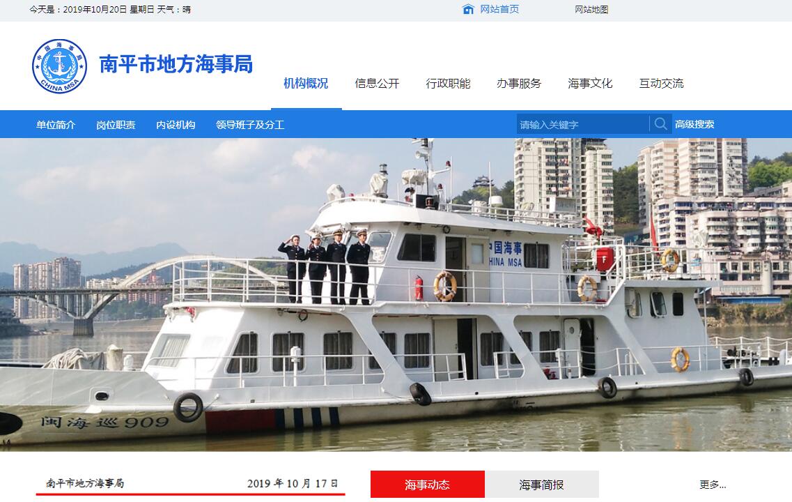 南平市地方海事局、南平市水路運輸管理處成立于2003年6月,2004年6月原省航道局南平辦事處并入市水路運輸管理處(原省航道局設在武夷山的航道管理站同時更名為南平市港航管理處武夷山港航管理所),實行四塊牌子一套人馬,統(tǒng)一管理、統(tǒng)一執(zhí)法,為副處級行政類事業(yè)單位。設有九個職能科(室)所,即辦公室、運輸管理科、安全監(jiān)督科、航務科、船舶檢驗科、港務管理科、航道管理科、沙溪口水路運輸安全管理所和南平市港航管理處武夷山港航管理所,均為副科級。局(處)機關設有南平市地方海事局黨支部、南平市水路運輸管理處黨支部,書記由局長兼任。為第九屆、第十屆、第十一屆省級文明單位,第十二屆市級文明單位;連續(xù)兩屆獲得“全國海事系統(tǒng)文明執(zhí)法示范窗口標兵”單位。其主要職能:貫徹執(zhí)行國家有關水路運輸行業(yè)發(fā)展戰(zhàn)略、方針、政策和法規(guī);擬訂全市水路運輸行業(yè)規(guī)章制度,經(jīng)批準后負責實施、協(xié)調(diào)和監(jiān)督;編制全市水路運輸行業(yè)的發(fā)展規(guī)劃,中長期和年度計劃并負責監(jiān)督實施;負責全市水路運輸市場管理,維護水路運輸行業(yè)的平等競爭,負責水路交通運輸?shù)慕M織管理;負責轄區(qū)水上交通安全監(jiān)督、管理;負責實施轄內(nèi)水上交通管制;負責轄內(nèi)船舶和船員管理;負責轄內(nèi)船舶、水上設施法定檢驗;負責轄區(qū)港口航道行政管理、維護、建設、規(guī)費征收等職能。
