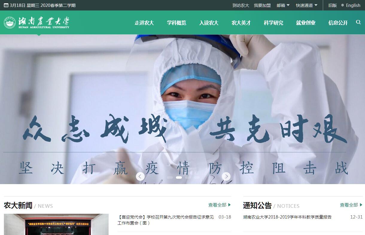 湖南農(nóng)業(yè)大學(xué)是國家“2011”協(xié)同創(chuàng)新中心牽頭建設(shè)單位,是農(nóng)業(yè)部與湖南省人民政府共建大學(xué)、全國首批新農(nóng)村發(fā)展研究院試點(diǎn)建設(shè)單位、教育部本科教學(xué)工作水平評(píng)估“優(yōu)秀”高校、全國文明單位、全國文明校園。學(xué)校坐落在中國歷史文化名城長沙,占地面積3400多畝,環(huán)境幽雅,空氣清新,是讀書治學(xué)的理想園地。學(xué)校辦學(xué)始于1903年10月8日創(chuàng)辦的修業(yè)學(xué)堂,周震鱗、黃興、徐特立、毛澤東等先后在此執(zhí)教。1951年3月由修業(yè)學(xué)堂發(fā)展而來的湖南省立修業(yè)農(nóng)林??茖W(xué)校與湖南大學(xué)農(nóng)業(yè)學(xué)院合并組建湖南農(nóng)學(xué)院,毛澤東主席親筆題寫校名。1994年3月更名為湖南農(nóng)業(yè)大學(xué)。學(xué)校設(shè)有20個(gè)學(xué)院、1個(gè)獨(dú)立學(xué)院和研究生院,學(xué)科涵蓋農(nóng)、工、文、理、經(jīng)、管、法、醫(yī)、教、藝10大門類。有博士后科研流動(dòng)站10個(gè),博士學(xué)位授權(quán)一級(jí)學(xué)科11個(gè),碩士學(xué)位授權(quán)一級(jí)學(xué)科20個(gè),碩士專業(yè)學(xué)位授權(quán)類別11個(gè),是全國首批獲得碩士學(xué)位授予權(quán)單位;有本科專業(yè)72個(gè)、??茖I(yè)2個(gè)。有國家重點(diǎn)學(xué)科1個(gè),省優(yōu)勢(shì)特色學(xué)科2個(gè),省部級(jí)重點(diǎn)學(xué)科16個(gè)。動(dòng)植物科學(xué)領(lǐng)域、農(nóng)業(yè)科學(xué)領(lǐng)域的ESI學(xué)科排名進(jìn)入全球前1%?,F(xiàn)有專任教師1361人;有中國工程院院士1人、雙聘院士5人、美國科學(xué)院院士2人,高級(jí)職稱專家829人,博士生導(dǎo)師307人。有國家有突出貢獻(xiàn)的中青年專家、全國杰出專業(yè)技術(shù)人才、享受國務(wù)院政府特殊津貼專家等81人;有“芙蓉學(xué)者計(jì)劃”特聘教授、湖南省教學(xué)名師、湖南省優(yōu)秀教師等316人;有教育部高校科技創(chuàng)新團(tuán)隊(duì)2個(gè)、農(nóng)業(yè)部科研杰出人才及其創(chuàng)新團(tuán)隊(duì)3個(gè)、湖南省創(chuàng)新團(tuán)隊(duì)6個(gè),國家教學(xué)團(tuán)隊(duì)2個(gè)、湖南省優(yōu)秀教學(xué)團(tuán)隊(duì)6個(gè)。現(xiàn)有在校普通全日制本科生27000人(其中獨(dú)立學(xué)院5927人)、??粕?33人,在校研究生4445人。獲批國家首批卓越農(nóng)林人才教育培養(yǎng)計(jì)劃改革試點(diǎn)專業(yè)8個(gè)、國家級(jí)專業(yè)綜合改革試點(diǎn)項(xiàng)目1個(gè)、國家級(jí)特色專業(yè)6個(gè)、國家精品開放課程4門、國家級(jí)實(shí)驗(yàn)教學(xué)示范中心2個(gè)、國家級(jí)虛擬仿真實(shí)驗(yàn)教學(xué)中心1個(gè)、國家級(jí)大學(xué)生校外實(shí)踐教育基地1個(gè)、國家級(jí)農(nóng)科教合作人才培養(yǎng)基地4個(gè)、全國重點(diǎn)建設(shè)職教師資培訓(xùn)基地1個(gè)、全國農(nóng)業(yè)碩士實(shí)踐教育示范基地1個(gè);獲得國家級(jí)教學(xué)成果獎(jiǎng)11項(xiàng)、省部級(jí)教學(xué)成果獎(jiǎng)105項(xiàng);1篇博士論文入選全國百篇優(yōu)秀博士論文,2篇獲提名獎(jiǎng)。畢業(yè)生就業(yè)率穩(wěn)定在全省高校前列,學(xué)校獲評(píng)全國畢業(yè)生就業(yè)典型經(jīng)驗(yàn)高校?,F(xiàn)有牽頭組建的國家級(jí)“2011”協(xié)同創(chuàng)新中心1個(gè)、省級(jí)“2011”協(xié)同創(chuàng)新中心3個(gè);國家級(jí)科研平臺(tái)8個(gè)、省部級(jí)科研平臺(tái)55個(gè)。獲得國家級(jí)科技成果獎(jiǎng)27項(xiàng)、省部級(jí)科技成果獎(jiǎng)500余項(xiàng);審定新品種300余個(gè);獲授權(quán)專利1400余項(xiàng)。選育出的油菜、水稻、玉米、馬鈴薯、花生、茶葉、葡萄、棉花、柑橘、生豬、煙草、蔬菜等新品種和形成的實(shí)用技術(shù)成果推廣覆蓋全國。學(xué)校與20多個(gè)國家的40多所大學(xué)及國際機(jī)構(gòu)建立了密切聯(lián)系,與美國俄亥俄州立大學(xué)、英國格林威治大學(xué)、日本鹿兒島大學(xué)等20多所大學(xué)建立了合作辦學(xué)關(guān)系,是湖南省最早開辦中外合作辦學(xué)項(xiàng)目的高校之一。展望未來,學(xué)校將繼續(xù)秉承“樸誠、奮勉、求實(shí)、創(chuàng)新”的校訓(xùn)和“質(zhì)量立校、學(xué)術(shù)興校、人才強(qiáng)?!钡霓k學(xué)理念,堅(jiān)持“產(chǎn)學(xué)研結(jié)合”的辦學(xué)特色,堅(jiān)定不移地走以提高質(zhì)量為核心的內(nèi)涵式發(fā)展道路,努力建成特色鮮明、優(yōu)勢(shì)突出的高水平教學(xué)研究型大學(xué)。