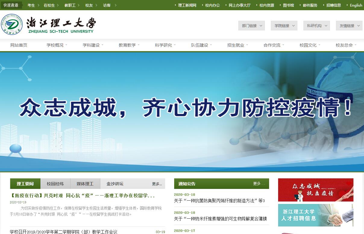學(xué)校辦學(xué)歷史悠久。浙江理工大學(xué)坐落在歷史文化名城杭州市,占地面積2100余畝。學(xué)校前身——蠶學(xué)館,是杭州知府林啟為實(shí)現(xiàn)實(shí)業(yè)救國、教育救國的宏愿于1897年創(chuàng)辦的,是我國最早創(chuàng)辦的新學(xué)教育機(jī)構(gòu)之一。1908年,因辦學(xué)成績(jī)卓著,被清政府御批升格為“高等蠶桑學(xué)堂”。辛亥革命至解放前夕,因時(shí)局動(dòng)亂,學(xué)校幾度易名、數(shù)遷校址,在風(fēng)雨滄桑中生生不息、堅(jiān)持辦學(xué)。新中國成立后,學(xué)校不斷開拓進(jìn)取,繪就了新的歷史篇章。學(xué)校1959年開始招收本科生,1964年由國務(wù)院定名為浙江絲綢工學(xué)院,1979年開始招收碩士研究生,1983年獲碩士學(xué)位授予權(quán)。1999年,經(jīng)教育部批準(zhǔn),學(xué)校更名為浙江工程學(xué)院。2004年,經(jīng)教育部批準(zhǔn),學(xué)校更名為浙江理工大學(xué)。2006年,獲得博士學(xué)位授予權(quán)。2010年,經(jīng)教育部批準(zhǔn),獲得推薦優(yōu)秀應(yīng)屆本科畢業(yè)生免試攻讀碩士學(xué)位研究生資格。2017年,學(xué)校入選浙江省重點(diǎn)建設(shè)高校。今天的浙江理工大學(xué)是一所以工為主,特色鮮明,優(yōu)勢(shì)突出,理、工、文、經(jīng)、管、法、藝術(shù)、教育等多學(xué)科協(xié)調(diào)發(fā)展的省重點(diǎn)建設(shè)高校。學(xué)校下設(shè)17個(gè)學(xué)院(教研部),舉辦1所獨(dú)立學(xué)院,現(xiàn)有全日制在校學(xué)生26000余人,其中研究生3500余人。學(xué)?,F(xiàn)有本科專業(yè)65個(gè),其中國家(教育部)特色專業(yè)8個(gè),教育部綜合改革試點(diǎn)專業(yè)1個(gè)、教育部“卓越工程師教育培養(yǎng)計(jì)劃”試點(diǎn)專業(yè)6個(gè)、“教育部-歐特克公司專業(yè)綜合改革項(xiàng)目”3個(gè),“十三五”省優(yōu)勢(shì)專業(yè)7個(gè)、省特色專業(yè)5個(gè)。擁有省重點(diǎn)建設(shè)高校優(yōu)勢(shì)特色學(xué)科2個(gè),博士學(xué)位授權(quán)一級(jí)學(xué)科3個(gè)、碩士學(xué)位授權(quán)一級(jí)學(xué)科26個(gè),并可授予專業(yè)學(xué)位類別10種,博士后科研流動(dòng)站2個(gè)。擁有省高校重中之重一級(jí)學(xué)科1個(gè)、省高校重中之重(一級(jí))學(xué)科3個(gè)、省高校人文社會(huì)科學(xué)重點(diǎn)研究基地1個(gè)、省高校重點(diǎn)學(xué)科11個(gè),省一流學(xué)科A類6個(gè)、一流學(xué)科B類7個(gè),材料科學(xué)、化學(xué)、工程學(xué)3個(gè)學(xué)科進(jìn)入ESI全球排名前1%;擁有2個(gè)國家地方聯(lián)合工程實(shí)驗(yàn)室,1個(gè)國家地方聯(lián)合工程研究中心,3個(gè)國家國際科技合作基地,1個(gè)教育部重點(diǎn)實(shí)驗(yàn)室,2個(gè)教育部工程研究中心,1個(gè)文化部重點(diǎn)實(shí)驗(yàn)室,3個(gè)省級(jí)2011協(xié)同創(chuàng)新中心,10個(gè)省級(jí)重點(diǎn)實(shí)驗(yàn)室和工程技術(shù)研究中心,2個(gè)省級(jí)哲學(xué)社會(huì)科學(xué)重點(diǎn)研究基地,5個(gè)省級(jí)工程實(shí)驗(yàn)室,2個(gè)省級(jí)(技術(shù))研究中心,2個(gè)省級(jí)國際科技合作基地,1個(gè)省級(jí)院士專家工作站,1個(gè)浙江省新型高校智庫,1個(gè)浙江省文化廳重點(diǎn)研究基地,1個(gè)浙江現(xiàn)代革命歷史文化研究基地;擁有3個(gè)國家級(jí)實(shí)驗(yàn)教學(xué)示范中心,2個(gè)國家級(jí)虛擬仿真實(shí)驗(yàn)教學(xué)示范中心,2個(gè)國家工程實(shí)踐教育中心,1個(gè)國家級(jí)大學(xué)生校外實(shí)踐教育基地;擁有4門國家精品視頻公開課,5門國家精品資源共享課,1門國家級(jí)精品在線開放課程,2門國家雙語教學(xué)示范課,2門教育部來華留學(xué)英語授課品牌課程,7本“十二五”國家級(jí)規(guī)劃教材;獲國家級(jí)教學(xué)成果二等獎(jiǎng)3項(xiàng)。學(xué)校師資力量雄厚,現(xiàn)有教職工2000余人,其中具有副高以上職稱880余人,正高職稱270余人。擁有教育部創(chuàng)新團(tuán)隊(duì)2個(gè),省重點(diǎn)科技創(chuàng)新團(tuán)隊(duì)7個(gè),省重點(diǎn)文化創(chuàng)新團(tuán)隊(duì)1個(gè),省高等學(xué)校創(chuàng)新團(tuán)隊(duì)5個(gè)。國家“萬人計(jì)劃”領(lǐng)軍人才4人,教育部長(zhǎng)江學(xué)者特聘教授1人、講座教授1人,國家自然科學(xué)基金杰出青年科學(xué)基金獲得者1人,國家“千人計(jì)劃”3人,其中國家“外專千人計(jì)劃”1人,“新世紀(jì)百千萬人才工程”國家級(jí)人選5人,國家有突出貢獻(xiàn)中青年專家1人,文化名家暨“四個(gè)一批”人才1人,教育部“新世紀(jì)優(yōu)秀人才支持計(jì)劃”5人;省特級(jí)專家3人,省“千人計(jì)劃”5人(含海鷗計(jì)劃2人),省高?!板X江學(xué)者”特聘教授12人,省有突出貢獻(xiàn)中青年專家9人,省“新世紀(jì)151人才工程”第一層次培養(yǎng)人員(含重點(diǎn)資助)27人;享受國務(wù)院政府特殊津貼人員31人;聘請(qǐng)了一批國內(nèi)外知名專家、學(xué)者為兼職教授和金沙學(xué)者。學(xué)校著力提升科技創(chuàng)新力,在眾多領(lǐng)域完成了一系列國家科技計(jì)劃項(xiàng)目和國家、省部基金科研項(xiàng)目,獲得國家技術(shù)發(fā)明二等獎(jiǎng)8項(xiàng),國家科技進(jìn)步二等獎(jiǎng)7項(xiàng),國家科技進(jìn)步
