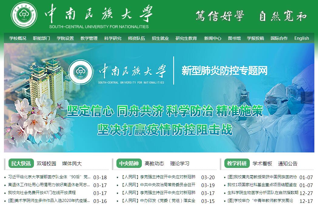 中南民族大學(xué)是直屬于國(guó)家民族事務(wù)委員會(huì)的綜合性普通高等院校,坐落于白云黃鶴的故鄉(xiāng)——武漢南湖之濱。學(xué)校前身為中南民族學(xué)院,創(chuàng)建于1951年,2002年3月更名為中南民族大學(xué)。建校以來(lái),學(xué)校始終堅(jiān)持社會(huì)主義辦學(xué)方向,貫徹落實(shí)黨的教育方針和民族政策,始終堅(jiān)持黨的民族工作規(guī)律與高等教育規(guī)律相結(jié)合,民族高等教育的特殊性與普通高等教育的普遍性相結(jié)合,遵循高等教育的普遍規(guī)律,尊重民族高等教育的特殊性,努力探索辦好民族院校的新路子,學(xué)校的各項(xiàng)事業(yè)獲得了快速發(fā)展。學(xué)校占地1550余畝,校舍面積100萬(wàn)余平米,館藏圖書(shū)697余萬(wàn)冊(cè),擁有全國(guó)高校第一家民族學(xué)博物館。校園內(nèi)綠樹(shù)成蔭、花香四季,具有濃郁民族特色的現(xiàn)代建筑鱗次櫛比,湖光山色與人文景觀(guān)交相輝映,構(gòu)成了教學(xué)、科研和生活的優(yōu)美環(huán)境。學(xué)校現(xiàn)有56個(gè)民族的全日制博士、碩士、本科、預(yù)科等各類(lèi)學(xué)生27000余人,面向全國(guó)招生,在山西、內(nèi)蒙古、江蘇、河南、湖北、湖南、廣西、貴州、云南、西藏、甘肅、寧夏、新疆、河北、安徽、江西、重慶、四川和青海等?。▍^(qū))進(jìn)入本科一批招生,少數(shù)民族學(xué)生比例超過(guò)60%?,F(xiàn)有教職工2114人,其中專(zhuān)任教師1375人。教師里有高級(jí)職稱(chēng)專(zhuān)業(yè)技術(shù)人員750余人,有國(guó)家杰出青年科學(xué)基金獲得者和“973計(jì)劃”首席科學(xué)家1人、國(guó)家級(jí)和省部級(jí)人才工程人選46人、享受?chē)?guó)務(wù)院和湖北省政府特殊津貼專(zhuān)家48人、國(guó)家級(jí)和省部級(jí)突出貢獻(xiàn)專(zhuān)家25人、楚天學(xué)者22人、二級(jí)教授22人,擁有博士學(xué)位教師比例達(dá)到50.91%,一支數(shù)量充足、結(jié)構(gòu)優(yōu)化、素質(zhì)較高、發(fā)展良好的師資隊(duì)伍正逐步形成。學(xué)校始終堅(jiān)持“面向少數(shù)民族和民族地區(qū),面向地方,面向全國(guó),為少數(shù)民族和民族地區(qū)服務(wù),為黨和國(guó)家的民族工作服務(wù),為國(guó)家戰(zhàn)略需求服務(wù)”的辦學(xué)宗旨,現(xiàn)有10大學(xué)科門(mén)類(lèi)的84個(gè)本科專(zhuān)業(yè);擁有民族學(xué)和中國(guó)語(yǔ)言文學(xué)2個(gè)一級(jí)學(xué)科博士學(xué)位授權(quán)點(diǎn),有博士后科研流動(dòng)站;擁有24個(gè)學(xué)術(shù)型一級(jí)學(xué)科碩士學(xué)位授權(quán)點(diǎn),16個(gè)專(zhuān)業(yè)型碩士學(xué)位授權(quán)點(diǎn),授權(quán)學(xué)科覆蓋了除軍事學(xué)之外的其他全部12個(gè)學(xué)科門(mén)類(lèi),包括哲學(xué)、經(jīng)濟(jì)學(xué)、法學(xué)、教育學(xué)、文學(xué)、歷史學(xué)、理學(xué)、工學(xué)、農(nóng)學(xué)、醫(yī)學(xué)、管理學(xué)、藝術(shù)學(xué)等。學(xué)?,F(xiàn)有省部級(jí)一級(jí)重點(diǎn)學(xué)科9個(gè),一級(jí)重點(diǎn)建設(shè)學(xué)科2個(gè),二級(jí)重點(diǎn)學(xué)科4個(gè);有5個(gè)國(guó)家級(jí)特色專(zhuān)業(yè),7個(gè)省級(jí)品牌專(zhuān)業(yè),40門(mén)國(guó)家級(jí)、省級(jí)各類(lèi)精品課程,13個(gè)國(guó)家級(jí)、省級(jí)實(shí)驗(yàn)教學(xué)示范中心,39個(gè)省部級(jí)科研機(jī)構(gòu)(實(shí)驗(yàn)室、基地、中心),實(shí)驗(yàn)教學(xué)儀器設(shè)備總值3億多元。學(xué)校入選湖北省“國(guó)內(nèi)一流大學(xué)建設(shè)高?!?,民族學(xué)、化學(xué)、藥學(xué)3個(gè)學(xué)科入選湖北省“國(guó)內(nèi)一流學(xué)科建設(shè)學(xué)科”。2008年學(xué)校成為“推薦優(yōu)秀應(yīng)屆本科畢業(yè)生免試攻讀碩士學(xué)位”授予權(quán)單位?!笆濉逼陂g,學(xué)校承擔(dān)國(guó)家級(jí)項(xiàng)目316項(xiàng),其中國(guó)家自科基金169項(xiàng),國(guó)家社科基金129項(xiàng);承擔(dān)橫向課題379項(xiàng),與企業(yè)簽訂技術(shù)合同244項(xiàng)。出版學(xué)術(shù)專(zhuān)著309部,獲授權(quán)專(zhuān)利122項(xiàng)。發(fā)表各類(lèi)論文5613篇,其中CSSCI論文1143篇(其中權(quán)威期刊論文90篇),SCI論文1041篇,EI論文1,112篇;獲省部級(jí)以上獎(jiǎng)勵(lì)144項(xiàng);2項(xiàng)研究成果獲黨和國(guó)家領(lǐng)導(dǎo)人批示,26項(xiàng)調(diào)研報(bào)告被政府采納。學(xué)校高度重視學(xué)生全面素質(zhì)的提升和創(chuàng)新能力的培養(yǎng),以“篤信、好學(xué)、自然、寬和”的校訓(xùn)激勵(lì)各族學(xué)生奮發(fā)圖強(qiáng)、全面發(fā)展。60余年來(lái),學(xué)校已累計(jì)培養(yǎng)了13萬(wàn)余名各民族干部和專(zhuān)業(yè)技術(shù)人才。他們遍布祖國(guó)的四面八方,為維護(hù)民族團(tuán)結(jié)與穩(wěn)定,促進(jìn)少數(shù)民族和民族地區(qū)的經(jīng)濟(jì)與社會(huì)發(fā)展做出了積極的貢獻(xiàn)。隨著教育改革與開(kāi)放的不斷深入,學(xué)校加快了對(duì)外交流、開(kāi)放辦學(xué)的步伐。目前,學(xué)校已與美國(guó)、英國(guó)、法國(guó)、烏克蘭、澳大利亞、加拿大、俄羅斯、德國(guó)、日本、韓國(guó)、巴基斯坦、哈薩克斯坦、吉爾吉斯斯坦、