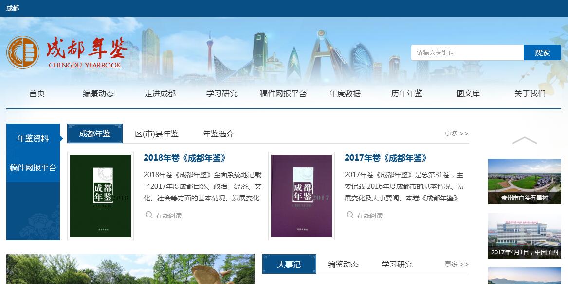 《成都年鑒》創(chuàng)刊于1987年,前身為《成都經(jīng)濟(jì)年鑒》(1987年卷)。1988年9月,《成都經(jīng)濟(jì)年鑒》更名為《成都年鑒》。1991年,經(jīng)新聞出版總署批準(zhǔn)同意,《成都年鑒》作為期刊公開出版,國內(nèi)刊號:CN51-1384/Z,國際刊號:ISSN1004-9959?!冻啥寄觇b》至今已連續(xù)編纂出版30卷,向國內(nèi)外公開發(fā)行近20萬冊。《成都年鑒》全面系統(tǒng)記載了成都政治、經(jīng)濟(jì)、文化、社會等方面的發(fā)展變化,以資料翔實(shí)、權(quán)威可靠而深受國內(nèi)外人士歡迎?!冻啥寄觇b》幾經(jīng)框架結(jié)構(gòu)調(diào)整,編纂質(zhì)量逐年提高,連續(xù)獲得4屆全國年鑒編察出版綜合質(zhì)量一等獎,多次被評為省、市優(yōu)秀期刊及獲得四川省地方志優(yōu)秀成果一等獎?!冻啥寄觇b》(2014卷)先后被中國版協(xié)年鑒工作委員會和中國地方志指導(dǎo)小組評為特等獎年鑒。歷年出版的《成都年鑒》被“中國年鑒全文數(shù)據(jù)庫”全文收錄,并獲首屆中國出版政府獎網(wǎng)絡(luò)出版物提名獎。《成都年鑒》(簡本)及英文版于2015年12月、2016年4月相繼出版發(fā)行。成都年鑒網(wǎng)站及微信公眾號于2015年6月開通。目前,《成都年鑒》正朝著打造“精品年鑒”而奮進(jìn)。