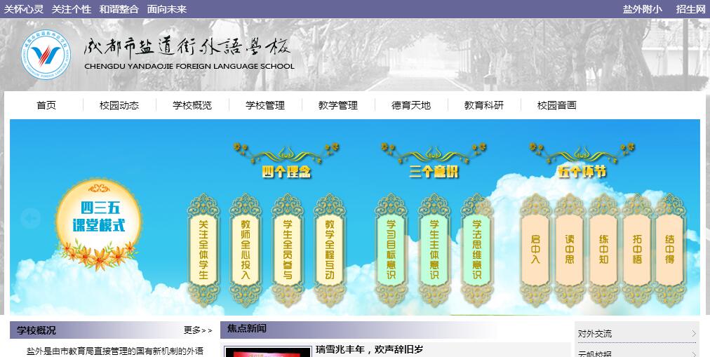 | 網(wǎng)站簡(jiǎn)介: 成都市鹽道街外語(yǔ)學(xué)校創(chuàng)建于2002年,是由成都市教育局直接管理的新機(jī)制的外語(yǔ)實(shí)驗(yàn)學(xué)校,設(shè)有小學(xué)部、中學(xué)部,實(shí)行小學(xué)、初中到高中的十二年一貫寄宿制。學(xué)校位于成都市機(jī)場(chǎng)路土橋段76號(hào),占地100余畝,地處城南成熟社區(qū),交通十分便利,學(xué)習(xí)環(huán)境美麗幽靜,離塵不離城。校園內(nèi)芳草茵茵,綠樹(shù)成林,建筑布局合理,亭臺(tái)樓宇交相輝映。教學(xué)設(shè)備設(shè)施均按一類學(xué)校配備,是莘莘學(xué)子讀書(shū)求學(xué)的理想之地。成都市鹽道街中學(xué)外語(yǔ)學(xué)校是由市教育局直接任命校長(zhǎng)的學(xué)校之一,其全國(guó)有的性質(zhì)決定了她有更高的可靠性與教育質(zhì)量保障,擁有更雄厚教育資源的支持。新機(jī)制使其具有更多的辦學(xué)自主權(quán)和靈活有效的用人機(jī)制。學(xué)校干部隊(duì)伍年富力強(qiáng),具有成熟的教學(xué)管理經(jīng)驗(yàn)、又不失開(kāi)拓創(chuàng)新精神,其中兩名校級(jí)干部在鹽道街中學(xué)任現(xiàn)職。教師隊(duì)伍以省市重點(diǎn)中學(xué)教師為主體,并聘有多名外籍教師,新的用人機(jī)制吸引一大批骨干教師到校應(yīng)聘,既有教壇新秀,更有資深教師。其中特級(jí)教師、學(xué)科帶頭人、高級(jí)教師職稱的人數(shù)已占教師隊(duì)伍的50%,可謂群星燦爛、人才濟(jì)濟(jì)。學(xué)校堅(jiān)持以課程改革為核心,全面推進(jìn)素質(zhì)教育,以培養(yǎng)學(xué)生德識(shí)雙馨、堅(jiān)毅練達(dá)和諧發(fā)展為辦學(xué)目標(biāo),堅(jiān)持以人為本、關(guān)注個(gè)體、和諧整合、整體提高的辦學(xué)理念,讓學(xué)生全面發(fā)展、特長(zhǎng)發(fā)展。以尊師守紀(jì)、勤學(xué)好問(wèn)、自尊自強(qiáng)、全面發(fā)展為學(xué)風(fēng),以愛(ài)生重德、嚴(yán)謹(jǐn)治教、刻苦鉆研、勇于創(chuàng)造為教風(fēng),始終堅(jiān)持以質(zhì)量求生存,以特色求發(fā)展。實(shí)行小班額(每班不超過(guò)38人)特色化教學(xué),給每個(gè)學(xué)生提供針對(duì)性更強(qiáng)的個(gè)性化優(yōu)質(zhì)教育。學(xué)校嚴(yán)格執(zhí)行國(guó)家課程計(jì)劃,突出外語(yǔ)教學(xué)特色,積極推進(jìn)選修課程和活動(dòng)課程。學(xué)校以住宿制為主的管理方式,有利于學(xué)生學(xué)會(huì)生活,學(xué)會(huì)做人,形成自主獨(dú)立的品質(zhì)與關(guān)愛(ài)和諧的團(tuán)隊(duì)精神。學(xué)校與國(guó)內(nèi)外多所知名學(xué)校建立了廣泛、深入和穩(wěn)定可靠的合作關(guān)系。與國(guó)際知名、國(guó)內(nèi)一流的北京景山學(xué)校結(jié)為友好合作學(xué)校同步實(shí)施教學(xué)計(jì)劃;與法國(guó)蒙特貝魯左拉中學(xué)、美國(guó)崔尼特學(xué)校和新加坡法國(guó)學(xué)校建立了共識(shí)鏈,共享國(guó)際化、現(xiàn)代化教育資源。學(xué)校按照高起點(diǎn)、快發(fā)展、做精品的思路辦學(xué),從起步開(kāi)始,這種新機(jī)制帶來(lái)的良好教育效益便受到社會(huì)的關(guān)注。我校校風(fēng)好、學(xué)風(fēng)正、管理嚴(yán)、質(zhì)量高為社會(huì)普遍認(rèn)同。建校十五年來(lái),鹽外人負(fù)重拼搏,走內(nèi)涵發(fā)展的道路,不斷加強(qiáng)隊(duì)伍建設(shè),改善辦學(xué)條件,優(yōu)化教育教學(xué)管理,提升辦學(xué)效益,努力彰顯學(xué)校特色,做了大量扎實(shí)有效的工作。不僅培育出了李偉、袁藝等北大、清華學(xué)子,為985和211工程的大學(xué)及國(guó)際名校輸送了一批優(yōu)秀人才,更以師生的有效、全面、和諧的成長(zhǎng),獲得了良好的社會(huì)認(rèn)同,取得了一些在省內(nèi)外有一定影響力的階段性辦學(xué)成果。近年,學(xué)校先后榮獲了:“全國(guó)民辦教育先進(jìn)集體”、“全國(guó)校園足球特色學(xué)?!?、“四川省陽(yáng)光體育示范學(xué)?!?、“成都市民辦教育先進(jìn)集體”、“成都市新成長(zhǎng)型學(xué)?!?、“成都市先進(jìn)基層黨組織”、“成都市教育系統(tǒng)先進(jìn)基層黨組織”、“創(chuàng)先爭(zhēng)優(yōu),樹(shù)立四個(gè)新形象”示范黨組織、“黨工共建創(chuàng)先爭(zhēng)優(yōu)示范點(diǎn)”、“四川省教科文衛(wèi)體系統(tǒng)模范職工之家”、“全市教育系統(tǒng)創(chuàng)先爭(zhēng)優(yōu)先進(jìn)基層黨組織”、“成都市心理實(shí)驗(yàn)學(xué)?!?、“成都園林式單位”、“成都市特色高中項(xiàng)目學(xué)?!薄ⅰ鞍踩逃龑?shí)驗(yàn)區(qū)全國(guó)示范學(xué)?!?,“成都市文明校園”等一系列榮譽(yù)。主研的“十一五”規(guī)劃龍頭課題“小班化課堂教學(xué)的反饋與調(diào)控研究”獲得中國(guó)教育學(xué)會(huì)課題成果一等獎(jiǎng);累計(jì)榮獲國(guó)家級(jí)榮譽(yù)或表彰獎(jiǎng)勵(lì)17項(xiàng);獲得省級(jí)榮譽(yù)或表彰獎(jiǎng)勵(lì)14項(xiàng);市、區(qū)(縣)級(jí)以上集體榮譽(yù)或表彰獎(jiǎng)勵(lì)64項(xiàng)。謝丹琦等33位教師榮獲特級(jí)校長(zhǎng)、學(xué)科帶頭人、先進(jìn)黨務(wù)工作者、先進(jìn)德育工作者、成都市優(yōu)秀教師、成都市優(yōu)秀青年教師等各級(jí)榮譽(yù)稱號(hào)。目前,學(xué)校依