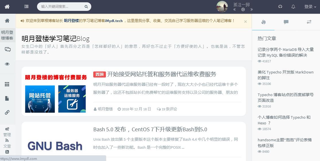| 網(wǎng)站簡介: 草根博客站長明月登樓的學習LNMP生產(chǎn)環(huán)境、Linux服務(wù)器運維、 Typecho 博客平臺等的筆記Blog。 |