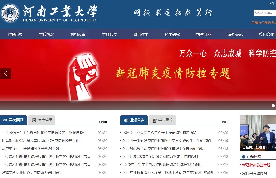 河南工業(yè)大學(xué)(Henan University of Technology)位于河南省會鄭州市,是河南省人民政府和國家糧食局共建高校;始建于1956年,先后隸屬國家糧食部、商業(yè)部和國內(nèi)貿(mào)易部;1959 年開展本科教育,1981 年開始碩士研究生教育,2013年開始博士研究生教育,2017年獲批碩士研究生推免資格;1998 年劃歸河南省管理,河南省人民政府和國家糧食局于2010年簽約共建河南工業(yè)大學(xué)。建校至今,學(xué)校堅持“扎根中原,立足行業(yè),服務(wù)全國,面向世界”的辦學(xué)定位,嚴(yán)守“育人為本、質(zhì)量立校、特色發(fā)展”的辦學(xué)理念,秉承“明德、求是、拓新、篤行”的校訓(xùn),大力弘揚“崇尚科學(xué)、勇于探索、報國興學(xué)、自強不息”的工大精神,凝練形成了“團結(jié)進取,務(wù)實高效”的校風(fēng)、“博學(xué)奉獻”的教風(fēng)和“勤奮誠信”的學(xué)風(fēng)。經(jīng)過歷代工大人的勵精圖治和薪火傳承,學(xué)校已經(jīng)發(fā)展成為一所以工學(xué)為主,涵蓋理學(xué)、經(jīng)濟學(xué)、管理學(xué)、法學(xué)、文學(xué)、藝術(shù)學(xué)和農(nóng)學(xué)等學(xué)科協(xié)調(diào)發(fā)展的多科性大學(xué),不僅具備完整的學(xué)士、碩士、博士三級人才培養(yǎng)體系,而且作為第二單位成功入選國家首批“ 2011 協(xié)同創(chuàng)新計劃”,是教育部“中西部高校基礎(chǔ)能力建設(shè)工程”和“卓越工程師教育培養(yǎng)計劃”建設(shè)高校,在推動行業(yè)、區(qū)域和國家經(jīng)濟社會發(fā)展,實現(xiàn)教育振興的過程中做出了應(yīng)有貢獻,在人才培養(yǎng)、科學(xué)研究、社會服務(wù)等方面均取得了優(yōu)異成績?,F(xiàn)有專任教師1603人,高級職稱教師850人,博士學(xué)位教師681人;碩士生導(dǎo)師513 人,博士生導(dǎo)師 53人;匯聚了雙聘院士、長江學(xué)者、國家杰出青年科學(xué)基金獲得者、“百千萬人才工程”國家級人選、國務(wù)院特貼專家、教育部新世紀(jì)優(yōu)秀人才、中原學(xué)者、河南省教學(xué)名師等一大批學(xué)術(shù)帶頭人;擁有國家級教學(xué)團隊1 個,省級教學(xué)、科研團隊 20個。建校以來,學(xué)校涌現(xiàn)出了陳啟宗、路茜玉、張根旺、周乃如、汪璠、張國賢等一大批,在糧食、磨料磨具等行業(yè)領(lǐng)域具有重大貢獻和社會影響力的知名專家、學(xué)者,他們潛心學(xué)術(shù),立德樹人,獎掖后進,功勛卓著,為我國糧食事業(yè)、磨料磨具行業(yè)及學(xué)校發(fā)展、社會進步作出了開拓性貢獻,為后繼者樹立了榜樣?,F(xiàn)任教師中,有國際標(biāo)準(zhǔn)化組織食品技術(shù)委員會谷物與豆類分會主席卞科教授、國際谷物科技協(xié)會主席王鳳成教授、三屆奧運會田徑裁判王晏教授等知名專家,還有一批專家教授擔(dān)任中國糧油學(xué)會、中國糧食工程建設(shè)委員會、全國磨料磨具標(biāo)準(zhǔn)化技術(shù)委員會、中國熱處理學(xué)會、中國化學(xué)會有機化學(xué)磷化學(xué)專業(yè)委員會等學(xué)術(shù)組織理事長或副理事長職務(wù),他們在各自的專業(yè)領(lǐng)域和教學(xué)崗位上,教書育人,竭誠奉獻,堪稱楷模。學(xué)校長期致力于糧食產(chǎn)后領(lǐng)域的基礎(chǔ)理論及工程技術(shù)研究,構(gòu)建了集儲運、加工、裝備、信息、管理等于一體的完整學(xué)科體系;擁有全國最完整的糧油食品學(xué)科群和實力雄厚的超硬材料學(xué)科群;現(xiàn)有20 個學(xué)院, 68個本科專業(yè),擁有3個博士學(xué)位授權(quán)一級學(xué)科,20 個碩士學(xué)位授權(quán)一級學(xué)科,7個碩士專業(yè)學(xué)位授權(quán)類別,21個省一級重點學(xué)科,“糧食產(chǎn)后安全及加工”學(xué)科群入選河南省首批優(yōu)勢特色學(xué)科建設(shè)工程;“食品科學(xué)與工程”等5個國家級特色專業(yè)、“糧食工程”等3個國家級綜合改革試點專業(yè)、“食品科學(xué)與工程、糧食工程”和“計算機科學(xué)與技術(shù)”3個國家級卓越計劃專業(yè)、16個省級名牌和特色專業(yè)、6 個雙學(xué)位專業(yè),學(xué)校具有同等學(xué)力申請碩士學(xué)位授予權(quán)和高校教師碩士學(xué)位授予權(quán)。學(xué)校面向全國招生;是國家來華留學(xué)生自主招生高校,擁有“中國政府獎學(xué)金”、“中國政府絲綢之路獎學(xué)金”和“河南省政府獎學(xué)金”培養(yǎng)資格;是全國碩士研究生推免高校、普通高等學(xué)校本科教學(xué)工作水平評估優(yōu)秀單位;擁有“食品科學(xué)”國家級實驗教學(xué)示范中心、國家級“糧油食品類工程應(yīng)用型人才培養(yǎng)模式創(chuàng)新實驗區(qū)”、“河南工業(yè)大學(xué)-河南中鶴純凈粉業(yè)有限公司工程實踐教育中心”國家級大學(xué)生校外實踐教育基地。現(xiàn)有全日制在校生34000余人,其中研究生1500余人,外國留學(xué)生300余人;另有繼續(xù)教育學(xué)生18000 余人;先后為國家輸送了近20萬名合格畢業(yè)生,糧食行業(yè)半數(shù)以上的管理精英和技術(shù)骨干均出自本校,被譽為糧食行業(yè)的“黃埔軍校”。近五年,學(xué)生在各類競賽中獲國家級獎340項、省部級獎772項;全國碩士學(xué)位論文抽檢合格率連年100%;國家“挑戰(zhàn)杯”競賽連續(xù)5屆居全國前40名,連年位居河南省高