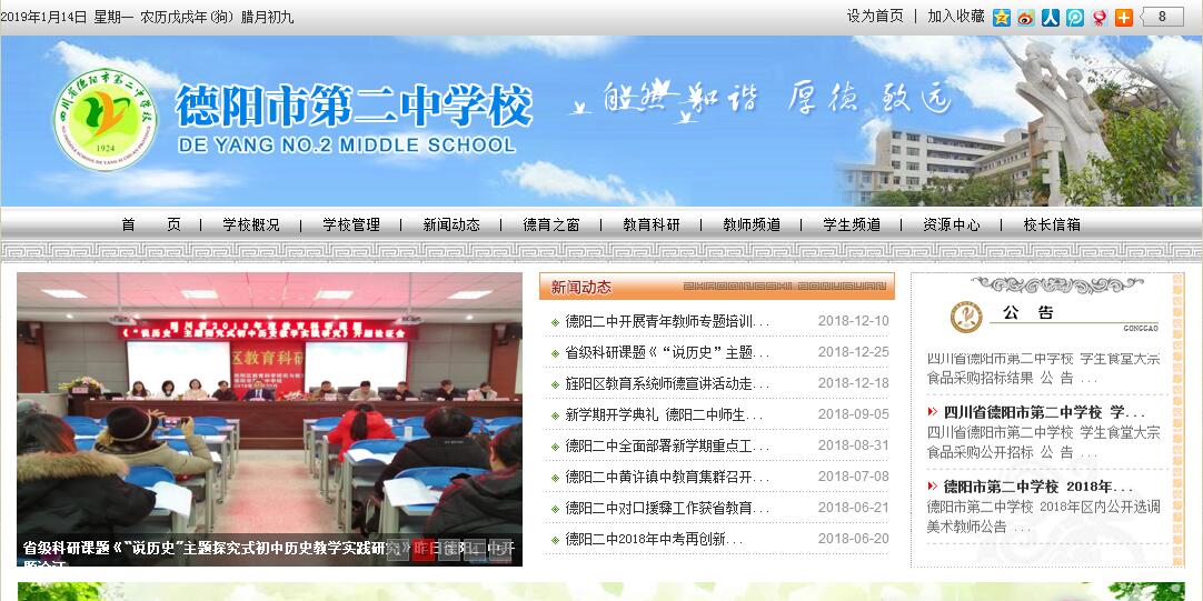 四川省德陽市第二中學(xué)校是一所全日制公辦學(xué)校,創(chuàng)建于1924年,是市區(qū)內(nèi)一所近百年的歷史名校。學(xué)校位于交通便利的市區(qū)東門,毗鄰風(fēng)景優(yōu)美的石刻公園?,F(xiàn)目前,學(xué)校分為教學(xué)區(qū)和生活區(qū)兩部分,教學(xué)區(qū)位于德陽市泰山北路二段26號,生活區(qū)位于德陽市泰山北路二段21號,學(xué)校共占地33540㎡,運動場面積15957㎡,校舍面積14070㎡,其中教學(xué)及輔助用房面積8921㎡,學(xué)?,F(xiàn)有教學(xué)班35個,學(xué)生2062人,教職工153人,其中省市區(qū)學(xué)科帶頭人、骨干教師23余人,各級優(yōu)秀教師27人,研究生4人,在讀碩士研究生5人,具有研究生結(jié)業(yè)學(xué)歷者8人,中、高級職稱教師82人,市區(qū)學(xué)科中心組成員9人,教師學(xué)歷達(dá)標(biāo)100%。德陽二中現(xiàn)已成為市級校風(fēng)示范校、市陽光體育示范學(xué)校、市書法教育示范學(xué)校、市級衛(wèi)生單位、市級文明單位、德陽市德育工作先進集體、市愛國主義教育先進集體、省檔案管理一級達(dá)標(biāo)單位、省市籃球傳統(tǒng)項目學(xué)校、省體育合格先進單位、旌陽區(qū)教育科研先進單位。在全校師生的共同努力下,學(xué)校建立了“以年級為整體,班級為核心,學(xué)科為支撐”的捆綁式質(zhì)量管理措施,三個年級整體推進,形成了“管理嚴(yán)、學(xué)風(fēng)好、低進高出、高進優(yōu)出”的辦學(xué)特色,歷年的初中畢業(yè)升學(xué)考試成績都名列前茅,年年被評為旌陽區(qū)初中教學(xué)質(zhì)量優(yōu)勝單位,學(xué)校已經(jīng)連續(xù)十五年獲得旌陽區(qū)教學(xué)質(zhì)量一等獎,多學(xué)科獲教學(xué)質(zhì)量一等獎, 在市區(qū)享有盛名。百年薪火傳承,德陽二中是人才的搖籃,成功的沃土。四川美院院長、雕塑家葉毓山,中央美院副院長、國畫家葉毓中,四川高院原院長李玉龍,第八屆全國人大代表、企業(yè)家王周龍,北大博士生蔣智,清華大學(xué)博士生唐華斌,海外博士后王俊平、王祥云、劉陽,北大、清華學(xué)子馬蘊瑤、羅維忠等都曾在此度過美好的中學(xué)時光。