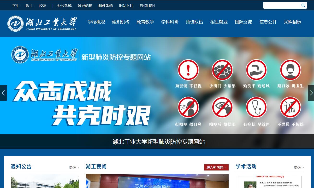 湖北工業(yè)大學(xué)是一所以工學(xué)為主,覆蓋工、文、理、藝、經(jīng)、管、法和教育等八大學(xué)科門類的多科性大學(xué)。學(xué)校創(chuàng)建于1952年,1984年由原湖北輕工業(yè)學(xué)院和原湖北農(nóng)業(yè)機(jī)械??茖W(xué)校合并組建成湖北工學(xué)院,2004年更名為湖北工業(yè)大學(xué)。學(xué)校是湖北省重點(diǎn)建設(shè)高校,被省委省政府定位為“在湖北省高教體系中起龍頭示范作用的、水平較高的骨干大學(xué)”。1986年取得碩士學(xué)位授予權(quán),具有推薦優(yōu)秀本科生免試攻讀碩士研究生資格;2010年獲得“全國畢業(yè)生就業(yè)典型經(jīng)驗(yàn)高?!狈Q號;2014年,學(xué)校整體進(jìn)入一本高校行列;2012年、2016年連續(xù)兩次入選國家“中西部高校基礎(chǔ)能力建設(shè)工程”高校;2016年入選“全國首批深化創(chuàng)新創(chuàng)業(yè)教育改革示范高校”;2017年獲批博士學(xué)位授予單位。學(xué)校占地面積1600余畝,校舍建筑面積100余萬平方米,擁有完善的教學(xué)、科研、文體和后勤服務(wù)設(shè)施,門類齊全的基礎(chǔ)實(shí)驗(yàn)室和專業(yè)實(shí)驗(yàn)室,學(xué)生公寓均配有空調(diào)和開水、熱水供應(yīng)設(shè)施。學(xué)校圖書館建筑面積4.6萬m2,是湖北省高等學(xué)校優(yōu)秀級圖書館,各類藏書600余萬冊。學(xué)校建有安全通暢的校園網(wǎng)絡(luò)、智慧快捷的校務(wù)平臺。學(xué)校設(shè)有16個學(xué)院,有湖北省機(jī)電研究設(shè)計院股份公司、湖北省農(nóng)機(jī)工程研究設(shè)計院和湖北省農(nóng)機(jī)鑒定站等省級科研院所,辦有1個獨(dú)立學(xué)院。學(xué)校面向全國31個省、自治區(qū)、直轄市招生。各類全日制在校學(xué)生2萬余人;在讀研究生共5800余人。學(xué)?,F(xiàn)有專任教師1335人。其中,正、副教授674 人,博士、碩士生導(dǎo)師623人,具有博士學(xué)位教師比例達(dá)到51%以上?,F(xiàn)有國家級人才33人、省級專家151人。其中,雙聘院士1人、“千人計劃”特聘專家3人、“長江學(xué)者”特聘教授2人、國家杰出青年科學(xué)基金獲得者1人、國家優(yōu)秀青年科學(xué)基金獲得者1人、“萬人計劃”入選者2人、國家百千萬人才工程人選3人、全國杰出專業(yè)技術(shù)人才1人、科技部中青年科技創(chuàng)新領(lǐng)軍人才2人、科技部“創(chuàng)新人才推進(jìn)計劃”人選1人、享受國務(wù)院特殊津貼專家9人、高端外國專家5人、全國模范(優(yōu)秀)教師3人;湖北省“百人計劃”專家24人、楚天學(xué)者99人、湖北教學(xué)名師4人、湖北名師工作室主持人2人、楚天園丁獎1人。學(xué)校還先后從國內(nèi)外著名高校、科研院所及大型企事業(yè)單位聘請了包括8名國內(nèi)院士和12名國外院士在內(nèi)的兼職教授286人,形成了以國家級人才為領(lǐng)軍、省部級人才為中堅、中青年博士教師為骨干的高水平師資隊伍。2017年,獲批國家外專局“111計劃”學(xué)科創(chuàng)新引智基地,為湖北省首家獲批的省屬高校。學(xué)?,F(xiàn)有68個本科專業(yè)。其中,4個國家特色專業(yè)建設(shè)點(diǎn),3個教育部“卓越工程師教育培養(yǎng)計劃”入選專業(yè),7個教育部產(chǎn)學(xué)合作專業(yè)綜合改革項目,133個教育部產(chǎn)學(xué)合作協(xié)同育人項目,8個湖北省本科高校綜合改革試點(diǎn)專業(yè),8個湖北省品牌專業(yè),9個湖北省“戰(zhàn)略性新興(支柱)產(chǎn)業(yè)人才培養(yǎng)計劃”入選專業(yè),1個湖北省“拔尖創(chuàng)新人才培育試驗(yàn)計劃”入選專業(yè);6個湖北省 “荊楚卓越人才”協(xié)同育人計劃入選專業(yè);3個湖北省教學(xué)團(tuán)隊;土木工程專業(yè)通過住建部本科專業(yè)評估,機(jī)械設(shè)計制造及其自動化、電氣工程及其自動化、材料成型及控制工程、測控技術(shù)與儀器、高分子材料與工程、環(huán)境工程等專業(yè)通過中國工程教育認(rèn)證協(xié)會認(rèn)證。學(xué)校建有國家級實(shí)驗(yàn)教學(xué)示范中心2個、湖北高校省級重點(diǎn)實(shí)驗(yàn)教學(xué)示范中心2個、湖北省高校實(shí)驗(yàn)教學(xué)示范中心10個;國家級大學(xué)生校外實(shí)踐教育基地3個、湖北高校省級示范實(shí)習(xí)實(shí)訓(xùn)基地3個、湖北高校省級實(shí)習(xí)實(shí)訓(xùn)基地2個、湖北省大學(xué)生創(chuàng)新基地9個、湖北高校省級虛擬仿真實(shí)驗(yàn)教學(xué)中心3個、湖北省服務(wù)外包人才培養(yǎng)基地1個;有國家級“精品視頻公開課”3門、湖北省“精品視頻公開課”4門、湖北省精品資源共享課8門、湖北省精品在線開放課程2門、湖北省精品課程21門。近年來,學(xué)校主動對接國家和地方綠色工業(yè)發(fā)展和傳統(tǒng)工業(yè)綠色化的戰(zhàn)略需求,大力實(shí)施以綠色工業(yè)為主導(dǎo)的“135+”學(xué)科發(fā)展戰(zhàn)略?,F(xiàn)有1個湖北省優(yōu)勢學(xué)科、5個湖北省特色學(xué)科、4個湖北省重點(diǎn)(培育)學(xué)科,2個湖北省優(yōu)勢特色學(xué)科群,36個湖北省“楚天學(xué)者計劃”設(shè)崗學(xué)科;有20個一級學(xué)科碩士點(diǎn);有9個碩士專業(yè)學(xué)位授權(quán)類別,其中,工程碩士學(xué)位授權(quán)領(lǐng)域12個;有4個中職碩士學(xué)位授權(quán)點(diǎn)。學(xué)校建有1個教育
