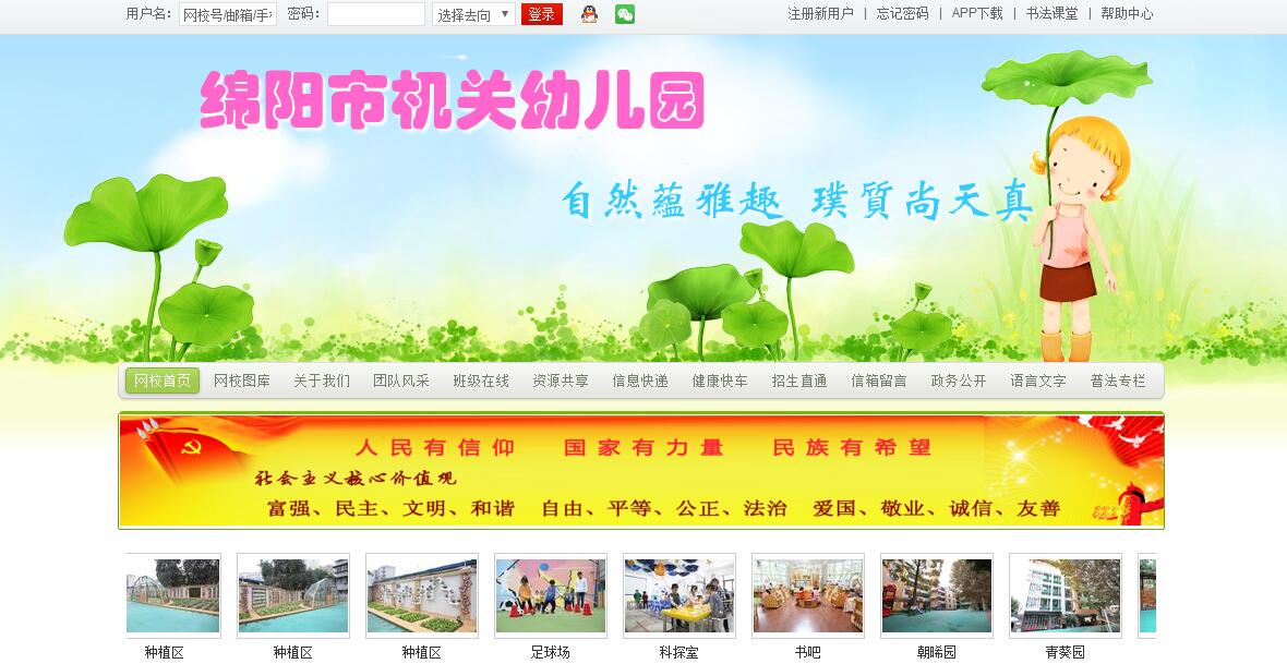 綿陽市機(jī)關(guān)幼兒園(原地專機(jī)關(guān)托兒所)始建于1950年11月,系綿陽市教體局直屬公辦幼兒園,是新中國成立后我市首批興辦的公辦園之一。六十多年的發(fā)展歷程,積淀了厚重的文化底蘊(yùn),形成了良好的品牌張力,享有崇高的社會聲譽(yù)和地位,成為綿陽幼教事業(yè)改革與發(fā)展的領(lǐng)頭羊,始終引領(lǐng)著全市幼教事業(yè)的同步發(fā)展。1997年,該園被評為四川省首批“省級示范性幼兒園”。近年來,在黨支部書記、園長馮萍的帶領(lǐng)下,機(jī)關(guān)幼兒園始終堅(jiān)持以“高位求進(jìn)、精致保教、打造綠色精品幼兒園”的高端運(yùn)行理念,強(qiáng)化內(nèi)部管理,注重質(zhì)量提升,得到社會各界的廣泛認(rèn)同;始終堅(jiān)持走內(nèi)涵發(fā)展、特色發(fā)展之路,以科學(xué)保教和規(guī)范管理傲立潮頭,形成了“鮮活靈動、生命之綠”的辦園特色,成為了綿陽幼教一張響亮的名片。先后被評選為“全國未成年人思想道德建設(shè)先進(jìn)集體”、“全國教育科研先進(jìn)集體”、“全國優(yōu)秀幼兒園”、“全國幼兒教學(xué)先進(jìn)單位”、“全國巾幗示范崗”、“四川省三八紅旗先進(jìn)單位”、“四川省綠色學(xué)?!薄ⅰ八拇ㄊ∮變后w育基地”、“四川省特色體操幼兒園”、“四川省校本研修先進(jìn)學(xué)?!?、“四川省食品衛(wèi)生A級信譽(yù)單位”、“綿陽市十大名校”等榮譽(yù)稱號。近年來,該園確定了“文化建設(shè)、特色打造”的發(fā)展之路,以科研為推動力,著力提升保教質(zhì)量,打造優(yōu)秀教師團(tuán)隊(duì),鑄就了“示范”與“旗幟”的強(qiáng)勢地位。馮萍園長被評為“四川省特級教師”、“四川省優(yōu)秀教師”、“省級教學(xué)名師”、“綿陽市十佳名校長”;該園課題先后獲全國十一五教育科研優(yōu)秀成果二等獎和優(yōu)秀獎;教師3人獲全國“教育科研先進(jìn)工作者”稱號,20余人獲市級優(yōu)秀教師等榮譽(yù)稱號;6人被評為省級骨干教師、17人被評為市級骨干教師。近三年教師撰寫論文獲國家、省、市級獎200余篇,各類幼教專業(yè)競賽獲國家級、省、市級獎50余次;公開教學(xué)獲省、市級證書10余次,曾被收入四川省《學(xué)前教育優(yōu)秀活動案例集錦》并出版;幼兒美術(shù)作品獲國家級獎1500余人次,參加幼兒體操、舞蹈、唱歌比賽獲國家、省、市級獎……類別、數(shù)量之多,枚不勝舉。機(jī)關(guān)幼兒園以成熟完善的管理和求新求變的辦學(xué)思路,始終探尋教育真諦,提升辦園質(zhì)量,注重榜樣示范和輻射帶動,推進(jìn)全市幼教事業(yè)同步發(fā)展。該園積極承擔(dān)培訓(xùn)任務(wù),成功承辦2012年全市幼兒體操比賽、2013年全市園長《3-6歲兒童學(xué)習(xí)與發(fā)展指南》培訓(xùn),多次承辦國培學(xué)員和全市幼兒骨干教師培訓(xùn);熱情接待加拿大、美國專家及全國同仁造訪,僅三年就達(dá)3000余人次;堅(jiān)持送教,對口支援澳門、若爾蓋縣、北川及綿陽市各區(qū)縣鄉(xiāng)鎮(zhèn)園、民辦園,真正起好了標(biāo)桿和示范引領(lǐng)作用。該園積極攜手高校及研究團(tuán)體,相繼成為中國—加拿大聯(lián)合心理發(fā)展研究中心實(shí)驗(yàn)基地園、IBM KidSmart兒童電腦中心、香港幼兒體智能游戲教學(xué)基地、中國舞蹈家協(xié)會定點(diǎn)教學(xué)單位、省陶行知幼教研究會會員單位、四川幼專教育實(shí)習(xí)及教研基地、綿陽師院人才培養(yǎng)實(shí)訓(xùn)基地等。