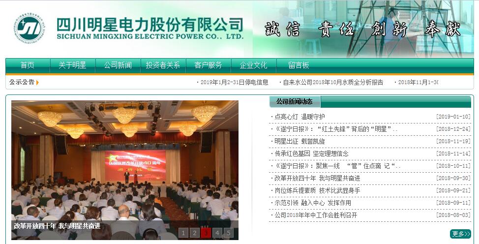 四川明星電力股份有限公司(以下簡稱“公司”)于1988年4月29日注冊成立,注冊地為四川省遂寧市。公司前身為遂寧電力公司,始建于1958年,1988年3月經(jīng)四川省遂寧市人民政府批準進行股份制試點,1997年6月27日,經(jīng)中國證監(jiān)會批準,公司社會公眾股在上海證券交易所上市流通(證券簡稱:明星電力,證券代碼:600101)。公司經(jīng)營范圍為電力、熱力的生產(chǎn)、供應;送變電工程的施工及設備安裝;項目投資;研究、生產(chǎn)光電產(chǎn)品;技術服務;商品批發(fā)與零售;進出口業(yè)。公司控股股東為國網(wǎng)四川省電力公司,總股本為324,178,977股。公司擁有6個全資子公司,3個控股子公司,1個合營企業(yè),產(chǎn)業(yè)主要涉及自來水生產(chǎn)與供應、送變電工程的施工及設備安裝、水電工程建設、天然氣生產(chǎn)與供應、酒店賓館服務、礦產(chǎn)資源開發(fā)等。公司權益總裝機容量12.938萬千瓦。其中,遂寧本地有龍鳳、小白塔、三星和過軍渡水力發(fā)電站4座,發(fā)電機組15臺,總裝機容量11.558萬千瓦;甘孜州康定縣華龍公司爐城電站發(fā)電機組2臺,裝機容量3.0萬千瓦,公司權益裝機容量1.38萬千瓦。轄區(qū)內供電市場占有率為100%。公司全資子公司遂寧市明星自來水有限公司現(xiàn)有自來水廠4座,總生產(chǎn)能力20萬噸/日,供水市場占有率90%以上。