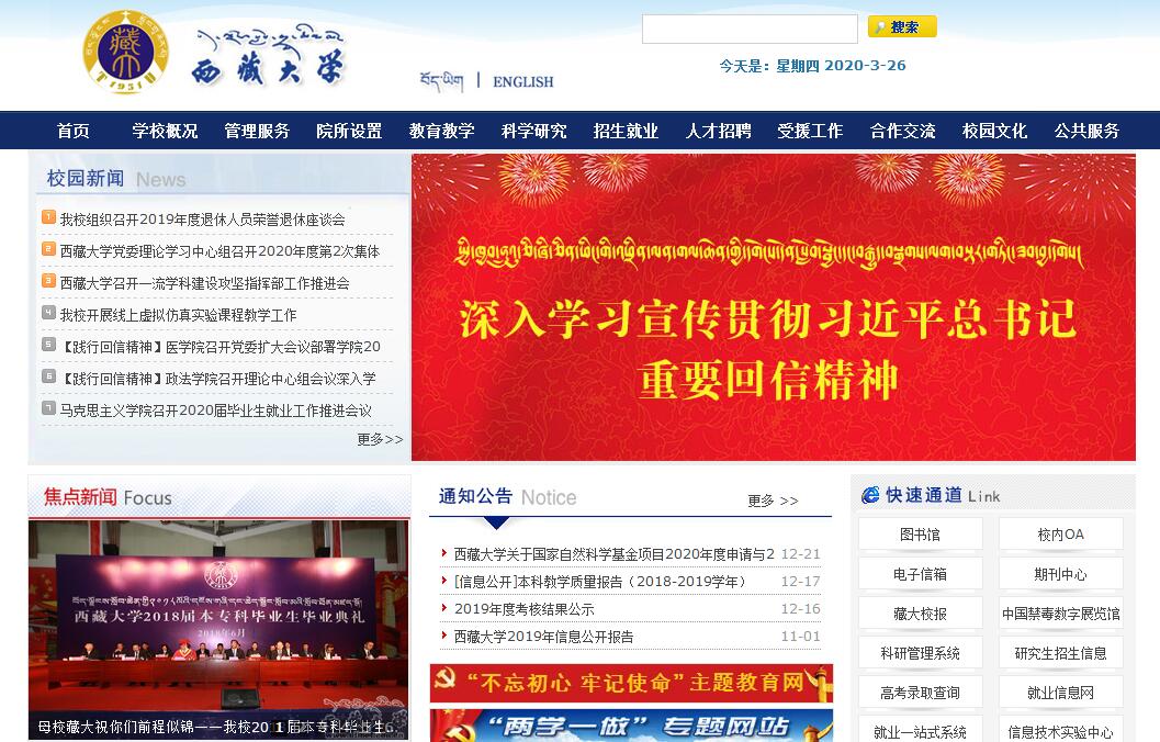 西藏大學(xué)是列入教育部直屬高校序列的國家“211工程”重點(diǎn)建設(shè)大學(xué),2004年10月成為西藏自治區(qū)人民政府與教育部共建高校,2013年6月列入“中西部高等教育振興計(jì)劃”,2013年7月獲批為博士學(xué)位授予單位,2017年9月進(jìn)入國家世界一流學(xué)科建設(shè)高校行列,2018年2月成為教育部和西藏自治區(qū)人民政府“部區(qū)合建”高校。學(xué)校于1951年11月建校,歷經(jīng)藏文干部訓(xùn)練班、西藏軍區(qū)干部學(xué)校、西藏地方干部學(xué)校、西藏行政干部學(xué)校,在此基礎(chǔ)上,1965年3月成立西藏師范學(xué)校,1975年7月成立西藏師范學(xué)院。為適應(yīng)西藏地區(qū)經(jīng)濟(jì)社會(huì)快速發(fā)展對人才的需要,經(jīng)教育部批準(zhǔn),1985年6月正式更名為西藏大學(xué)。1999年以來,西藏自治區(qū)藝術(shù)學(xué)校、西藏醫(yī)學(xué)高等??茖W(xué)校和西藏民族學(xué)院醫(yī)療系、西藏自治區(qū)財(cái)經(jīng)學(xué)校先后并入西藏大學(xué)。學(xué)??傉嫉孛娣e117.95萬平方米,有河壩林校區(qū)、納金校區(qū)、羅布林卡醫(yī)學(xué)院校區(qū)和羅布林卡財(cái)經(jīng)學(xué)院校區(qū),建筑面積42.85萬平方米,是“全國綠化模范單位”之一。教學(xué)科研儀器設(shè)備總值4.26億元,圖書總藏量129萬冊,電子圖書47萬種,校園網(wǎng)是CERNET西藏主節(jié)點(diǎn)。設(shè)有文學(xué)院、理學(xué)院、工學(xué)院、醫(yī)學(xué)院、藝術(shù)學(xué)院、經(jīng)濟(jì)與管理學(xué)院、旅游與外語學(xué)院、政法學(xué)院、教育學(xué)院、財(cái)經(jīng)學(xué)院、信息科學(xué)技術(shù)學(xué)院、馬克思主義學(xué)院、國家開放大學(xué)西藏分部、繼續(xù)教育學(xué)院、留學(xué)生部15個(gè)學(xué)院(部)。學(xué)校在職教職工1149人,專任教師和其他師資857人,其中具有高級職稱的348人,占40.61%;具有博士、碩士學(xué)位的605人,占70.59%。有國家級教學(xué)名師1人,“長江學(xué)者”特聘教授3人,入選國家“萬人計(jì)劃”4人,入選人事部“百千萬人才工程”國家級人選5人,入選教育部“新世紀(jì)優(yōu)秀人才支持計(jì)劃”4人,入選“千人計(jì)劃”2人,享受“國務(wù)院特殊津貼”和“自治區(qū)政府特殊津貼”專家8人,自治區(qū)級教學(xué)名師2人,自治區(qū)學(xué)術(shù)技術(shù)帶頭人8人,全國師德標(biāo)兵1人,全國優(yōu)秀教師和模范教師5人。學(xué)校各類在校生2.5萬余人,其中普通本??茖W(xué)生9391人,博士、碩士研究生964人,留學(xué)生17人,各類成人生1.5萬余人。學(xué)校有民族學(xué)、中國語言文學(xué)、生態(tài)學(xué)3個(gè)博士學(xué)位授權(quán)一級學(xué)科和12個(gè)博士學(xué)位授權(quán)二級學(xué)科;民族學(xué)、教育學(xué)、中國語言文學(xué)、生物學(xué)、生態(tài)學(xué)、計(jì)算機(jī)科學(xué)與技術(shù)、音樂與舞蹈學(xué)、美術(shù)學(xué)8個(gè)碩士學(xué)位授權(quán)一級學(xué)科和教育碩士、藝術(shù)碩士、工程碩士、臨床醫(yī)學(xué)4個(gè)專業(yè)碩士學(xué)位授權(quán)類別,27個(gè)碩士學(xué)位授權(quán)二級學(xué)科和21個(gè)碩士專業(yè)學(xué)位授權(quán)領(lǐng)域;54個(gè)本科專業(yè),涵蓋經(jīng)濟(jì)學(xué)、法學(xué)、教育學(xué)、文學(xué)、歷史學(xué)、理學(xué)、工學(xué)、醫(yī)學(xué)、管理學(xué)和藝術(shù)學(xué)10個(gè)學(xué)科門類。有1個(gè)國家級重點(diǎn)學(xué)科——中國少數(shù)民族語言文學(xué)(藏語言文學(xué)),14個(gè)自治區(qū)級重點(diǎn)學(xué)科。學(xué)校堅(jiān)持以教學(xué)為中心,不斷深化人才培養(yǎng)模式改革,努力提高人才培養(yǎng)質(zhì)量,培養(yǎng)和造就基礎(chǔ)扎實(shí)、知識面寬、實(shí)踐創(chuàng)新能力強(qiáng)的高素質(zhì)人才?,F(xiàn)有國家精品課程1門,國家級教學(xué)團(tuán)隊(duì)3個(gè),國家特色專業(yè)建設(shè)點(diǎn)4個(gè),國家雙語教學(xué)示范課程1門,國家大學(xué)生校外實(shí)踐教育基地1個(gè),自治區(qū)精品課程20門,自治區(qū)級教學(xué)團(tuán)隊(duì)6個(gè),自治區(qū)實(shí)驗(yàn)教學(xué)示范中心3個(gè),自治區(qū)特色專業(yè)建設(shè)點(diǎn)5個(gè)。近年來,共承擔(dān)國家卓越醫(yī)生教育培養(yǎng)計(jì)劃項(xiàng)目1項(xiàng),國家專業(yè)綜合改革試點(diǎn)項(xiàng)目1項(xiàng),國家大學(xué)生創(chuàng)新創(chuàng)業(yè)訓(xùn)練計(jì)劃項(xiàng)目320項(xiàng),自治區(qū)教育體制改革試點(diǎn)項(xiàng)目5項(xiàng),自治區(qū)專業(yè)綜合改革試點(diǎn)項(xiàng)目4個(gè),自治區(qū)大學(xué)生創(chuàng)新創(chuàng)業(yè)訓(xùn)練計(jì)劃584項(xiàng)。在2007年教育部本科教學(xué)工作水平評估中獲得“優(yōu)秀”成績。獲國家級教學(xué)成果二等獎(jiǎng)1項(xiàng),自治區(qū)教學(xué)成果獎(jiǎng)15項(xiàng)。2014年被教育部授予“2012-2014年度國家級大學(xué)生創(chuàng)新創(chuàng)業(yè)訓(xùn)練計(jì)劃實(shí)施工作先進(jìn)單位”。2017年入選“全國首批創(chuàng)新創(chuàng)業(yè)教育示范高?!?。學(xué)校有1個(gè)教育部人文社會(huì)科學(xué)重點(diǎn)研究基地,1個(gè)教育部工程研究中心(藏文信息技術(shù)國家地方聯(lián)合工程研究中心),1