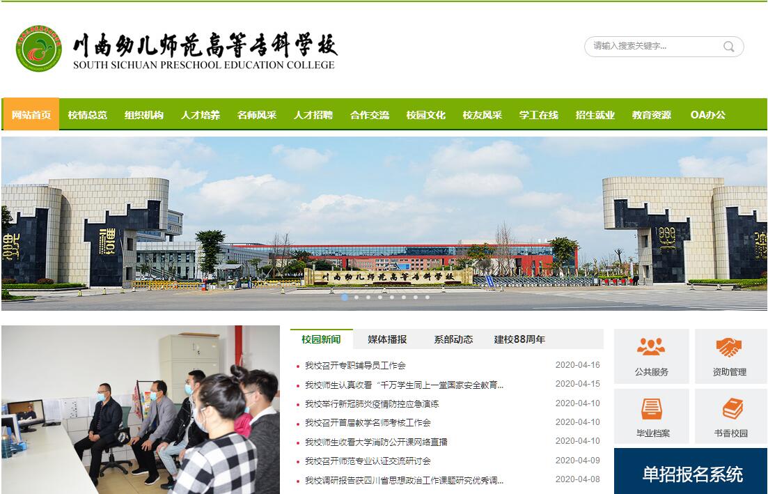 川南幼兒師范高等??茖W(xué)校是經(jīng)省人民政府批準(zhǔn),教育部備案,以培養(yǎng)幼兒、小學(xué)教育師資為主的公辦全日制普通高等專科學(xué)校,是西南地區(qū)重要的學(xué)前教育師資培養(yǎng)培訓(xùn)基地。學(xué)校榮獲“全國文明單位”“國家級語言文字規(guī)范化示范學(xué)?!薄叭珖嗌倌晡拿鞫Y儀教育示范基地”“全國校園文化先進單位”“省依法治校示范學(xué)?!薄笆〖壩拿餍@”等榮譽稱號。學(xué)校地處大千故里——內(nèi)江市,是成渝發(fā)展主軸重要節(jié)點城市。坐落在川南城市群中心——隆昌市,毗鄰中國石牌坊、古宇湖國家AAAA級景區(qū)。占地500余畝,建筑面積13.48萬平方米,校園充滿“愛心、陽光、尚美”的人文氣息。圖書館擁有紙質(zhì)圖書62萬冊,數(shù)字圖書22.3萬冊;有多媒體教室127間,專業(yè)實訓(xùn)基地12個,微格教室11間,獨立琴房517間;建有學(xué)前教育實訓(xùn)中心、普通話測試中心、心理健康教育中心、藝術(shù)中心、大學(xué)生創(chuàng)新創(chuàng)業(yè)俱樂部和藝術(shù)團等。學(xué)校前身是創(chuàng)辦于1932年的隆昌縣立鄉(xiāng)村師范學(xué)校,辦學(xué)歷史悠久,文化底蘊深厚。截至2018年8月,有在校大專生5627人,開設(shè)有學(xué)前教育、小學(xué)教育、語文教育、科學(xué)教育、音樂教育、美術(shù)教育、老年服務(wù)與管理7個專業(yè)。師資力量雄厚,現(xiàn)有360余名教職工,教授、副教授70余人,研究生學(xué)位120余人。著力打造“雙師型”教師隊伍,建有鄢超云特聘教授工作室、曾傳興教授工作室、園長工作站、名師工作室、國家級非物質(zhì)文化遺產(chǎn)項目——中型杖頭木偶戲傳習(xí)所,常年聘有國內(nèi)外知名客座教授30余人。學(xué)校堅持立德育人根本任務(wù),以服務(wù)發(fā)展為宗旨,傳承“嚴(yán)、實、勤”精神,秉承“兩代師表、仁愛篤行”校訓(xùn),堅持“守正出奇,強內(nèi)涵、重特色”的辦學(xué)理念和“以內(nèi)涵發(fā)展為核心、以創(chuàng)新發(fā)展為動力、以特色發(fā)展為生命、以開放發(fā)展為支撐、以共享發(fā)展為根本”的辦學(xué)思路,突出“全人+特長”的育人理念,著力培養(yǎng)師德為先、幼兒為本、能力為重、終身學(xué)習(xí),具有強烈社會責(zé)任感、創(chuàng)新精神和實踐能力,服務(wù)城鄉(xiāng),下得去、留得住、干得好、有發(fā)展的卓越幼師和技術(shù)技能型人才。學(xué)校植根川南,服務(wù)全國,主動融入?yún)^(qū)域經(jīng)濟社會,對接“一帶一路”,創(chuàng)新人才培養(yǎng)機制,開展校地、校校、校園、校企及國際合作,協(xié)同育人。同四川師范大學(xué)等建立學(xué)生專升本通道;與西華師范大學(xué)、四川理工學(xué)院、泰國西那瓦大學(xué)互派學(xué)生交流學(xué)習(xí);組建川南幼教集團;建立了省內(nèi)、珠三角、長三角教學(xué)科研就業(yè)基地130余個,為學(xué)生就業(yè)創(chuàng)業(yè)提供更多機會和更寬廣的平臺。八十余年風(fēng)雨兼程,執(zhí)著追求,學(xué)校不斷發(fā)展壯大,為四川乃至全國輸送了2萬余名幼兒教育、小學(xué)教育等優(yōu)秀人才,涌現(xiàn)出了全國教育系統(tǒng)勞動模范、全國特級教師、全國優(yōu)秀教師、四川省優(yōu)秀教師等杰出校友。畢業(yè)生素質(zhì)高、技能強、質(zhì)量優(yōu),連續(xù)十余年供不應(yīng)求,就業(yè)已拓展至北京、重慶、廣東、云南、貴州、新疆等18個省(市)。新時代、新氣象、新作為,川南幼專將以習(xí)近平新時代中國特色社會主義思想為指導(dǎo),學(xué)習(xí)貫徹全國教育大會精神,在省委、市委的堅強領(lǐng)導(dǎo)下,堅持社會主義的辦學(xué)方向,堅持立德育人根本任務(wù),走以質(zhì)量提升為核心的內(nèi)涵式發(fā)展道路,按照“入主流,創(chuàng)一流”奮斗目標(biāo),努力建設(shè)具有國內(nèi)知名學(xué)前教育品牌的省級優(yōu)質(zhì)幼兒師范高等??茖W(xué)校。