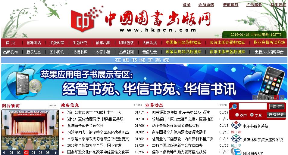 《中國圖書出版網(wǎng)》(www.bkpcn.com)是一個面向所有圖書出版單位和從業(yè)人員的管理和服務(wù)性網(wǎng)站,內(nèi)容涉及圖書出版業(yè)的方方面面。其主要任務(wù)是宣傳黨和政府有關(guān)圖書出版方面的相關(guān)政策法規(guī),發(fā)布政務(wù)信息,介紹行業(yè)動態(tài)?!吨袊鴪D書出版網(wǎng)》的開通是圖書出版業(yè)改進管理手段、推進信息化建設(shè)的重要舉措,《中國圖書出版網(wǎng)》自2003年6月10日開通至今,一直堅持“政務(wù)平臺、信息窗口、服務(wù)中心”這一宗旨,為提高圖書出版管理部門的服務(wù)質(zhì)量和工作效率,推動整個圖書出版業(yè)的迅速發(fā)展做出了自己的貢獻,在業(yè)界形成了一定的影響力,獲得了從業(yè)單位的好評?!吨袊鴪D書出版網(wǎng)》得到了新聞出版總署、各級新聞出版管理部門以及中央各出版單位主管部門、各圖書出版單位的關(guān)心和支持?!吨袊鴪D書出版網(wǎng)》在開發(fā)建設(shè)的過程中,新聞出版總署原署長石宗源、原副署長于永湛、現(xiàn)新聞出版總署署長柳斌杰、副署長鄔書林曾先后多次過問此事,并作了許多重要的指示和批示。新聞出版總署原副署長于永湛、現(xiàn)新聞出版總署副署長鄔書林、副署長閻曉宏、圖書司司長吳尚之、副司長王英利等主要領(lǐng)導(dǎo)曾多次親臨《中國圖書出版網(wǎng)》視察指導(dǎo)工作。信息的豐富、權(quán)威和及時是《中國圖書出版網(wǎng)》的主要特色?!吨袊鴪D書出版網(wǎng)》主要欄目有政務(wù)信息、公告欄、選題備案、質(zhì)量監(jiān)管、教育培訓(xùn)、出版信息化、出版觀察、體制改革、專題推薦、國內(nèi)外出版動態(tài)、國內(nèi)外圖書資訊、精彩書評、新書速遞、圖書排行榜等欄目?!吨袊鴪D書出版網(wǎng)》采用會員制的管理辦法,向所有圖書出版單位及從業(yè)人員開放,主要圍繞圖書出版,提供法律法規(guī)、出版管理、教育培訓(xùn)和行業(yè)資訊等多種信息服務(wù)。會員用戶通過瀏覽器以合法會員的身份登錄,依權(quán)限的不同進行信息瀏覽、網(wǎng)上查詢、網(wǎng)上申報等操作。從《中國圖書出版網(wǎng)》可以及時了解新聞出版總署、出版管理司的重要通知、政務(wù)活動、業(yè)界動態(tài)、深度分析信息和圖書資訊等。《中國圖書出版網(wǎng)》已經(jīng)成為出版單位和從業(yè)人員了解行業(yè)重要信息的窗口。