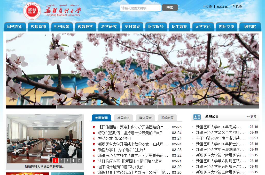 新疆醫(yī)科大學(xué)坐落于新疆維吾爾自治區(qū)首府烏魯木齊市風(fēng)景秀麗的鯉魚山下,是一所具有光榮傳統(tǒng)的高等醫(yī)學(xué)院校,其前身新疆醫(yī)學(xué)院始建于1954年,1956年建成招生。新疆醫(yī)學(xué)院的興建,受到了毛澤東、周恩來、朱德等中央領(lǐng)導(dǎo)人的親切關(guān)懷和大力支持,毛澤東主席親自決策將新疆醫(yī)學(xué)院的建設(shè)納入“一五計(jì)劃”156個(gè)重點(diǎn)項(xiàng)目。1998年6月新疆醫(yī)學(xué)院與新疆中醫(yī)學(xué)院合并成立了新疆醫(yī)科大學(xué),江澤民同志題寫了校名。2016年8月26日,新疆維吾爾自治區(qū)人民政府、國家衛(wèi)生計(jì)生委、教育部聯(lián)合印發(fā)《關(guān)于共建新疆醫(yī)科大學(xué)的意見》,我校正式成為部委省共建高校。學(xué)校有4個(gè)校區(qū),共占地130萬平方米。有15個(gè)學(xué)院,2個(gè)教學(xué)部,各類在校生25638人,其中統(tǒng)招博士研究生247人,統(tǒng)招碩士研究生2859人,在職人員攻讀碩士學(xué)位學(xué)生174人,普通本科生9008人,普通專科生1372人,留學(xué)生421人,成人教育學(xué)生11557人(專科7102,本科4455)。學(xué)校擁有一支高素質(zhì)的教師隊(duì)伍,全校教職工16584人,校本部教職工1402人。全校教授242人,副教授734人;主任醫(yī)師862人,副主任醫(yī)師1369人。7人入選國家“新世紀(jì)百千萬人才工程國家級人選”,4人獲新世紀(jì)優(yōu)秀人才支持計(jì)劃,59位專家享受政府特殊津貼,5人獲衛(wèi)生部有突出貢獻(xiàn)中青年專家,1人獲國家杰出青年基金獎(jiǎng),1名國家級教學(xué)名師,2人獲國家何梁何利基金獎(jiǎng),37人獲得自治區(qū)突出貢獻(xiàn)優(yōu)秀專家稱號,15名自治區(qū)級教學(xué)名師,連續(xù)兩年獲得國家科技進(jìn)步二等獎(jiǎng)。目前,學(xué)校共開設(shè)23個(gè)本科專業(yè),2個(gè)??茖I(yè),其中包含6個(gè)國家級特色專業(yè),有2個(gè)國家級實(shí)驗(yàn)教學(xué)示范中心;4個(gè)自治區(qū)重點(diǎn)專業(yè)(含2個(gè)特色品牌專業(yè)和2個(gè)創(chuàng)新創(chuàng)業(yè)示范專業(yè)),7個(gè)自治區(qū)級實(shí)驗(yàn)教學(xué)示范中心;5個(gè)自治區(qū)級教學(xué)團(tuán)隊(duì);1個(gè)國家級人才培養(yǎng)模式創(chuàng)新實(shí)驗(yàn)區(qū);2門國家級精品視頻公開課程,1門國家級精品課程,19門自治區(qū)級精品課程;1門國家級雙語教學(xué)示范課程;2門自治區(qū)級思政重點(diǎn)課程。學(xué)校有1個(gè)教育部省部共建新疆維吾爾族高發(fā)疾病研究重點(diǎn)實(shí)驗(yàn)室,1個(gè)科技部省部共建國家重點(diǎn)實(shí)驗(yàn)室培訓(xùn)基地(新疆維吾爾自治區(qū)重大疾病醫(yī)學(xué));有臨床醫(yī)學(xué)、中西醫(yī)結(jié)合2個(gè)自治區(qū)高峰學(xué)科,基礎(chǔ)醫(yī)學(xué)、藥學(xué)、公共衛(wèi)生與預(yù)防醫(yī)學(xué)、中醫(yī)學(xué)4個(gè)自治區(qū)高原學(xué)科;有地方病分子生物學(xué)實(shí)驗(yàn)室、包蟲病基礎(chǔ)研究實(shí)驗(yàn)室、新疆心血管病研究實(shí)驗(yàn)室、新疆名醫(yī)名方與特色方劑學(xué)實(shí)驗(yàn)室、新疆醫(yī)學(xué)動(dòng)物模型研究實(shí)驗(yàn)室、新疆腫瘤學(xué)實(shí)驗(yàn)室、新疆圍術(shù)期器官保護(hù)實(shí)驗(yàn)室、新疆呼吸病研究實(shí)驗(yàn)室等8個(gè)自治區(qū)級重點(diǎn)實(shí)驗(yàn)室;有呼吸生理病理實(shí)驗(yàn)室、病原生物學(xué)實(shí)驗(yàn)室、新疆特色藥材標(biāo)準(zhǔn)化重點(diǎn)實(shí)驗(yàn)室、新疆特色資源、環(huán)境與健康實(shí)驗(yàn)室、新疆代謝病重點(diǎn)實(shí)驗(yàn)室5個(gè)自治區(qū)教育廳重點(diǎn)實(shí)驗(yàn)室;有中維西醫(yī)結(jié)合臨床、中醫(yī)骨傷科學(xué)、中醫(yī)各家學(xué)說、中醫(yī)皮膚病學(xué)、中醫(yī)老年病學(xué)、臨床中藥學(xué)、中醫(yī)絡(luò)病學(xué)(培育)、中醫(yī)文化學(xué)(培育)8個(gè)國家中醫(yī)藥管理局重點(diǎn)學(xué)科;有內(nèi)科學(xué)、外科學(xué)、婦產(chǎn)科學(xué)、影像醫(yī)學(xué)與核醫(yī)學(xué)、麻醉學(xué)、病原生物學(xué)、中西醫(yī)結(jié)合臨床、生藥學(xué)、藥理學(xué)、腫瘤學(xué)、中醫(yī)方劑學(xué)(培育)11個(gè)自治區(qū)級重點(diǎn)學(xué)科;有20個(gè)自治區(qū)級研究所(中心)。有2個(gè)博士后科研工作站(新疆維吾爾自治區(qū)中醫(yī)院博士后科研工作站、新疆維吾爾自治區(qū)腫瘤醫(yī)院博士后科研工作站),有臨床醫(yī)學(xué)、公共衛(wèi)生與預(yù)防醫(yī)學(xué)、藥學(xué)3個(gè)博士后科研流動(dòng)站;有2個(gè)一級學(xué)科博士學(xué)位授權(quán)點(diǎn),25個(gè)二級學(xué)科博士學(xué)位授權(quán)點(diǎn),2個(gè)專業(yè)博士學(xué)位授權(quán)點(diǎn);有10個(gè)一級學(xué)科碩士學(xué)位授權(quán)點(diǎn),69個(gè)二級學(xué)科碩士學(xué)位授權(quán)點(diǎn);我校是全國第三批、新疆第一家博士授權(quán)單位(1986年),是新疆唯一臨床醫(yī)學(xué)專業(yè)學(xué)位博士研究生(MD)培養(yǎng)單位,是臨床醫(yī)學(xué)、口腔醫(yī)學(xué)、公共衛(wèi)生學(xué)、藥學(xué)、中藥學(xué)等專業(yè)學(xué)位碩士研究生培養(yǎng)單位。在教育教學(xué)上,新醫(yī)大長期堅(jiān)持“嚴(yán)