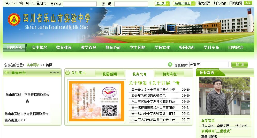 樂山市實驗中學坐落在樂山這座薈萃了名山、名水、名佛、名人,擁有世界雙遺產(chǎn)稱號的國際旅游城市里,1993年7月8日,經(jīng)樂山市人民政府編制委員會批準,成立樂山市一中初中部,1995年2月28日,經(jīng)市政府正式批準將學校命名為四川省樂山第一中學校一分校,為更好地適應學校發(fā)展的需要,1998年7月6日,經(jīng)市政府研究,同意將樂山第一中學校一分校更名為樂山市實驗中學。學校是樂山市教育局直屬的一所單設初級中學。學校占地63畝,依山傍水,寧靜清幽,宏偉的教學樓,嶄新的科技大樓,明亮的藝術廳,意蘊深遠的文化走廊,標準的運動場,優(yōu)雅靜謐的休閑讀書長廊,營造出雅致的育人環(huán)境。學校理念新穎,教風獨特。提出了“尊重人的秉賦與人格遵嚴,開啟學生發(fā)展的無限潛能” 的辦學宗旨;形成了 “優(yōu)教育人,優(yōu)學高效,優(yōu)長發(fā)展”的辦學理念; 凝練出 “求真、求善、求實、求美” 的校訓、“勤奮、敬業(yè)、務實、創(chuàng)新”的校風和“想學、勤學、樂學、會學”的學風;形成“教師教得靈活,學生學得愉快”的教學風格;確立“綜合素質(zhì)高,發(fā)展后勁足”的學生培養(yǎng)目標,建立“生命至上,打造開放型、創(chuàng)新型、示范型特色學?!?學校發(fā)展目標。學校特色鮮明,內(nèi)涵發(fā)展。創(chuàng)建了樂山市航空航模運動基地,科創(chuàng)中心、心理健康中心、信息技術中心、雛鷹藝術團等。著力打造校園“藝術節(jié)”、“科技節(jié)”、“讀書節(jié)”、“體育節(jié)”和“航模節(jié)”。學校師資一流,名師薈萃。我校擁有一支特級教師2名,省級骨干教師7名,市級骨干教師17名,中、高級教師占65%的強大師資陣容。學校實行“藍青工程”“名師工程”,“青年教師成長工程”,“科研興校工程”,努力造就一支師德高尚、業(yè)務精湛、結(jié)構合理、充滿活力的高素質(zhì)專業(yè)化教師隊伍。學校管理規(guī)范,質(zhì)量上乘。大力開展“陽光體育”運動,保證學生每天鍛煉一小時,不斷提高學生體質(zhì)健康水平。畢業(yè)二十一屆學生,連年榮獲樂山市教學質(zhì)量評估“一等獎”, 被市教科所授予全市初中教學質(zhì)量管理成就獎,升入國重、省重人數(shù)連年位居同類學校第一,素質(zhì)教育彰顯無限活力!學校聲譽鶴起、榮譽眾多。先后被評為全國文明單位、全國和諧校園先進單位、全國中小學中華優(yōu)秀文化藝術傳承學校、省教育工作先進集體、省《全民科學素質(zhì)行動計劃綱要》實施工作先進集體、省校風示范學校、省新成長型學校、省首批藝術教育特色學校、省陽光體育示范校、市示范性初中、市首批廉潔文化教育示范校、市首批依法治校示范校等。我們將以平和的心態(tài)做教育,堅守“辦適合學生的教育,走幸福教育之路”,我們在路上。