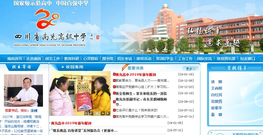 四川省南充高級中學是一所擁有九十年輝煌辦學歷史的巴蜀名校。學校于1927年由老一輩無產階級革命家、語言文字學家吳玉章先生創(chuàng)辦,1950年與張瀾先生創(chuàng)辦的私立建華中學合并,1952年被四川省人民政府正式命名為四川省南充高級中學。學校以悠久的歷史傳承、厚重的文化積淀、光榮的革命傳統(tǒng)、優(yōu)秀的師資隊伍、一流的教學設施、鮮明的辦學特色和輝煌的辦學業(yè)績而聞名遐邇。在教育面向現代化、面向世界、面向未來的新時代,學校秉承“弘揚誠勇、追求卓越”之校訓和張瀾先生“責在人先,利居人后”的箴言,堅守“辦人民滿意教育”之初心,形成了“知榮辱、明禮儀、會感恩、成大器”的育人理念和獨特的辦學傳統(tǒng),銳意改革創(chuàng)新,攻堅克難,負重拼搏,創(chuàng)造了一個又一個輝煌。學?,F擁有順慶、嘉陵兩個校區(qū),總面積達350余畝,校園環(huán)境優(yōu)美,設施齊備,功能完善,配備有全省一流的現代化辦學設施和高水準的師資隊伍。目前,學校在校學生11400余人,在職教職工608人,其中,特級教師11人,正高級教師7人,省級骨干教師35人,列全省首位。獲全國五一勞動獎章、全國優(yōu)秀教師等國家級表彰的達五十余人。研究生學歷教師超過30%,各科配備齊全,結構合理。教師師德高尚,專業(yè)技術過硬。學校大力實施“南高名師領航工程”和“卓越教師啟航工程”,通過課堂教學競賽活動、師徒結對子活動、教育科研論壇等活動,要求教師將素質教育、新課程理念等落實到課堂教學中去。自1997年以來,學校青年教師代表南充市參加全省初、高中教師教學競賽,所有學科均獲全省一等獎,人數居全省第一。學校高舉黨建旗幟,凝心聚力謀發(fā)展。學校是意識形態(tài)工作的重要陣地,南高始終堅持把所有工作置于黨委領導之下。認真學習貫徹落實黨的十九大、省委十一屆二次全會和市委六屆七次全會精神,制定了《南高黨委落實中央八項規(guī)定實施細則》。學校黨委深入調研,組織大討論,在教代會上通過了“百年南高夢”的奮斗目標,為學校發(fā)展指向引路,凝心聚力。協助校友成立了北美、北京、上海、華南、重慶、成都南高校友會,為南充學子搭梯建橋,攜手同行。組建了包括4名上市公司董事長和來自海內外科技界、法學界、文化界高端專家在內的“南高智庫”,為學校發(fā)展把脈會診,獻策建言。學校堅守育人初心,百花齊放抓發(fā)展。自1993年以來,學校一直是南充市普通高中教學質量綜合評估第一名,近十年就有140余名學生被清華、北大錄取。2017年,我校緊抓核心素養(yǎng)培育,強調過程管理、細節(jié)優(yōu)化,秉承建校時“首倡體育,尤重心理,關注思考,養(yǎng)成完全之人格”的理念,真正倡導全面發(fā)展。一方面,高考成績保持輝煌,實現了全市二十五連冠,保持了全省前列,在川東北地區(qū)獨領風騷:一本上線1884人,占全市一半以上,比上年增長14.25%,本科上線3223人,比上年增長21.99%,上一本線和本科線人數均位列全省第三。全市文科前十名占9人,全市理科前二十名占15人??偡?00分以上學生424人,占全省高分段人數約4%。15名學生被清華、北大錄取,占全省5%,列成綿之外19個地市州第一。學校獲得全市高中教育教學質量綜合評價一等獎和特殊貢獻獎。另一方面,素質教育成果豐碩。9名同學獲得全國奧賽一等獎,1人進入全國冬令營并奪得銀牌,2人奪得中國西部數學邀請賽金牌,獲得世界教育機器人大賽西南公開賽冠軍、全國中學英語電視大賽亞軍,“安漢國學社”獲評“全國優(yōu)秀中學生國學社團”。學校成為“全國優(yōu)秀財經素養(yǎng)教育基地”、“四川省共青團改革示范點”、“四川省文明校園”。在大力提倡實施素質教育和推行新課程改革的今天,南充高中堅持建校先賢“首倡體育,尤重心理”的理念,廣納少年俊秀,積極強化對學生的全面教育和素質培養(yǎng),特別注重競技體育與學校群眾體育事業(yè)的無縫對接。學校成立了“國家青少年體育俱樂部”, 2009年、2010年和2011年分別成功組織承辦了“全國中學生田徑錦標賽”、“四川省無線電測向錦標賽”和“全國學生定向越野錦標賽”,賽事組織工作得到各參賽單位和省教育廳、教育部學生體協領導的高度評價并取得良好的社會反響。學校田徑隊、籃球隊、射擊隊、無線電測向隊、定向越野隊等在全川名列前茅。田徑運動隊多次在全省奪冠,射擊隊員曹逸飛為中國隊拿下了2010年世界杯射擊賽澳大利亞站的首枚金牌,郭泥在馬來西亞遠南運動會上取得三金一銅佳績,無線電測向隊奪得比利時世界中學生無線電測向錦標賽金牌。學校是“中國中學生體育協會田徑分會先進會員”,被北京奧組委、教育部、省人民政府聯合授予“北京2008奧林匹克教育示范學?!狈Q號。2013年,學校被省教育廳正式命名并授牌為首批“四川省陽光體育示范學?!薄?017年,學校田徑隊在國家級比賽中獲4金3銀3銅,3人將代表中國參加摩洛哥世界中學生運動會,陳魯同學奪得全國少年羽毛球比賽單打冠軍,武術隊獲省團體第一,射擊隊奪得全國錦標賽團體亞軍,游泳隊在省錦標賽中獲8枚金牌,盧為入選跳水國家隊。學校獲評“全國青少年校園籃球特色學?!?,成為省田徑高水平后備人才共建基地。體育組教師參加南充市競教和教學大比武均獲第一名。我校是被省