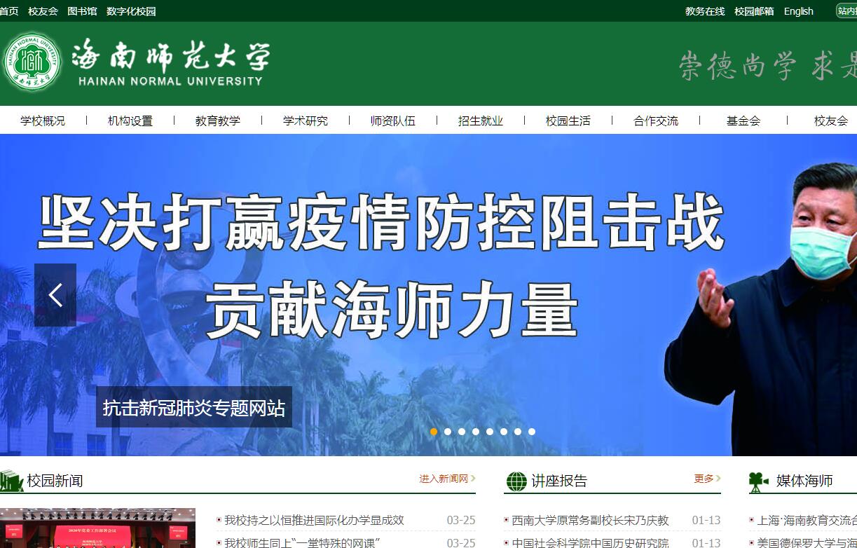 海南師范大學(xué)是海南省辦學(xué)歷史悠久、教師教育特色鮮明、綜合辦學(xué)實力較強(qiáng)的教育部、海南省人民政府共建高校,坐落在美麗的濱海旅游城市、國家歷史文化名城——??谑?。海南師范大學(xué)前身為建于清康熙四十四年(1705年)的瓊臺書院,1949年秋正式創(chuàng)建“國立海南師范學(xué)院”。1952年在高等學(xué)校院系調(diào)整中更名為海南師范專科學(xué)校。1983年重新招收本科,并與海南醫(yī)學(xué)院等單位合并組建海南大學(xué), 1986年經(jīng)原國家教委批準(zhǔn)恢復(fù)海南師范學(xué)院建制。1999年與海南教育學(xué)院合并,成立新的海南師范學(xué)院。2003年經(jīng)國務(wù)院學(xué)位委員會批準(zhǔn)為碩士學(xué)位授予權(quán)單位。2007年經(jīng)國家教育部批準(zhǔn)更名為海南師范大學(xué)。2009年海南省政府將學(xué)校列為省重點大學(xué)進(jìn)行建設(shè)。2013年經(jīng)國務(wù)院學(xué)位委員會批準(zhǔn)為博士學(xué)位授予權(quán)單位。2015年被列為教育部、海南省人民政府共建高校。六十多年來,學(xué)校始終秉承“崇德 尚學(xué) 求是 創(chuàng)新”的校訓(xùn)精神,以服務(wù)基礎(chǔ)教育和區(qū)域經(jīng)濟(jì)、社會發(fā)展為己任,在教師教育、海南和南海區(qū)域歷史文化、海南生態(tài)環(huán)境和特有物種保護(hù)、海南藥用植物開發(fā)研究等領(lǐng)域具有獨特地位,發(fā)展成為海南省教師教育中心,重要的高級應(yīng)用人才培養(yǎng)基地、科學(xué)研究基地和海南教育文化對外交流基地,為海南基礎(chǔ)教育、經(jīng)濟(jì)社會發(fā)展做出了突出貢獻(xiàn)。建校至今,已經(jīng)為社會培養(yǎng)了各類人才16萬多人,尤其是海南各中學(xué)校長、教學(xué)骨干多為我校畢業(yè)生,被譽(yù)為“瓊島名校,教師搖籃”。學(xué)校現(xiàn)設(shè)有21個學(xué)院,現(xiàn)有4個一級學(xué)科博士點,16個一級學(xué)科碩士點,9個專業(yè)學(xué)位碩士點,65個本科專業(yè)。形成了師范與非師范性專業(yè)協(xié)調(diào)發(fā)展、教育層次完整的人才培養(yǎng)體系。面向全國31個省(市、區(qū))招生?,F(xiàn)有全日制學(xué)生近2萬人,其中博士、碩士研究生731人,全日制本科生18551人,留學(xué)生449人。學(xué)校現(xiàn)有龍昆南、桂林洋、靈山三個校區(qū),占地面積約3100畝。教學(xué)科研儀器設(shè)備總值27342.23萬元。圖書館館藏紙質(zhì)圖書208.8萬冊,電子圖書128.02萬冊,各類中外文數(shù)據(jù)庫18個。數(shù)字化校園建設(shè)走在海南省前列,無線網(wǎng)絡(luò)覆蓋全校。學(xué)校突出抓好教學(xué)基本建設(shè),積極推進(jìn)教育教學(xué)綜合改革,取得顯著成效?,F(xiàn)建有國家級實驗教學(xué)示范中心1個,省級特色實驗教學(xué)示范中心1個,省級實驗教學(xué)示范中心5個,國家級大學(xué)生校外實踐教育基地1個,省級大學(xué)生校外實踐教育基地1個,省級特色實驗教學(xué)示范中心1個,國家級人才培養(yǎng)模式創(chuàng)新實驗區(qū)1個,國家專業(yè)綜合改革試點專業(yè)1個,國家級特色專業(yè)3個。學(xué)校大力實施科技創(chuàng)新驅(qū)動發(fā)展戰(zhàn)略,整體學(xué)術(shù)水平持續(xù)提升?,F(xiàn)有A類省級特色重點學(xué)科(特色優(yōu)勢學(xué)科)2個, B類省級特色重點學(xué)科(特色扶持學(xué)科)5個。有教育部重點實驗室2個,省級重點實驗室3個,教育部國別和區(qū)域研究中心1個,省級哲學(xué)社會科學(xué)重點研究基地7個,省級研究中心(院)4個,省級協(xié)同創(chuàng)新中心1個,省級院士工作站1個。國家大學(xué)科技園落戶學(xué)校。學(xué)校大力實施人才強(qiáng)校戰(zhàn)略,人才隊伍整體實力不斷增強(qiáng)。高級專業(yè)技術(shù)職務(wù)資格592人,其中正高226人,具有博士學(xué)歷325人。有國家突出貢獻(xiàn)專家、首批國家新世紀(jì)百千萬人才工程專家、教育部優(yōu)秀人才支持計劃人選、全國模范教師、全國優(yōu)秀教師、國務(wù)院特殊津貼專家及省級各類專家150多人。有教育部創(chuàng)新團(tuán)隊發(fā)展計劃培育團(tuán)隊1個,省級教學(xué)團(tuán)隊10個。學(xué)校積極擴(kuò)大對外交流與合作。成為中宣部首批部校共建新聞傳播學(xué)院(專業(yè))高校,與北京師范大學(xué)、東北師范大學(xué)、西南大學(xué)、黑龍江大學(xué)等多所高校建立合作關(guān)系,與??谑?、儋州市等地方政府建立戰(zhàn)略合作關(guān)系。在海外交流方面,我校已經(jīng)與超過60個國家、100多所高校和教育機(jī)構(gòu)開展了學(xué)術(shù)交流活動,與境外54所大學(xué)和教育機(jī)構(gòu)建立姐妹學(xué)校關(guān)系,與10所大學(xué)合作培養(yǎng)人才。2009年,孔子學(xué)院總部/國家漢辦批準(zhǔn)將東南亞漢語推廣師資培訓(xùn)基地落戶我校。2013年,經(jīng)教育部批準(zhǔn)為中國政府獎學(xué)金生接收院校。2015年,與馬來西亞世紀(jì)大學(xué)共建孔子學(xué)院順利揭牌。2017年中外合作項目俄羅斯圣彼得堡國立電視電影大學(xué)正式面向全國招收學(xué)生?!笆濉逼陂g,學(xué)校將搶抓國家“一帶一路”、國際旅游島建設(shè)等重大戰(zhàn)略機(jī)遇以及省部共建和省重點大學(xué)建設(shè)的契機(jī),以服務(wù)終身教育、服務(wù)綠色崛起和服務(wù)文化交流