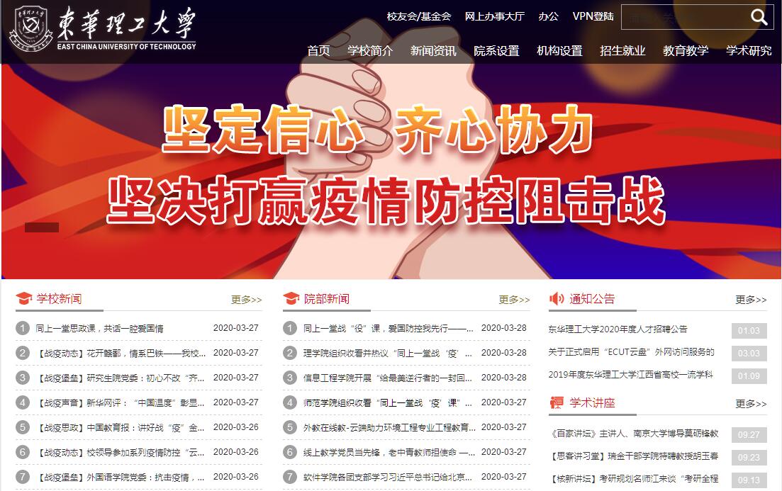 東華理工大學(xué)(原華東地質(zhì)學(xué)院),簡稱東華理工,創(chuàng)辦于1956年,是中國核工業(yè)第一所高等學(xué)校,是江西省人民政府與國家國防科技工業(yè)局、自然資源部、中國核工業(yè)集團(tuán)公司共建的具有地學(xué)和核科學(xué)特色,以理工為主,經(jīng)、管、文、法、教、藝兼?zhèn)涞亩嗫菩源髮W(xué),是教育部“卓越工程師教育培養(yǎng)計劃”試點(diǎn)高校、教育部“111計劃”入選高校、“中西部高?;A(chǔ)能力建設(shè)工程”支持高校,“新工科”研究與實(shí)踐項(xiàng)目入選高校、全國國防教育特色學(xué)校,是中國武警黃金指揮部士官、中國人民海軍士官選拔培訓(xùn)基地,中國核工業(yè)集團(tuán)公司、中國核工業(yè)建設(shè)集團(tuán)公司人才培養(yǎng)基地。學(xué)校始終堅持社會主義辦學(xué)方向,堅持國家利益至上、民族利益至上的宗旨,牢記服務(wù)國防軍工的歷史使命,堅持“為核成立、因核成名、以核成勢”的發(fā)展思路,高擎“核學(xué)”“地學(xué)”兩桿大旗,加速內(nèi)涵發(fā)展、強(qiáng)化學(xué)科特色,不斷提升核心競爭力,為我國核大國地位的確立、為國防科技工業(yè)發(fā)展和地方經(jīng)濟(jì)建設(shè)作出了重要貢獻(xiàn),被譽(yù)為“中國核地學(xué)人才搖籃”和“世界原子能事業(yè)的寶貴財富”,為國防軍工事業(yè)和江西省經(jīng)濟(jì)社會發(fā)展輸送了23萬余名各級各類專門人才,其中包括中科院院士和一大批政府部門領(lǐng)導(dǎo)、商界精英、科技領(lǐng)軍人才和高級技術(shù)專家。學(xué)?,F(xiàn)有南昌、撫州兩個校區(qū),校園總面積2500余畝。設(shè)有地球科學(xué)學(xué)院、地球物理與測控技術(shù)學(xué)院、水資源與環(huán)境工程學(xué)院、測繪工程學(xué)院、化學(xué)生物與材料科學(xué)學(xué)院、核科學(xué)與工程學(xué)院、機(jī)械與電子工程學(xué)院、信息工程學(xué)院、理學(xué)院、建筑工程學(xué)院、軟件學(xué)院、經(jīng)濟(jì)與管理學(xué)院、文法學(xué)院、外國語學(xué)院、撫州師范學(xué)院、馬克思主義學(xué)院、體育學(xué)院、藝術(shù)學(xué)院、研究生院、海軍后備軍官學(xué)院(武警士官學(xué)院)、國防科技學(xué)院(核能學(xué)院)、創(chuàng)新創(chuàng)業(yè)教育學(xué)院、國際教育學(xué)院、高等職業(yè)技術(shù)學(xué)院、繼續(xù)教育學(xué)院等20余個教學(xué)單位。學(xué)?,F(xiàn)有1個博士后科研流動站,1個博士后科研工作站,1個院士工作站,1個博士學(xué)位授權(quán)一級學(xué)科,19個一級學(xué)科碩士點(diǎn),6種專業(yè)學(xué)位授權(quán)類別,10個工程碩士授權(quán)領(lǐng)域,7個教育碩士授權(quán)領(lǐng)域,并具有同等學(xué)力人員碩士學(xué)位授予權(quán)?,F(xiàn)有68個本科專業(yè),其中54個本科專業(yè)面向全國招生,擁有國家級特色專業(yè)、國家卓越工程師教育培養(yǎng)計劃專業(yè)、中外合作辦學(xué)項(xiàng)目,具有來華留學(xué)生招收資格。擁有“十三五”國家國防特色學(xué)科5個,江西省“十三五”高校一流學(xué)科3個,教育部卓越工程師教育培養(yǎng)計劃工程碩士領(lǐng)域3個。資源勘查工程、勘查技術(shù)與工程、測繪工程3個專業(yè)通過工程教育論證,進(jìn)入全球工程教育“第一方陣”。學(xué)校由中國工程院錢七虎院士擔(dān)任名譽(yù)校長,現(xiàn)有教職員工2800余人,其中專任教師1400余人,教授、副教授600余人。教師中有中國科學(xué)院、中國工程院雙聘院士,“國家杰出青年科學(xué)基金項(xiàng)目”、國家“青年千人計劃”入選者,國家級“新世紀(jì)百千萬人才工程”人選,教育部新世紀(jì)優(yōu)秀人才,全國優(yōu)秀教師,“國務(wù)院特殊津貼獲得者”,江西“新世紀(jì)百千萬人才工程”人選,“贛鄱英才555工程人選”,江西省“井岡學(xué)者”,江西省“教學(xué)名師獎”獲得者,“江西省高等學(xué)校學(xué)科帶頭人”,“江西省高等學(xué)校骨干教師”,“江西省特殊津貼獲得者”等一批學(xué)術(shù)領(lǐng)軍人才。學(xué)校聘請了諾貝爾獎獲得者、美國科學(xué)院院士、俄羅斯科學(xué)院院士、俄羅斯總統(tǒng)顧問等200余名國內(nèi)外知名專家、學(xué)者為學(xué)校的兼職或客座教授。學(xué)校現(xiàn)有在校學(xué)生3萬余人。擁有放射性地質(zhì)國家級實(shí)驗(yàn)教學(xué)示范中心等高水平教學(xué)平臺和國家級“本科教學(xué)工程”大學(xué)生校外實(shí)踐教育基地。擁有省級教學(xué)團(tuán)隊7個,省級人才培養(yǎng)模式創(chuàng)新實(shí)驗(yàn)區(qū)3個,獲批碩士、本科層次“卓越工程師教育培養(yǎng)計劃”學(xué)科領(lǐng)域(專業(yè))國家級10個。近年來,獲得省級教學(xué)成果獎一等獎等獎項(xiàng)15項(xiàng)。學(xué)生在“挑戰(zhàn)杯”全國大學(xué)生課外學(xué)術(shù)科技作品競賽、“創(chuàng)青春”大學(xué)生創(chuàng)業(yè)大賽、全國大學(xué)生創(chuàng)新創(chuàng)業(yè)年會、美國大學(xué)生數(shù)學(xué)建模競賽等國際國內(nèi)各類賽事中,爭金奪銀,成績斐然。學(xué)校被授予全國大學(xué)生KAB創(chuàng)業(yè)教育基地、全國高校校園文化建設(shè)優(yōu)秀成果獎、全國五四紅旗團(tuán)委標(biāo)兵、 全國大學(xué