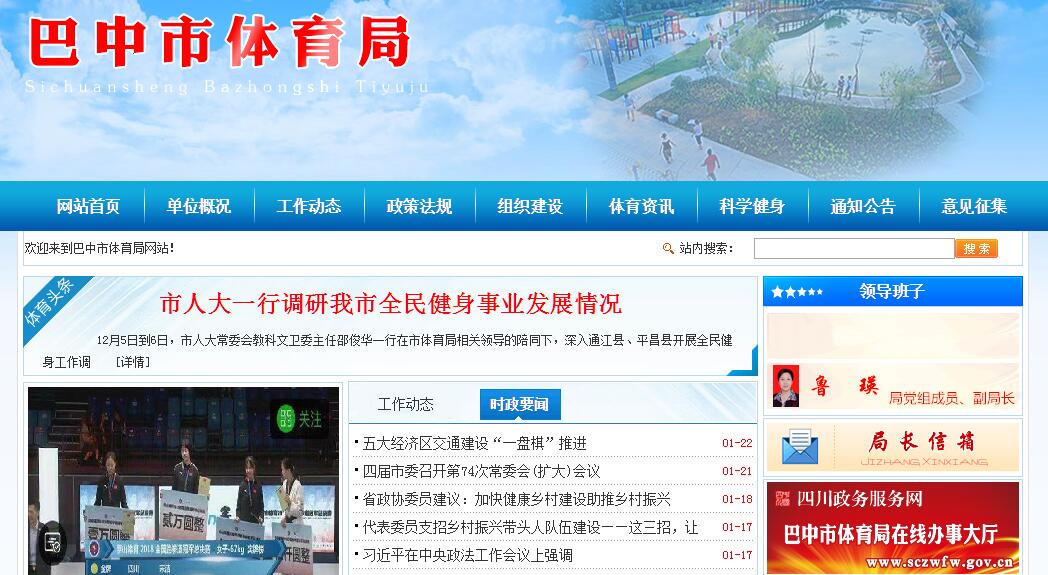 | 網站簡介: 根據(jù)市委、市政府機構改革的總體部署,巴中市體育局于2010年11月初正式設立,為市政府組成部門,下設市少年兒童業(yè)余體校,內設辦公室、項目科、體育科?,F(xiàn)有行政編制(含參公管理1人,機關工勤1人)人員8人,事業(yè)編制8人。近年來,市體育局圍繞市委重大發(fā)展戰(zhàn)略,以提升競技水平為目標,以增強人民體質為己任,以體育惠民為宗旨,著力在群眾體育、競技體育和體育產業(yè)上謀發(fā)展,不斷推進全市體育事業(yè)持續(xù)發(fā)展和全面進步。先后被評為全國全民健身活動先進單位、四川省體育彩票工作先進單位、省級最佳文明單位。 |