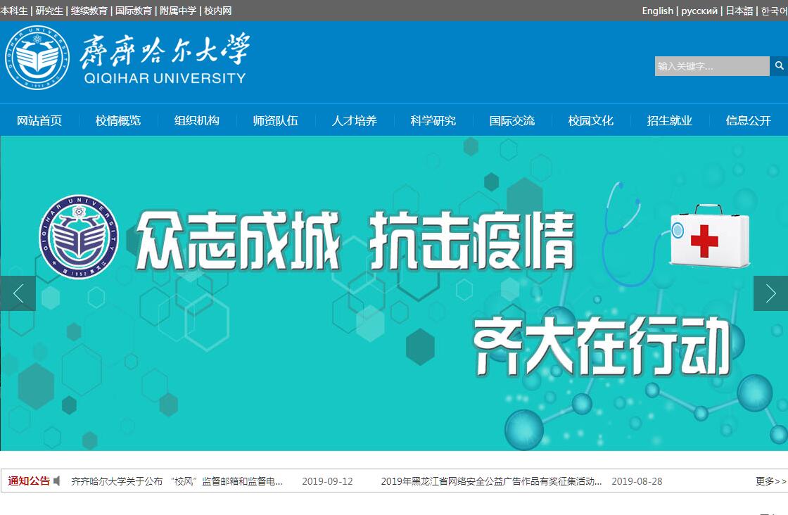 齊齊哈爾大學(xué)始建于1952年,是黑龍江省屬高水平綜合性大學(xué)。她坐落在嫩江之濱聞名遐爾的丹頂鶴故鄉(xiāng)--黑龍江省齊齊哈爾市勞動湖畔,占地面積126萬平方米,建筑面積75萬平方米,享有“環(huán)湖大學(xué)”的美譽(yù)。學(xué)校被省委、省政府授予“花園式學(xué)校”稱號,2007年榮獲教育部“高等學(xué)校本科教學(xué)工作水平評估優(yōu)秀學(xué)?!狈Q號,2008年榮獲全省“十佳和諧校園”稱號,2009年榮獲“全國精神文明建設(shè)工作先進(jìn)單位”稱號,黑龍江省“五一勞動獎狀”稱號,2011年、2015年、2017年連續(xù)三次榮獲“全國文明單位”稱號,是黑龍江省高教強(qiáng)省一期重點建設(shè)高校。學(xué)校植物性食品加工技術(shù)特色學(xué)科獲批省“雙一流”工程地方特色學(xué)科建設(shè)項目。學(xué)校已通過新增博士學(xué)位授予單位立項。近年來,齊齊哈爾大學(xué)實現(xiàn)了跨越式發(fā)展?,F(xiàn)有化學(xué)與化學(xué)工程學(xué)院、計算機(jī)與控制工程學(xué)院、理學(xué)院、文學(xué)與歷史文化學(xué)院、生命科學(xué)與農(nóng)林學(xué)院、美術(shù)與藝術(shù)設(shè)計學(xué)院、體育學(xué)院、外國語學(xué)院、經(jīng)濟(jì)與管理學(xué)院、輕工與紡織學(xué)院、機(jī)電工程學(xué)院、教育與傳媒學(xué)院、通信與電子工程學(xué)院、材料科學(xué)與工程學(xué)院、食品與生物工程學(xué)院、哲學(xué)與法學(xué)學(xué)院、音樂與舞蹈學(xué)院、建筑與土木工程學(xué)院、國際教育學(xué)院、應(yīng)用技術(shù)學(xué)院、繼續(xù)教育學(xué)院、馬克思主義學(xué)院等22個學(xué)院;還有高教研究中心(教師教學(xué)發(fā)展中心)、教學(xué)實驗設(shè)備管理中心(工程訓(xùn)練中心)、網(wǎng)絡(luò)信息中心、學(xué)術(shù)理論研究部、圖書館、資產(chǎn)運營管理中心等教輔單位。學(xué)?,F(xiàn)有76個本科招生專業(yè),隸屬11個學(xué)科門類,擁有4個國家級特色專業(yè),其中生物科學(xué)、化學(xué)工程與工藝為國家級專業(yè)綜合改革試點,高分子材料與工程、應(yīng)用化學(xué)為省級專業(yè)綜合改革試點;法學(xué)、高分子材料與工程、工商管理、過程裝備與控制工程、漢語言文學(xué)、化學(xué)工程與工藝、教育學(xué)、美術(shù)學(xué)、輕化工程、生物工程、生物科學(xué)、體育教育、服裝與服飾設(shè)計、音樂表演、應(yīng)用化學(xué)、英語、制藥工程等17個專業(yè)為省級重點專業(yè),21門課程獲評省級精品課程;18個一級學(xué)科碩士學(xué)位授權(quán)點,6個專業(yè)碩士學(xué)位授權(quán)類別(7個工程碩士授權(quán)領(lǐng)域,15個教育碩士授權(quán)領(lǐng)域,3個體育碩士授權(quán)領(lǐng)域,1個會計碩士授權(quán)領(lǐng)域)。食品科學(xué)與工程一級學(xué)科被批準(zhǔn)為高教強(qiáng)省優(yōu)勢特色學(xué)科。學(xué)校亞麻加工技術(shù)工程研發(fā)中心為教育部工程研究中心,表面活性劑與工業(yè)助劑實驗室、玉米深加工理論與技術(shù)實驗室為黑龍江省重點實驗室,精細(xì)化工實驗室和農(nóng)產(chǎn)品加工實驗室為省高校重點實驗室,嫩江流域歷史文化研究基地為省哲學(xué)社會科學(xué)研究基地;學(xué)校農(nóng)產(chǎn)品(玉米)加工工程技術(shù)研發(fā)中心、大豆精深加工研發(fā)中心、亞麻加工技術(shù)工程研發(fā)中心、通用聚合物復(fù)合改性工程技術(shù)研發(fā)中心4個中心為省高校工程技術(shù)研發(fā)中心,擔(dān)任黑龍江省玉米深加工產(chǎn)業(yè)技術(shù)創(chuàng)新戰(zhàn)略聯(lián)盟理事長單位;精細(xì)化工培訓(xùn)中心和糧油食品加工技術(shù)培訓(xùn)中心為省級振興東北老工業(yè)基地人才培訓(xùn)中心。學(xué)校還擁有1個省級人才培養(yǎng)模式創(chuàng)新實驗區(qū)、3個省級實驗教學(xué)示范中心和4個省級研究生培養(yǎng)創(chuàng)新示范基地,并在北京設(shè)有研發(fā)中心?,F(xiàn)有專任教師1438人,其中教授、副教授700人,擁有博士、碩士學(xué)位的教師占專任教師總數(shù)的82.2%,博士生、碩士生導(dǎo)師191人,聘有外籍教師39人。教師中當(dāng)選俄羅斯科學(xué)院外籍院士的教師1人,“龍江學(xué)者”特聘教授3人,享受國務(wù)院政府特殊津貼專家18人,享受省政府特殊津貼專家4人,獲得“全國優(yōu)秀教師”、“全國模范教師”等國家級、省部級榮譽(yù)稱號者30余人,省級教學(xué)名師5人,省級教學(xué)團(tuán)隊3個。學(xué)??茖W(xué)研究工作效果顯著。近五年來,先后獲批各類各級科研課題1218項,其中國家、省部級課題236項,榮獲省部級以上獎勵31項,發(fā)表在核心刊物和被三大檢索系統(tǒng)檢索的高水平學(xué)術(shù)論文逐年遞增。學(xué)校面向全國30個省、自治區(qū)、直轄市招生,在校生總數(shù)25294人,其中本科生24135人,研究生987人,留學(xué)生172人,另有成人生8920人。學(xué)校擁有先進(jìn)的教學(xué)條件和設(shè)施。圖書館藏書277萬冊,電子圖書81萬冊,中外數(shù)據(jù)庫34個,社科、外文資料等專門閱覽室5個;建有網(wǎng)絡(luò)多媒體教室和現(xiàn)代語言實驗室共計134間,每個多媒體教室均具有主播教室功能,網(wǎng)絡(luò)多媒體教學(xué)系統(tǒng)主控室實現(xiàn)了多媒體教室集中管理