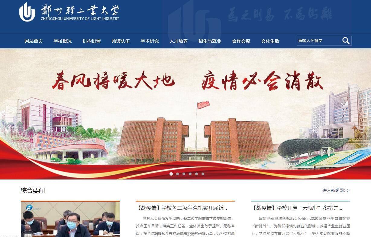 鄭州輕工業(yè)學(xué)院位于河南省會(huì)鄭州市,是河南省重點(diǎn)建設(shè)高校。建校以來,學(xué)校秉承“為之則易、不為則難”的校訓(xùn),抓住國家促進(jìn)高等教育發(fā)展的歷史機(jī)遇,不斷開拓創(chuàng)新、砥礪奮進(jìn),經(jīng)過40多年的發(fā)展,已經(jīng)成為一所以工為主,工、理、文、藝、經(jīng)、管、法、教、農(nóng)等多學(xué)科協(xié)調(diào)發(fā)展的普通本科院校。學(xué)校創(chuàng)建于1977年,原隸屬國家輕工業(yè)部;1998年轉(zhuǎn)屬河南省人民政府;2009年被列為河南省博士學(xué)位授予單位立項(xiàng)建設(shè)高校;2011年河南省人民政府和國家煙草專賣局簽約共建鄭州輕工業(yè)學(xué)院;2018年被確定為河南省博士學(xué)位授予重點(diǎn)立項(xiàng)建設(shè)單位。學(xué)校辦學(xué)特色鮮明,學(xué)科優(yōu)勢突出,近年來,大力推進(jìn)教育教學(xué)改革,不斷調(diào)整優(yōu)化學(xué)科專業(yè)結(jié)構(gòu),教育質(zhì)量穩(wěn)步提高。學(xué)校擁有14個(gè)一級學(xué)科碩士授權(quán)點(diǎn)、11個(gè)二級學(xué)科碩士授權(quán)點(diǎn)。學(xué)?,F(xiàn)有65個(gè)本科專業(yè),其中4個(gè)國家級特色專業(yè)建設(shè)點(diǎn),1個(gè)國家級專業(yè)綜合改革試點(diǎn)專業(yè),6個(gè)教育部“卓越工程師教育培養(yǎng)計(jì)劃”試點(diǎn)專業(yè),14個(gè)省級特色專業(yè)建設(shè)點(diǎn),13個(gè)省級專業(yè)綜合改革試點(diǎn)專業(yè),有20門國家級和省級精品課程、10門省級精品資源共享課程、1門省級精品視頻公開課、4門省級雙語示范課程,有8個(gè)省級教學(xué)團(tuán)隊(duì)、11個(gè)省級實(shí)驗(yàn)教學(xué)示范中心。學(xué)校高度重視學(xué)科建設(shè),主動(dòng)適應(yīng)經(jīng)濟(jì)社會(huì)和行業(yè)發(fā)展需要,不斷凝練學(xué)科方向,突出學(xué)科特色。目前擁有河南省優(yōu)勢特色學(xué)科“食品科學(xué)與工程”,省級一級學(xué)科重點(diǎn)學(xué)科14個(gè)、省級二級學(xué)科重點(diǎn)學(xué)科3個(gè),食品科學(xué)與工程、化學(xué)工程與技術(shù)、電氣工程、機(jī)械工程等傳統(tǒng)優(yōu)勢學(xué)科實(shí)力雄厚。師資隊(duì)伍 學(xué)校始終堅(jiān)持辦學(xué)以人才為本、以教師為主體,大力推進(jìn)人才強(qiáng)校戰(zhàn)略,匯聚和造就了一批高水平學(xué)科帶頭人和學(xué)術(shù)骨干。學(xué)校現(xiàn)有教職工1800余人,其中擁有博士學(xué)位教師600余人。擁有雙聘院士、國家“千人計(jì)劃”人選、國家“萬人計(jì)劃”教學(xué)名師、河南省“百人計(jì)劃”人選、省級特聘教授、享受政府津貼專家、省管優(yōu)秀專家、省級中青年骨干教師、省廳級以上學(xué)術(shù)技術(shù)帶頭人等200余人,形成了以院士及河南省特聘教授為核心,以學(xué)術(shù)造詣深厚的教授、博士為中堅(jiān),以中青年教師為支撐的專業(yè)技術(shù)職務(wù)、學(xué)歷層次和年齡結(jié)構(gòu)比較合理,專兼結(jié)合,具有較高教學(xué)科研水平的師資隊(duì)伍。學(xué)校持續(xù)推進(jìn)“招生-培養(yǎng)-就業(yè)”聯(lián)動(dòng)改革,人才培養(yǎng)質(zhì)量穩(wěn)步提升。學(xué)校現(xiàn)有在校生20000余人。學(xué)校一直面向全國招生,已為國家輸送 10 余萬名畢業(yè)生,畢業(yè)生整體就業(yè)率始終保持在95%以上,學(xué)校被評為“全國畢業(yè)生就業(yè)典型經(jīng)驗(yàn)高校”“河南省普通高校畢業(yè)生就業(yè)工作優(yōu)秀單位”和“河南最具就業(yè)競爭力示范院?!?。全國煙草行業(yè)、家電行業(yè)、電池行業(yè)、食品行業(yè)、工業(yè)設(shè)計(jì)行業(yè)的大批中高層管理人員和技術(shù)骨干都是我校的畢業(yè)生。學(xué)校獲得“全國貫徹《學(xué)校體育工作條例》優(yōu)秀高等學(xué)?!薄叭珖咝\娪?xùn)先進(jìn)單位”“河南公眾最滿意的十佳本科院?!薄昂幽献罹哂绊懥Φ氖蠼逃放啤薄昂幽峡忌哪恐凶罾硐氲母咝!钡葮s譽(yù)稱號??茖W(xué)研究 學(xué)校設(shè)有環(huán)境污染治理與生態(tài)修復(fù)河南省協(xié)同創(chuàng)新中心、食品生產(chǎn)與安全河南省協(xié)同創(chuàng)新中心、河南省信息化電器重點(diǎn)實(shí)驗(yàn)室、河南省表界面科學(xué)重點(diǎn)實(shí)驗(yàn)室、河南省機(jī)械裝備智能制造重點(diǎn)實(shí)驗(yàn)室、國家煙草專賣局煙草工業(yè)生物技術(shù)重點(diǎn)實(shí)驗(yàn)室、應(yīng)急平臺(tái)信息技術(shù)河南省工程實(shí)驗(yàn)室等省部級學(xué)科平臺(tái)27個(gè),加入了河南省國家大學(xué)科技園。學(xué)校擁有1個(gè)教育部科技創(chuàng)新團(tuán)隊(duì)、15個(gè)河南省科技創(chuàng)新團(tuán)隊(duì)。近五年,承擔(dān)包括國家科技支撐計(jì)劃項(xiàng)目、國家自然科學(xué)基金項(xiàng)目和國家社會(huì)科學(xué)基金項(xiàng)目在內(nèi)的各類縱橫向科研項(xiàng)目1800多項(xiàng),其中承擔(dān)國家級科研課題200余項(xiàng),獲國家級科技獎(jiǎng)勵(lì)3項(xiàng)、省部級獎(jiǎng)勵(lì)90余項(xiàng)。自然科學(xué)研究論文被SCI、EI、ISTP收錄的數(shù)量1000余篇,出版專著和教材400余部?!遁p工學(xué)報(bào)》是中國科技核心期刊、中國高校優(yōu)秀科技期刊;《鄭州輕工業(yè)學(xué)院學(xué)
