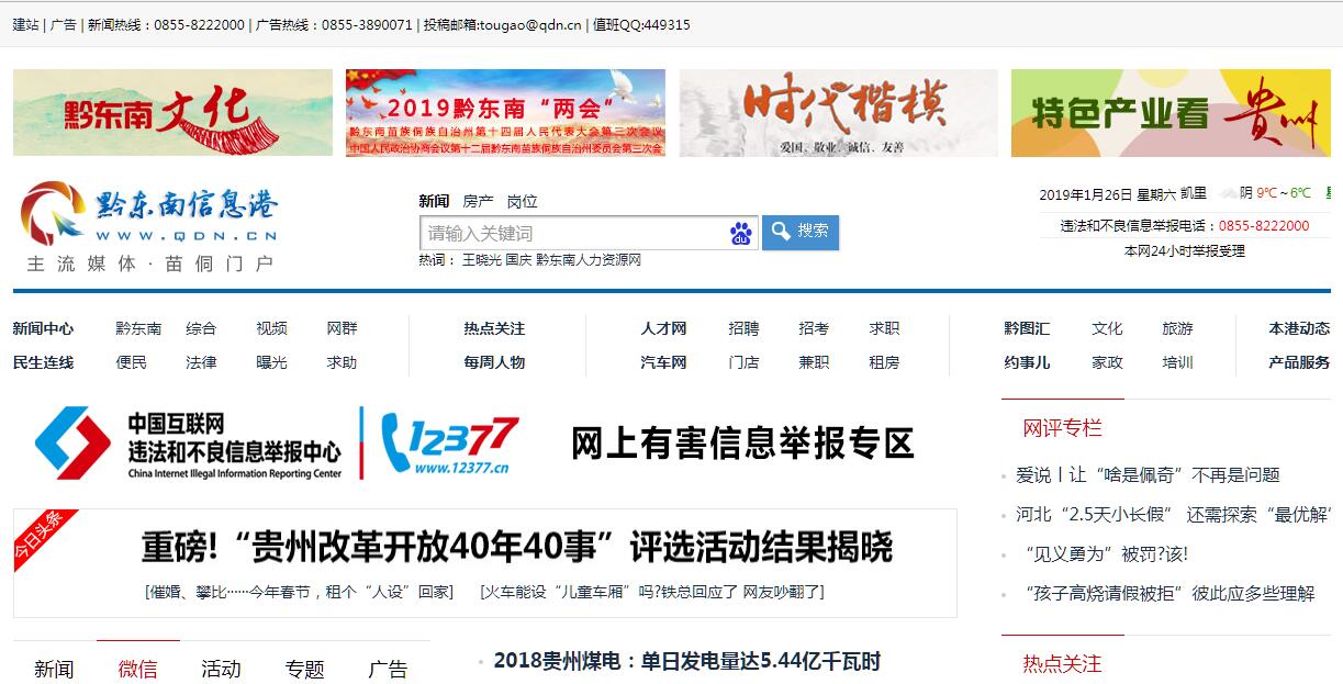 黔東南信息港,黔東南人自己的網(wǎng)站,新興的第四代媒體。黔東南最大、最權(quán)威、最專業(yè)的網(wǎng)絡(luò)媒體www.qdn.cn,最新最快最廣傳播黔東南時(shí)政、動(dòng)態(tài)、信息。黔東南信息港成立于2003年8月,是中共黔東南州委宣傳部、黔東南州人民政府新聞辦、中共黔東南州委外宣辦主管下的黔東南最大的一個(gè)門戶網(wǎng)站,是對(duì)內(nèi)和對(duì)外展示宣傳黔東南的一個(gè)重要窗口和平臺(tái)。建設(shè)數(shù)字化黔東南,打造黔東南 “新聞眼”、“信息眼”。黔東南信息港主要擔(dān)負(fù)著黔東南州黨政和人民耳目喉舌、對(duì)外宣傳、信息總匯等職能,并通過互聯(lián)網(wǎng)平臺(tái)發(fā)揮傳播職能。黔東南信息港設(shè)置有“黔東南新聞”、“百姓呼聲”、“曝光臺(tái)”、“人物訪談”、“文學(xué)村”、“信息”等10多個(gè)欄目,全方位、多角度地宣傳黔東南的時(shí)政時(shí)事、社會(huì)動(dòng)態(tài)、重大活動(dòng)、人文史實(shí)、民風(fēng)民俗、自然風(fēng)光、景區(qū)景點(diǎn)等,關(guān)注民生、聚焦社會(huì)熱點(diǎn)、反映百姓呼聲、傳播先進(jìn)文化、把握市場脈搏。黔東南信息港編輯部已經(jīng)形成多渠道、多層次、多功能的新聞信息發(fā)布體系,每日均發(fā)布新聞信息20多條,圖片10多張,向全世界宣傳黔東南的時(shí)事、資源、旅游、文化、人文等,成為黔東南州對(duì)外宣傳的一個(gè)重要陣地。完成了州委、州政府下達(dá)的凱里“文明城市”創(chuàng)建、凱里“全國優(yōu)秀旅游城市”創(chuàng)建、凱里國際蘆笙節(jié)、臺(tái)江“姊妹節(jié)”、雷山“苗年節(jié)”、黎從榕“侗族大歌節(jié)”、“多彩貴州”、黎平機(jī)場通航、黔東南州建州50周年大慶、凱里原生態(tài)民族文化節(jié)等活動(dòng)的對(duì)外宣傳任務(wù)。黔東南信息港技術(shù)部從事網(wǎng)站建設(shè)維護(hù)、系統(tǒng)開發(fā)、廣告制作。黔東南信息港市場部構(gòu)建黔東南網(wǎng)絡(luò)市場和咨訊市場,專業(yè)從事廣告發(fā)布、企業(yè)包裝、品牌推廣、精品策劃、理念展示等。從2003年8月至今五年多來,黔東南信息港總訪問量已達(dá)2000多萬人次,平均每天2萬多人次。在中國網(wǎng)站排名貴州地區(qū)網(wǎng)站中居前10位,排前列。目前在黔東南所有網(wǎng)站中排名第一。
