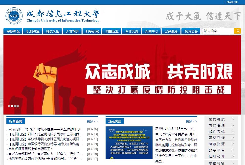 成都信息工程大學(xué)是四川省和中國氣象局共建、四川省重點發(fā)展的省屬普通本科院校。學(xué)校創(chuàng)建于1951年,前身為中國人民解放軍西南空軍氣象干部訓(xùn)練大隊;1954年轉(zhuǎn)為地方建制,更名為中央氣象局成都?xì)庀蟾刹繉W(xué)校;1956年,學(xué)校改制為中央氣象局成都?xì)庀髮W(xué)校;1978年,學(xué)校升格為本科院校——成都?xì)庀髮W(xué)院;2000年,學(xué)校由中國氣象局劃轉(zhuǎn)四川省,更名為成都信息工程學(xué)院;2001年,原隸屬國家統(tǒng)計局的四川統(tǒng)計學(xué)校整體并入;2015年,學(xué)校更名為成都信息工程大學(xué)。學(xué)校是國家中西部基礎(chǔ)能力建設(shè)工程高校、國家首批“卓越工程師教育培養(yǎng)計劃”試點院校、四川省首批“一流學(xué)科建設(shè)”高校、四川省新增博士學(xué)位授予單位建設(shè)高校。學(xué)?,F(xiàn)有航空港、龍泉兩個校區(qū),占地面積2000余畝。學(xué)校擁有館藏豐富的圖書館和設(shè)施齊備的現(xiàn)代化體育場館,校園環(huán)境幽雅,景色宜人,是讀書治學(xué)的理想場所。學(xué)校致力于為國家培養(yǎng)具有健康心智體魄、良好人文素質(zhì)、系統(tǒng)理論知識、扎實實踐能力的高素質(zhì)應(yīng)用型高級專門人才,人才培養(yǎng)成效顯著?,F(xiàn)設(shè)有17個學(xué)院,55個本科專業(yè),有20000余名全日制在校本科生和2000余名研究生,有6個國家級和省級教學(xué)團(tuán)隊、13名省級優(yōu)秀教師和教學(xué)名師,有8個教育部“卓越工程師教育培養(yǎng)計劃”試點專業(yè)和9個省級“卓越工程師教育培養(yǎng)計劃”試點專業(yè)。近兩屆獲得國家級教學(xué)成果二等獎2項、省級教學(xué)成果一等獎13項。學(xué)校借鑒國際CDIO工程教育理念,大力推進(jìn)教育教學(xué)改革,是中國西部高校唯一的國際CDIO組織正式成員。學(xué)校全面加強(qiáng)學(xué)科建設(shè),學(xué)科特色與優(yōu)勢日益凸顯。學(xué)校以信息學(xué)科和大氣學(xué)科為重點,以學(xué)科交叉為特色,以工學(xué)、理學(xué)、管理學(xué)為主要學(xué)科門類,工、理、管、經(jīng)、文、法、藝多學(xué)科協(xié)調(diào)融合發(fā)展?,F(xiàn)有5個省級重點學(xué)科,11個碩士學(xué)位授權(quán)一級學(xué)科,6個碩士專業(yè)學(xué)位授權(quán)類別,形成了大氣、信息、現(xiàn)代服務(wù)三大學(xué)科群。學(xué)校面向世界科技前沿和國家重大需求開展科學(xué)研究,科研水平和服務(wù)社會能力持續(xù)攀升?,F(xiàn)有博士后科研工作站1個、省部級重點實驗室12個(含省工程技術(shù)研究中心、哲社重點研究基地、協(xié)同創(chuàng)新中心)、省高校重點實驗室和人文社科重點研究基地11個。近五年學(xué)校承擔(dān)了國家科技計劃、國家自然科學(xué)基金、國家社會科學(xué)基金等國家級項目171項;獲省部級及以上科研獎76項,其中國家科技進(jìn)步二等獎5項。學(xué)校大力加強(qiáng)師資隊伍建設(shè),師資力量不斷壯大?,F(xiàn)有專任教師1200余人,其中博士420余人,高級職稱550余人,有全國“百千萬人才工程”、國家有突出貢獻(xiàn)中青年專家、享受國務(wù)院政府特殊津貼專家、四川省學(xué)術(shù)和技術(shù)帶頭人、四川省有突出貢獻(xiàn)的優(yōu)秀專家、四川省“千人計劃”專家等80余人,聘有100余名院士、長江、杰青等高層次專家為我校兼職教授。本校教師擔(dān)任校外兼職博士生導(dǎo)師20余人,比較有影響力的主要學(xué)術(shù)兼職46項。學(xué)校認(rèn)真貫徹國家新時期教育對外開放工作及“一帶一路”對教育國際化的要求,堅持開放辦學(xué)。與美國、英國、德國、澳大利亞、新加坡等國的40余所知名高校和科研機(jī)構(gòu)簽署合作協(xié)議,與美國科羅拉多州立大學(xué)等國外知名高校合作建立國際聯(lián)合實驗室(聯(lián)合研究院),在教學(xué)、科研以及人才培養(yǎng)等領(lǐng)域開展全方位、多層次的國際交流與合作,學(xué)校教育國際化水平不斷提高。面向未來,學(xué)校將繼續(xù)秉承“成于大氣,信達(dá)天下”的大學(xué)精神,以人為本,追求卓越,努力為服務(wù)國家戰(zhàn)略需求和區(qū)域經(jīng)濟(jì)社會發(fā)展做出更多更大貢獻(xiàn)。