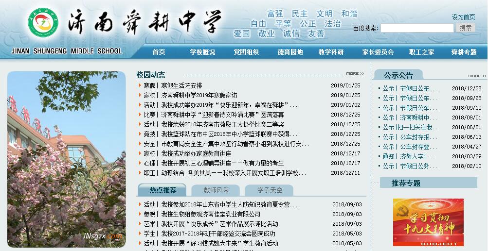濟(jì)南舜耕中學(xué)建于1990年,是濟(jì)南市教育局直屬學(xué)校;位于風(fēng)景秀麗的千佛山西南,占地面積為2.8萬平方米;現(xiàn)有36個初中教學(xué)班,在校學(xué)生1800余人,在職教職工135人。學(xué)校牢固樹立“以人為本,凝心聚力,成就師生,發(fā)展學(xué)?!钡霓k學(xué)宗旨,踐行“載舜華德,志耕天下”的校訓(xùn),確立了“創(chuàng)建規(guī)模適當(dāng)、設(shè)施先進(jìn)、環(huán)境優(yōu)美、師生和諧、高質(zhì)量、有特色、有品位的學(xué)校”的發(fā)展目標(biāo),在辦學(xué)水平上不斷取得新的突破。學(xué)校重視教師隊(duì)伍建設(shè),倡導(dǎo)良好師德,實(shí)施“三大工程”(青年教師成才工程、“名師”建設(shè)工程和教師崗位繼續(xù)教育工程),提升教師素質(zhì)。現(xiàn)有省特級教師1名、優(yōu)秀教師2名、教學(xué)能手2名,市優(yōu)秀教師2名、教學(xué)能手4名、優(yōu)秀班主任10名、師德先進(jìn)個人4名、學(xué)科帶頭人3名。堅(jiān)持“育人為本,德育為先”,強(qiáng)化德育是所有教育者責(zé)任的意識,讓所有的教師都成為“班主任”。重視學(xué)生的知書達(dá)理教育、心理健康教育、信心教育和感恩教育,引導(dǎo)學(xué)生“學(xué)會做人,學(xué)會求知,做最好的自己”。突出教學(xué)中心,深化課程改革,建立了“必修課+選修課+校本課程+活動課+特長課”五位一體的課程體系;面向全體學(xué)生,實(shí)行分層教學(xué),打造有效課堂,使學(xué)生個性得到充分發(fā)展,知識水平、學(xué)習(xí)能力全面提高。學(xué)校獲得國際生態(tài)學(xué)校,創(chuàng)建國家級綠色學(xué)校先進(jìn)單位,國家級語言文字規(guī)范化示范校,山東省規(guī)范化學(xué)校、教學(xué)示范學(xué)校、心理健康教育先進(jìn)學(xué)校、科普示范學(xué)校、藝術(shù)教育示范學(xué)校、家庭教育先進(jìn)學(xué)校、教育系統(tǒng)行風(fēng)建設(shè)先進(jìn)單位、體育傳統(tǒng)項(xiàng)目學(xué)校(籃球、足球),濟(jì)南市教書育人先進(jìn)單位、德育規(guī)范化學(xué)校、義務(wù)教育課程改革先進(jìn)學(xué)校等稱號。