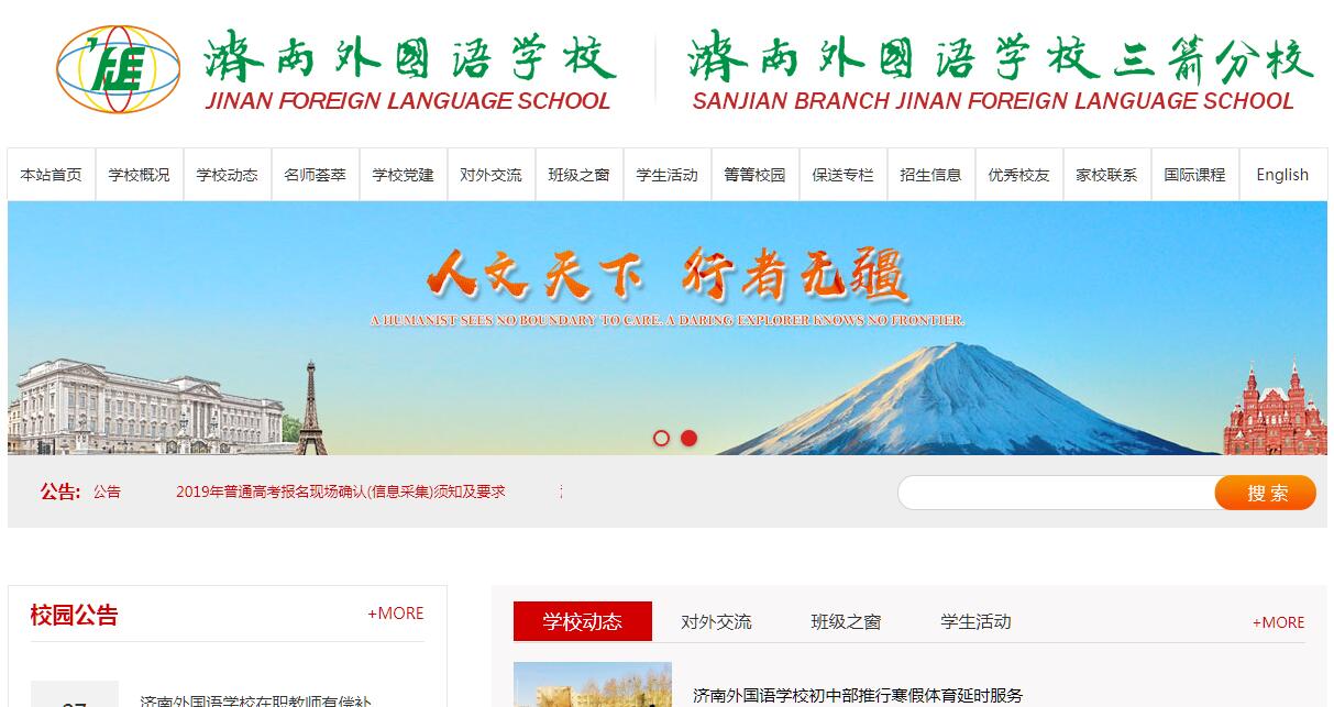 濟南外國語學(xué)校創(chuàng)建于1989年,是山東省唯一在教育部備案的外國語學(xué)校。2001年成為教育部確定的具有向重點高校直接輸送保送生資格的全國17所外國語學(xué)校之一,是一所突出外語特色、文理并重、與國際接軌的完全中學(xué)。 1996年,我校與山東三箭置業(yè)集團總公司合作創(chuàng)辦了濟南外國語學(xué)校三箭分校,系由三箭置業(yè)集團投資創(chuàng)辦、濟南外國語學(xué)校負責(zé)全方位管理的民辦完全中學(xué);2001年,我校與濟南環(huán)山房地產(chǎn)開發(fā)有限公司合作創(chuàng)辦了濟南外國語學(xué)校開元國際分校,是一所民辦全日制寄宿制小學(xué);2004年,我校與濟南外海房地產(chǎn)開發(fā)有限公司簽署委托管理協(xié)議,負責(zé)派出教育管理人員對濟南市外海實驗學(xué)校實施管理。2012年、2013年和2017年,我校又先后受托管理槐蔭區(qū)陽光100中學(xué)、泉新學(xué)校和歷城區(qū)瓏城中學(xué)、瓏城小學(xué)、華山小學(xué),均為公辦義務(wù)教育學(xué)校。目前共擁有9個校區(qū),432個教學(xué)班,在校生18400余人,是濟南市基礎(chǔ)教育管理規(guī)模最大的學(xué)校(教育集團)。學(xué)校遵循“致力于每一位學(xué)生的健康成長”的辦學(xué)理念,以面向全體學(xué)生,全面提高學(xué)生素質(zhì)為辦學(xué)宗旨,以全面推進素質(zhì)教育為主題,以提高教學(xué)質(zhì)量為中心,突出外語特色優(yōu)勢和外向型發(fā)展態(tài)勢,堅持科學(xué)發(fā)展、內(nèi)涵發(fā)展、特色發(fā)展和可持續(xù)發(fā)展,努力培養(yǎng)具有中華根基、國際視野、跨文化交流能力的復(fù)合型后備人才。 學(xué)校樹立全面的教學(xué)質(zhì)量意識和課程意識,遵循面向全體、夯實基礎(chǔ)、扎實推進、促進發(fā)展的教學(xué)指導(dǎo)思想,強化教學(xué)精細化管理和全程管理,不斷打造富于自身特色、促進學(xué)生全面發(fā)展的學(xué)校課程體系。 學(xué)校重視師德建設(shè)和教師專業(yè)素質(zhì)發(fā)展,實施“繼續(xù)教育”工程,促使教師向?qū)W者型、研究型、專家型教師轉(zhuǎn)變,建立了一支師德高尚、業(yè)務(wù)精湛的教師隊伍。學(xué)校擁有全國優(yōu)秀教師2人,省特級教師5人,省優(yōu)秀教師5人,省教學(xué)能手10人,市先進工作者1人,市勞動模范1人,市拔尖人才5人,市優(yōu)秀教師7人,市教學(xué)能手25人,濟南市名師1人,濟南市名師人選2人,市學(xué)科帶頭人9人,濟南市優(yōu)秀班主任工作室成員4人,市優(yōu)秀班主任30人,省、市級優(yōu)質(zhì)課評比獲獎?wù)甙儆嗳?。作為外國語學(xué)校,目前除開設(shè)國家規(guī)定的普通中學(xué)全部課程外,還開設(shè)了日語、俄語、法語、德語、西班牙語5個非通用語種,開設(shè)雙外語課程實驗項目。外語教學(xué)使用國外原版教材,采用“聽說領(lǐng)先、讀背跟進、帶動寫譯、情景交融、實踐延伸”模式,聘請外籍教師任教,實行多課時、小班化教學(xué)。學(xué)校開設(shè)A-Level、AP國際課程項目和日本關(guān)西語言學(xué)院聯(lián)合培養(yǎng)項目、德國留學(xué)預(yù)備課程項目、俄羅斯留學(xué)預(yù)備課程項目,設(shè)有新加坡國立大學(xué)招生(SM2)項目、法國INSA招生項目、德國北威州大學(xué)招生項目,在加拿大多倫多大學(xué),美國科羅拉多州立大學(xué)、加州大學(xué)貝克斯菲爾德分校,日本立命館大學(xué)、同志社大學(xué)、法政大學(xué)建有綠色通道項目。作為濟南教育對外開放的窗口學(xué)校,學(xué)校努力推進國際化建設(shè),創(chuàng)建通向國外名牌大學(xué)的通道。學(xué)校校園文化建設(shè)凸顯民族文化底色、外語學(xué)習(xí)氛圍、志愿服務(wù)風(fēng)尚、書香學(xué)府和綠色校園五個主題。學(xué)校注重發(fā)揮學(xué)生在德育實踐活動中的主體作用,初高中現(xiàn)有學(xué)生社團100余個,致力于實現(xiàn)學(xué)生的自我管理、自我服務(wù)、自我完善、自我發(fā)展。學(xué)校積極開展對外交流與合作,與法國左拉中學(xué)、俄羅斯下諾67中學(xué)、加拿大Parkview中學(xué)、芬蘭赫爾辛格中學(xué)、德國嘉德堡高中、美國康州Windsor Locks高中、日本野田學(xué)園初高中等11所學(xué)校建立友好學(xué)校關(guān)系,與德國亞琛應(yīng)用技術(shù)大學(xué),加拿大蒙特利爾商學(xué)院,俄羅斯沃羅涅日大學(xué)、伏爾加國立工業(yè)大學(xué)等國外大學(xué)簽訂合作協(xié)議,與法國雷恩濟南友協(xié)委員會、日本九洲交通旅游局、加拿大哥倫比亞國際學(xué)院等建立合作意向。學(xué)校治學(xué)嚴謹,管理規(guī)范,具有良好的社會聲譽。學(xué)校是全國未成年人思想道德建設(shè)工作先進單位、全國“爭先創(chuàng)優(yōu)”先進基層黨組織、全國中小學(xué)外語教研工作示范學(xué)校、全國校本德育創(chuàng)新基地、全國誠信示范院校、全國青少年校園足球特色學(xué)校、山東省教育系統(tǒng)先進集體、省文明單位、省規(guī)范化學(xué)校、省教學(xué)示范學(xué)校、省中小學(xué)德育工作先進單位、省師德建設(shè)先進單位、省校本研究先進單位、省家庭教育示范基地、省國際交流和合作先進單位、省教育工會先進集體、省消防安全示范學(xué)校、省國防教育先進單位,獲評山東省扶貧開發(fā)基