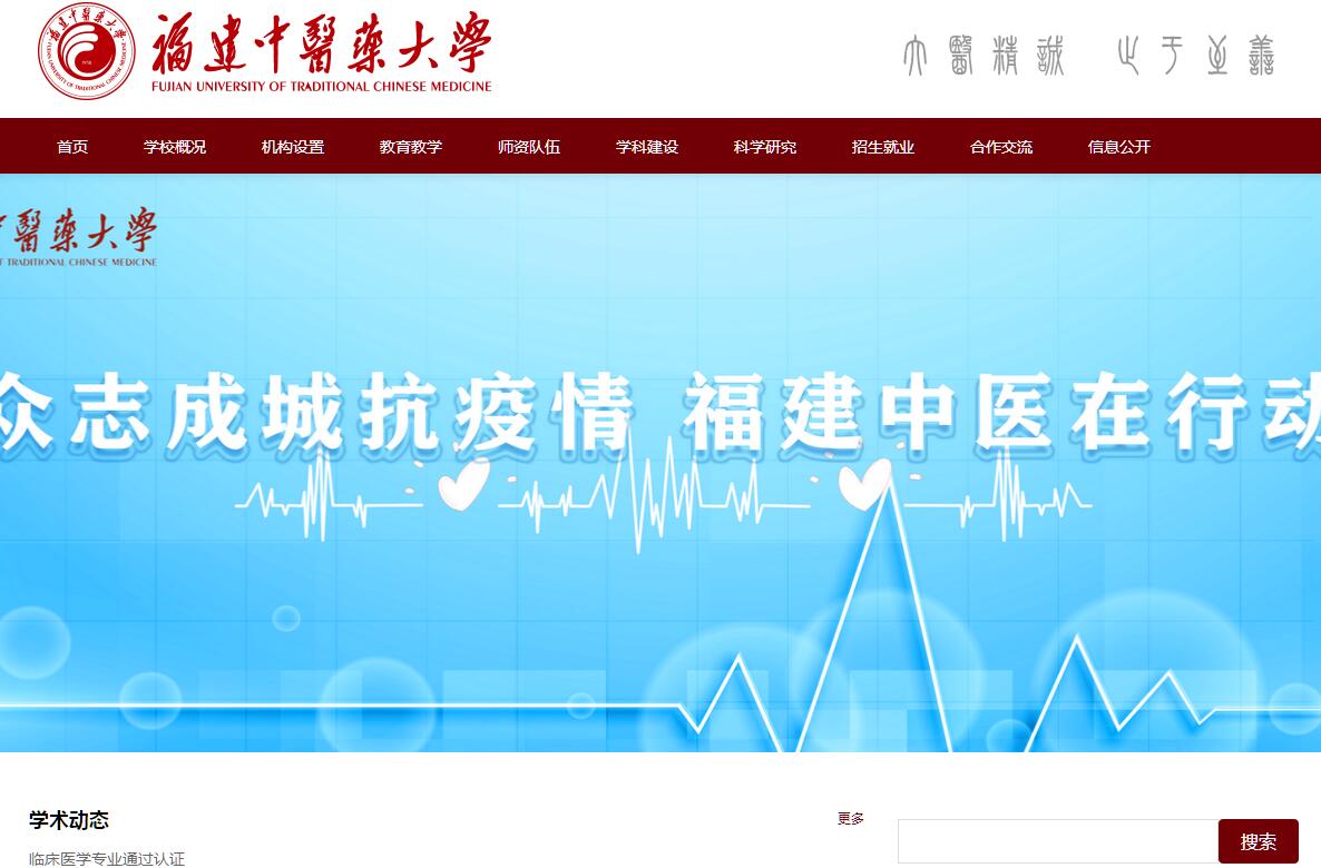 福建中醫(yī)藥大學(xué)原名福建中醫(yī)學(xué)院,創(chuàng)建于1958年,是我國創(chuàng)辦較早的高等中醫(yī)藥院校之一,是福建省重點建設(shè)高校,2010年3月經(jīng)教育部批準(zhǔn)更名為福建中醫(yī)藥大學(xué)。學(xué)校設(shè)有13個學(xué)院(部),2個研究院;有中醫(yī)學(xué)、中西醫(yī)結(jié)合等2個博士學(xué)位授權(quán)一級學(xué)科,17個博士學(xué)位授權(quán)點,有中醫(yī)學(xué)、中西醫(yī)結(jié)合、臨床醫(yī)學(xué)、藥學(xué)、中藥學(xué)、護理學(xué)等6個碩士學(xué)位授權(quán)一級學(xué)科,45個碩士學(xué)位授權(quán)點,有中醫(yī)學(xué)、中藥學(xué)、藥學(xué)、護理學(xué)等4個碩士專業(yè)學(xué)位類別;有中醫(yī)學(xué)、中西醫(yī)結(jié)合等2個博士后科研流動站;有中醫(yī)學(xué)、針灸推拿學(xué)、中西醫(yī)臨床醫(yī)學(xué)、臨床醫(yī)學(xué)、藥學(xué)、中藥學(xué)、藥物制劑、制藥工程、市場營銷、護理學(xué)、公共事業(yè)管理、醫(yī)學(xué)影像技術(shù)、食品科學(xué)與工程、康復(fù)治療學(xué)、信息管理與信息系統(tǒng)、醫(yī)學(xué)實驗技術(shù)、醫(yī)學(xué)檢驗技術(shù)、海洋藥學(xué)、健康服務(wù)與管理、聽力與言語康復(fù)學(xué)、康復(fù)物理治療、康復(fù)作業(yè)治療等22個本科專業(yè)?,F(xiàn)有全日制在校生1.2萬多人,其中研究生1600多人。學(xué)?,F(xiàn)有教職醫(yī)護員工(含四所直屬附屬醫(yī)院)3000多人,其中具有高級職稱的專業(yè)技術(shù)人員700多人;擁有1名國醫(yī)大師、3名全國名中醫(yī);擁有一批國家和衛(wèi)生部有突出貢獻的中青年專家、國務(wù)院特殊津貼專家、國家級名老中醫(yī)學(xué)術(shù)繼承人指導(dǎo)老師、全國百名杰出青年中醫(yī)、全國優(yōu)秀教師等。2002年和2007年,學(xué)校先后兩次在教育部組織的本科教學(xué)工作水平評估中獲得“優(yōu)秀”成績。2010年12月,中醫(yī)學(xué)專業(yè)通過教育部試點專業(yè)認證。2016年,康復(fù)物理治療(PT)和作業(yè)治療(OT)分別通過世界物理治療聯(lián)盟(WCPT)、世界作業(yè)治療聯(lián)盟(WFOT)國際教育標(biāo)準(zhǔn)認證。2017年5月,中藥學(xué)專業(yè)通過教育部試點專業(yè)認證。目前,學(xué)校擁有3門國家級精品課程、2個國家級教學(xué)團隊、4個國家級特色專業(yè)、1門國家級雙語教學(xué)示范課程、1個國家級人才培養(yǎng)模式創(chuàng)新實驗區(qū)、2門國家級精品視頻公開課、3門國家級精品資源共享課、1個國家級專業(yè)綜合改革試點、2項國家級卓越醫(yī)生(中醫(yī))教育培養(yǎng)計劃改革試點項目、1個國家級大學(xué)生校外實踐教育基地和134項國家級大學(xué)生創(chuàng)新創(chuàng)業(yè)訓(xùn)練計劃項目。在近三屆教學(xué)成果評選中獲國家級二等獎1項,省級特等獎3項、一等獎6項、二等獎10項。學(xué)校有20個國家中醫(yī)藥管理局重點學(xué)科。2003年以來,作為福建省重點建設(shè)高校之一,學(xué)校以學(xué)科建設(shè)為核心,帶動其它相關(guān)內(nèi)涵建設(shè)的發(fā)展,取得顯著成績。2008年,學(xué)校再次被列入福建省重點建設(shè)高校。2017年,臨床醫(yī)學(xué)學(xué)科進入ESI全球排名前1%行列。2018年,學(xué)校入選福建省“雙一流”建設(shè)——一流學(xué)科建設(shè)高校行列,其中中西醫(yī)結(jié)合、中醫(yī)學(xué)入選福建省A類高峰學(xué)科,中藥學(xué)、護理學(xué)、藥學(xué)入選福建省高原學(xué)科,臨床醫(yī)學(xué)、管理學(xué)入選福建省應(yīng)用型學(xué)科。學(xué)校有2個國家發(fā)展和改革委員會國家地方聯(lián)合工程研究中心,1個教育部省部共建重點實驗室,1個國家中醫(yī)藥管理局中醫(yī)康復(fù)研究中心,3個國家中醫(yī)藥管理局重點研究室,8個國家(局級)三級科研實驗室,1個國家中醫(yī)藥管理局中醫(yī)藥文獻檢索中心,2個省級“2011協(xié)同創(chuàng)新中心”,18個省級各類重點實驗室、基地及工程技術(shù)研究中心。先后有670項科研成果受到國家和省市的獎勵,其中國家級科研成果獎12項?!笆濉币詠?,學(xué)校進一步推進科技創(chuàng)新,加大科研投入,共承擔(dān)科研課題3084項,其中國家級項目207項,省部級項目669項;獲省部級以上獎勵54項,特別是在國家科技支撐計劃項目、“973計劃”項目、國家自然科學(xué)基金重點項目、海峽兩岸科技合作聯(lián)合基金項目等國家級項目上取得突破。學(xué)校有4所直屬附屬醫(yī)院,其中附屬康復(fù)醫(yī)院成為國內(nèi)首家通過國際康復(fù)質(zhì)量認證委員會(CARF)認證的康復(fù)專科醫(yī)院;有18所非直屬附屬醫(yī)院、7所臨床醫(yī)學(xué)院,各類教學(xué)及畢業(yè)實習(xí)基地逾百所。有康復(fù)、肛腸、脾胃、外科等4個國家臨床重點???,17個國家中醫(yī)藥管理局重點??啤2?。屏山校區(qū)設(shè)立國醫(yī)堂醫(yī)院,為社會提供服務(wù)。學(xué)校擁有兩個校區(qū),共占地1030畝,各類建筑總面積32萬多平方米,教學(xué)科研儀器設(shè)備總值3.4億多元,紙質(zhì)圖書129萬冊、電子圖書88萬冊。學(xué)校各類設(shè)施優(yōu)良,配備了現(xiàn)代化的教學(xué)、科研、行政、生活等設(shè)施,建設(shè)了富有中醫(yī)藥文化氣息的人文景觀,是一個環(huán)境優(yōu)美、文