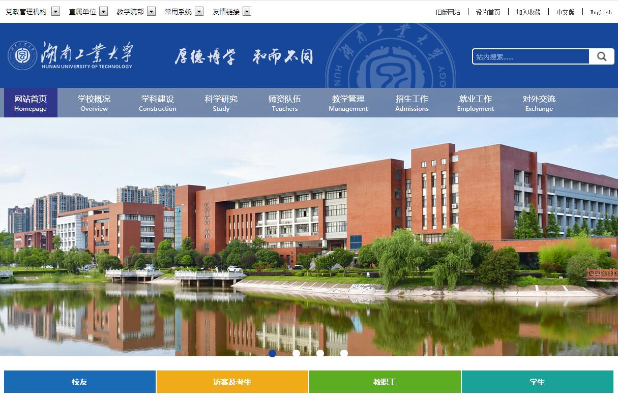 湖南工業(yè)大學(xué)是一所具有60年辦學(xué)歷史的綜合性大學(xué),是"服務(wù)國家特殊需求博士人才培養(yǎng)項(xiàng)目"高校。2006年2月,經(jīng)教育部批準(zhǔn),學(xué)校由株洲工學(xué)院更名為湖南工業(yè)大學(xué),同年合并了株洲師范高等專科學(xué)校和湖南冶金職業(yè)技術(shù)學(xué)院。學(xué)校以包裝教育為特色,是我國第一個被國際包裝協(xié)會(IAPRI)接納的會員單位,是中國包裝聯(lián)合會包裝教育委員會的主任單位,也是全國高校中惟一的中國包裝聯(lián)合會副會長單位和中國包裝技術(shù)培訓(xùn)中心。1995年,學(xué)校作為首批試點(diǎn)的院校,率先通過原國家教委本科教學(xué)工作合格評估。2003年,學(xué)校被國務(wù)院學(xué)位委員會批準(zhǔn)為碩士學(xué)位授予權(quán)單位。2008年被教育部評定為本科教學(xué)工作水平評估優(yōu)秀高校;2009年獲得外國留學(xué)生招收資格;2010年以優(yōu)秀成績通過碩士研究生培養(yǎng)過程質(zhì)量評估; 2013年獲"全國畢業(yè)生就業(yè)典型經(jīng)驗(yàn)高校50強(qiáng)";2013年底獲"服務(wù)國家特殊需求博士人才培養(yǎng)項(xiàng)目"招生權(quán),2014年開始招收博士研究生。學(xué)?,F(xiàn)有2個校區(qū),總占地面積3853.7畝。圖書館總建筑面積為55430.29平方米,館藏圖書242.5余萬冊;教學(xué)科研儀器設(shè)備總值2.81億元,教學(xué)用計(jì)算機(jī)6278臺。學(xué)校擁有較先進(jìn)的計(jì)算機(jī)網(wǎng)絡(luò)服務(wù)體系,建有標(biāo)準(zhǔn)的塑膠田徑運(yùn)動場、體育館及滿足體育教學(xué)需要的各類運(yùn)動場地。學(xué)校有22個教學(xué)學(xué)院和1個獨(dú)立學(xué)院,建立了以工為主,工、理、管、文、經(jīng)、法、教育、藝術(shù)等協(xié)調(diào)發(fā)展的學(xué)科體系;1個"服務(wù)國家特殊需求博士人才培養(yǎng)項(xiàng)目",15個碩士學(xué)位一級學(xué)科碩士學(xué)位點(diǎn),涵蓋72個二級學(xué)科碩士學(xué)位點(diǎn),9個碩士研究生專業(yè)學(xué)位的授權(quán)領(lǐng)域;73個本科專業(yè);國家級教學(xué)團(tuán)隊(duì)1個,省級教學(xué)團(tuán)隊(duì)5個;國家級實(shí)驗(yàn)教學(xué)示范中心1個,省級基礎(chǔ)課示范實(shí)驗(yàn)室實(shí)踐教學(xué)示范中心6個;國家級特色專業(yè)5個,省級特色專業(yè)11個,省級重點(diǎn)專業(yè)5個,國家級精品課程6門、省級精品課程17門。有全日制學(xué)生31192人,其中,碩士研究生1570人。有教職員工2370人,專任教師1822人,其中教授242人,副教授519人,博士373人,博士生導(dǎo)師15人,碩士生導(dǎo)師360人;享受"國務(wù)院政府特殊津貼"人員8人,湖南省優(yōu)秀專家1人,全國優(yōu)秀教師5人,省優(yōu)秀教師4人,省教學(xué)名師3人,省級青年骨干教師71人,16人進(jìn)入省"121人才工程",4人進(jìn)入省"百人工程",9人進(jìn)入省學(xué)科帶頭人行列;聘有兩院院士6人。學(xué)校建立了以工為主,工、理、管、文、經(jīng)、法、教育、藝術(shù)等協(xié)調(diào)發(fā)展的學(xué)科體系,擁有生物醫(yī)學(xué)工程、材料科學(xué)與工程、機(jī)械工程、電氣工程、土木工程等5個湖南省重點(diǎn)學(xué)科;建有"綠色包裝與生物納米技術(shù)應(yīng)用"、"先進(jìn)包裝材料與技術(shù)"等10個省部級重點(diǎn)實(shí)驗(yàn)室,"產(chǎn)品包裝創(chuàng)新工業(yè)設(shè)計(jì)中心"、"包裝設(shè)計(jì)藝術(shù)與技術(shù)研究基地"等7個省部級研究基地;與湖南省第五工程有限公司、株洲市霞灣建材有限責(zé)任公司聯(lián)合組建"建筑墻體節(jié)能新材料"湖南省工程技術(shù)研究中心;與南車株洲電力機(jī)車研究所有限公司等高新技術(shù)企業(yè)聯(lián)合建設(shè)了"湖南省高校研究生培養(yǎng)創(chuàng)新基地"和"湖南省高校產(chǎn)學(xué)研合作示范基地"。 近幾年來,學(xué)校共承擔(dān)國家級教改項(xiàng)目10項(xiàng),省部級教改項(xiàng)目235項(xiàng);獲國家級教學(xué)成果獎1項(xiàng),省級教學(xué)成果獎41項(xiàng);擁有5個省級重點(diǎn)學(xué)科,10個省部級重點(diǎn)實(shí)驗(yàn)室, 13個省部級研究基地(含技術(shù)中心);公開發(fā)表學(xué)術(shù)研究論文12407篇,其中被SCI、EI、ISTP收錄971篇;共承擔(dān)國家級科研項(xiàng)目117項(xiàng),省部級科研項(xiàng)目1223項(xiàng);獲國家級科技進(jìn)步二等獎4項(xiàng),湖南省自然科學(xué)一等獎1項(xiàng),省部級科技成果獎73項(xiàng),專利766項(xiàng)。學(xué)校牽頭主持承擔(dān)的"特殊室內(nèi)環(huán)境凈化關(guān)鍵技術(shù)與成套設(shè)備產(chǎn)業(yè)化開發(fā)"項(xiàng)目,榮獲2010年省科技廳第三批重大科技專項(xiàng)。"冬冷夏熱地區(qū)節(jié)能關(guān)鍵技術(shù)與示范"獲得國家"十二五"科技支撐項(xiàng)目的立項(xiàng)資助。學(xué)校在廣東省建立了東莞包裝學(xué)院,作為學(xué)校在沿海地區(qū)的實(shí)踐教學(xué)基地和人才服務(wù)窗口;與中國社會科學(xué)院聯(lián)合組建的"全球低碳城市聯(lián)合研究中心"通過對全國近百個城市的調(diào)查,完成了中國低碳城市排名這一重大科研項(xiàng)目,從2011年開始每年對外聯(lián)合發(fā)布《中國低碳城市發(fā)展綠皮書》;與株洲市人民政府簽訂了全面科技合作協(xié)議,并組織11個項(xiàng)目負(fù)責(zé)人與