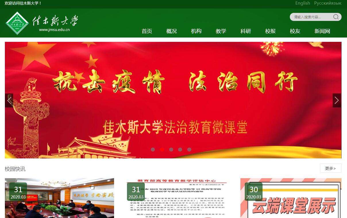 華夏東極人才的搖籃——佳木斯大學,坐落于中國最早迎接太陽升起的地方、最佳生態(tài)環(huán)境魅力城市黑龍江省佳木斯市。學校始建于1947年,于1995年6月27日經(jīng)原國家教委批準,由佳木斯醫(yī)學院、佳木斯工學院、佳木斯師范??茖W校和原佳木斯大學合并組成;2000年后,佳木斯市糧食職工中等專業(yè)學校、富錦師范學校、黑龍江省理工學校相繼并入。學校是黑龍江省重點建設的省屬高水平大學,是黑龍江省門類較全且含有醫(yī)學專業(yè)的綜合性大學,是“十三五”期間“國家百所中西部高?;A能力建設工程(二期)支持高校”,是黑龍江省首批深化創(chuàng)新創(chuàng)業(yè)教育改革示范高校。學校占地1965 畝(131萬平方米),建筑面積57.6萬平方米,設有25個學院和4個研究院、1個研究基地,82個研究所(室)。學校學科專業(yè)設置涵蓋文學、理學、工學、醫(yī)學、經(jīng)濟學、教育學、法學、歷史學、管理學、農(nóng)學、藝術學等十一大學科門類,現(xiàn)有2個博士學位授權一級學科,14個碩士學位授權一級學科,1個碩士學位授權二級學科,9個碩士專業(yè)學位授權點、1個博士后科研流動站和3個博士后科研工作站,76個本科專業(yè);國家級特色專業(yè)3個、省級重點專業(yè)11個、省級重點學科7個、省高校重點實驗室3個、省級實驗教學示范中心4個、原省級精品課程13門、省級精品視頻公開課程2門、省級“精品在線開放課程”5門、“東西部高校課程共享聯(lián)盟上線課程”5門;獲批國家級專業(yè)綜合改革試點項目1個,省級專業(yè)綜合改革試點項目4個;學校成為中國高等教育學會醫(yī)學教育專業(yè)委員會綜合性大學醫(yī)學教育研究學組組長單位,黑龍江省高校優(yōu)質(zhì)課程聯(lián)盟副理事長單位;加入中俄醫(yī)科大學聯(lián)盟、東西部課程聯(lián)盟、全國地方高校UOOC ( University Open Online Course)聯(lián)盟和中國醫(yī)學教育慕課聯(lián)盟。教育部金屬耐磨材料與表面技術工程研究中心、國家衛(wèi)計委康復醫(yī)學人才培訓基地、教育部赴俄留學培訓基地、黑龍江省全科醫(yī)學培訓中心、黑龍江醫(yī)院住院醫(yī)師規(guī)范化培訓基地、黑龍江省佳木斯中俄科技合作中心、黑龍江省高校校企共建耐磨材料研發(fā)中心、黑龍江省三江區(qū)域文化研究學術交流基地設在我校;《佳木斯大學社會科學學報》、《佳木斯大學自然科學學報》、《黑龍江醫(yī)藥科學》三個學報在國內(nèi)外公開發(fā)行。學?,F(xiàn)有教職工4118人(含3個附屬醫(yī)院),其中高級職稱1538人,省級教學名師8人,省級優(yōu)秀研究生導師團隊2個,省科技創(chuàng)新團隊2個;擁有共享“兩院”院士、龍江學者等一批特聘教授和客座教授;現(xiàn)有來自全國31個省、市、自治區(qū)的全日制本科在校生22244人,博、碩研究生1506人,留學生684人,繼續(xù)教育學生13569人;固定資產(chǎn)總值14.28億元,其中教學儀器設備總值3.02億元,圖書館藏書258.33萬冊。學校堅持“以人為本,服務地方”的辦學理念,秉承“明德礪學,崇尚實踐”的校訓,努力建設“團結(jié)勤奮、求是創(chuàng)新”的校風、“嚴謹治學、教學育人”的教風和“勵志、篤學、睿思、求新”的學風,致力培養(yǎng)理想信念堅定、社會責任感強、專業(yè)基礎扎實、具有創(chuàng)新精神和實踐能力的高素質(zhì)應用型人才。學校堅持以人才培養(yǎng)為中心,大力實施教育教學綜合改革,創(chuàng)新人才培養(yǎng)模式、調(diào)整學科專業(yè)結(jié)構布局,實施大類招生培養(yǎng),增設第三學期,并通過創(chuàng)設校長創(chuàng)新創(chuàng)業(yè)基金、深入開展第二課堂活動等舉措,將創(chuàng)新、創(chuàng)業(yè)納入人才培養(yǎng)全過程,學生的綜合素質(zhì)和創(chuàng)新、創(chuàng)業(yè)、就業(yè)能力不斷增強。學校堅持以學科建設為龍頭,校、院重點學科協(xié)調(diào)發(fā)展,學科建設水平穩(wěn)步提高,學科綜合優(yōu)勢進一步彰顯。學校主持國家“973計劃”、“863計劃”項目,國家自然科學基金、社會科學基金項目,國家科技支撐計劃項目,衛(wèi)計委、教育部和國家民委項目等各級、各類多項課題。在耐磨材料、藥物研發(fā)、農(nóng)機工程等研究領域取得了數(shù)十項國家發(fā)明專利,科技成果轉(zhuǎn)化工作取得新進展,服務經(jīng)濟社會發(fā)展的能力不斷提升。學校擁有3個附屬醫(yī)院、1個校醫(yī)院(社區(qū)衛(wèi)生服務中心);擁有設施齊全的體育場館和現(xiàn)代化的音樂廳;實現(xiàn)了校園網(wǎng)絡有線無線全覆蓋和校園一卡通;擁有現(xiàn)代化數(shù)字圖書館,并可通過移動圖書館實現(xiàn)百萬冊電子圖書及中外文文獻數(shù)據(jù)隨身攜帶;擁有課程中心平臺、沉浸教室、錄播教室并已實現(xiàn)數(shù)字教室全覆蓋,可為廣大師生提供良好的泛在學習與科研環(huán)境。學校堅持開放式辦學,與俄、日、韓、美、英等11個國家和地區(qū)的45所高校建立了友好合作關系。作為中國政府來華留學獎學金項目委托院校,接收來自49個國家的留學生在校學習。天朗氣清舒望眼,丹心一片譜華章。學校始終堅持社會主義辦學方向,堅持全面貫徹黨的教育方針,以創(chuàng)新、協(xié)調(diào)、綠色、開放、共享的發(fā)展理念為指引,以立德樹人為根本任務,堅持質(zhì)量立校、