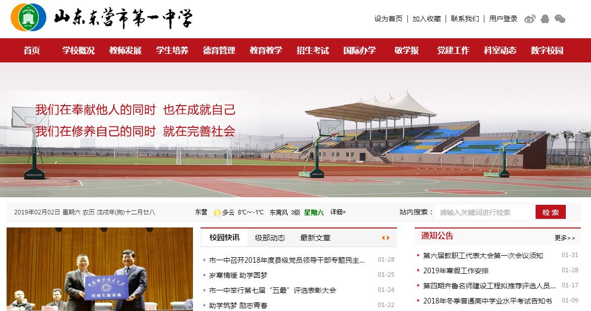 東營市一中建校于1988年,原校址為東營區(qū)東三路165號。2013年10月8日,市委、市政府作出“建設(shè)一中新校”的重大決策。2016年9月1日,搬遷新校。學(xué)校坐落于東城金湖銀河風(fēng)景區(qū)園博路99號,占地面積469畝?,F(xiàn)有教職工548人,在校生6000人,120個教學(xué)班。伴隨著黃河三角洲的開發(fā)建設(shè),經(jīng)過30年的發(fā)展積淀,如今的市一中正展現(xiàn)著黃河口教育獨(dú)特的魅力,鞏固著齊魯名校的地位,朝著現(xiàn)代化全國一流名校邁進(jìn)。學(xué)校秉持“敬學(xué)”的辦學(xué)理念,秉承“我們在奉獻(xiàn)他人的同時,也在成就自己;我們在修養(yǎng)自己的同時,就在完善社會”的校訓(xùn)。歷時四年建成的一中新校是一座集學(xué)習(xí)、生活、健身于一體的書苑式校園,布局合理、現(xiàn)代大氣,環(huán)境宜人、建筑精美,書香濃郁,人文底蘊(yùn)濃厚。學(xué)校編寫了東營市一中《教師手冊》、《學(xué)生手冊》、《班主任手冊》、《行政值班手冊》、《安全工作指南》,編輯了校報(bào)《敬學(xué)報(bào)》、??逗胍恪贰⑿睦砜铩缎钠瘘c(diǎn)》,打造了文武二圣、智慧之門、三和鼎、夢想廣場等系列文化景觀,蘊(yùn)含著“人文校園、綠色校園、和諧校園、詩意校園”的文化理念。30年間,學(xué)校經(jīng)歷了三屆領(lǐng)導(dǎo)班子。前兩任領(lǐng)導(dǎo)班子殫精竭慮,艱苦奮斗,為學(xué)校的快速發(fā)展奠基立業(yè)。2012年5月,以史本泉同志為校長的新一屆領(lǐng)導(dǎo)班子,提出了“穩(wěn)定外延發(fā)展,加強(qiáng)內(nèi)涵建設(shè)”的深層發(fā)展思路,以創(chuàng)建“現(xiàn)代化全國一流名?!睘槟繕?biāo),以“穩(wěn)定、質(zhì)量、發(fā)展”為重點(diǎn),以條件、師資、管理、質(zhì)量“四個一流”統(tǒng)攬全局,緊緊圍繞“素質(zhì)教育要有新突破,學(xué)校管理要有新舉措,隊(duì)伍建設(shè)要有新跨越,教育質(zhì)量要上新臺階”的工作思路,積極構(gòu)建教學(xué)評價多元化、德育途徑多樣化、常規(guī)管理規(guī)范化、課堂教改常態(tài)化的辦學(xué)特色,學(xué)校迎來立足特色、轉(zhuǎn)型發(fā)展的新局面。近年來,學(xué)校被教育部表彰為全國國防教育特色學(xué)校、全國青少年足球特色,獲省級規(guī)范化學(xué)校、省級文明單位、省教學(xué)示范學(xué)校、省教育系統(tǒng)先進(jìn)集體、省文明校園等省級以上榮譽(yù)70余項(xiàng),獲山東省“2017年度最具創(chuàng)新發(fā)展能力高級中學(xué)”稱號,成為山東省唯一一所國家安全教育基地;學(xué)校連續(xù)蟬聯(lián)東營市績效考核A類單位,成為東營市首批教育現(xiàn)代化學(xué)校、廉政文化進(jìn)學(xué)校示范點(diǎn)、心理健康教育特色學(xué)校,在全市104個副縣級以上單位的社會滿意度測評中,名列全市第一名。辦學(xué)業(yè)績被東營電視臺、德育報(bào)、齊魯晚報(bào)、東營教育信息網(wǎng)等媒體報(bào)道,入選全國《辦人民滿意教育》一書(全省只有兩所),這些都為學(xué)校的發(fā)展創(chuàng)造了良好的輿論氛圍,提升了市一中的社會聲譽(yù)。學(xué)校教職工中,正高級教師2人,高級教師139人,一級教師217人。博士學(xué)位教師2人,碩士學(xué)位教師21人。全國優(yōu)秀教師2人、省特級教師2人、省級教學(xué)能手7人、省級優(yōu)秀教師4人、齊魯名校長1人、省富民強(qiáng)魯勞動獎?wù)芦@得者1人、東營市特級教師2人、東營市名師6人、東營市勞動模范1人、東營市名師工作室和名校長工作室4個、受表彰的市級以上骨干教師198人。學(xué)校通過“內(nèi)引”和“外培”兩大方式,積極構(gòu)建“走出去學(xué)習(xí)”、“請進(jìn)名師名家”、“一中名師論壇”等8大平臺,教師的師德、教學(xué)、科研、創(chuàng)新能力在省內(nèi)外首屈一指,學(xué)校先后被評為山東省教育系統(tǒng)先進(jìn)集體、省師德建設(shè)先進(jìn)集體、東營市職業(yè)道德建設(shè)十佳集體。這里是學(xué)子成才的知識殿堂。學(xué)校連續(xù)十幾年成為東營市教學(xué)質(zhì)量優(yōu)勝單位,有4位同學(xué)先后獲得山東省高考文、理科第一名,焦宇辰、焦宇曉被贊譽(yù)為“姐妹花雙雙上清華”。作為山東藏族插班生培養(yǎng)基地,學(xué)校有8位藏族考生的高考成績同樣囊括了山東省同類考生的文、理科第一名。近5年來,我校31人被清華、北大錄取,兩次同時囊括東營市文、理科狀元,79人被帝國理工大學(xué)等世界綜合排名前50的名校錄取。高考一本上線率56﹪,本科錄取率93﹪,連續(xù)五年成為東營市僅有的兩所本科過千人的學(xué)校之一。學(xué)校獲全國信息學(xué)、生物學(xué)、數(shù)學(xué)、化學(xué)、物理學(xué)奧賽金牌學(xué)校稱號,獲中國石油大學(xué)、中國海洋大學(xué)等眾多211名?!皟?yōu)質(zhì)生源基地”稱號,成為南京大學(xué)創(chuàng)新型人才培養(yǎng)戰(zhàn)略合作伙伴,獲中國科學(xué)院大學(xué)“科教結(jié)合協(xié)同育人”杰出貢獻(xiàn)獎,成為山東省11所擁有設(shè)立高中國際部資質(zhì)的學(xué)校之一,成為山東省第8所擁有北京大學(xué)博雅計(jì)劃和清華大學(xué)領(lǐng)軍計(jì)劃雙推薦資格的學(xué)校。這里是賞識教育的精神家園。學(xué)校把立德樹人放在工作的首要位置,構(gòu)