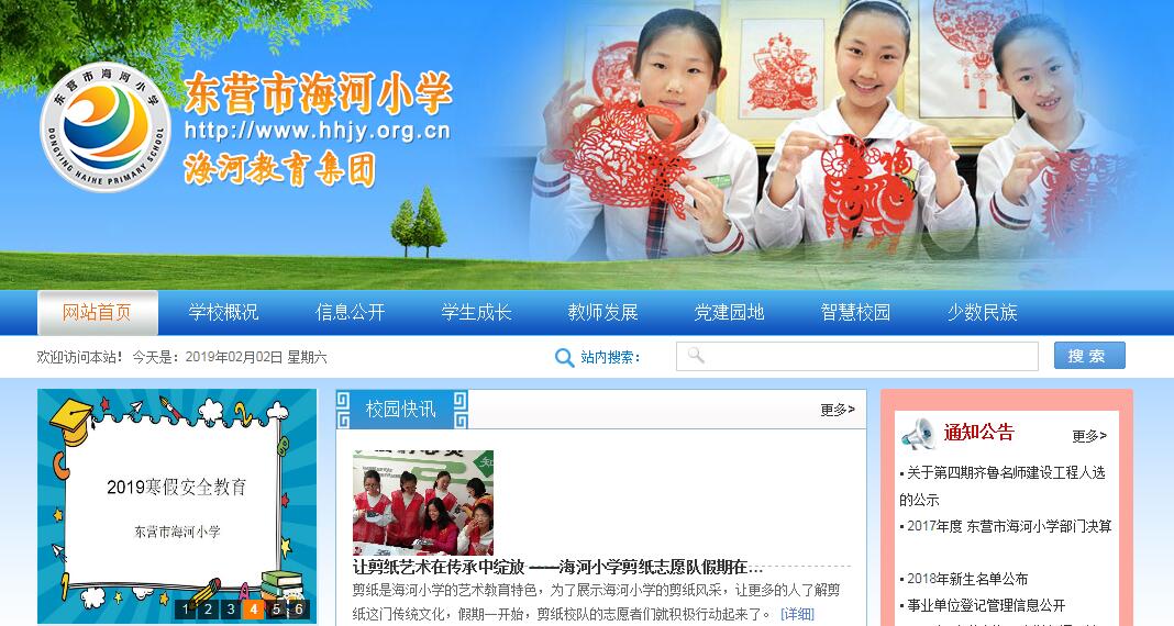 在共和國最年輕的土地——黃河三角洲上,教育園圃里升騰起一顆璀璨的新星——東營市海河小學(xué)。學(xué)校創(chuàng)辦于1995年,是一所公辦市直小學(xué),隸屬于東營市教育局,位于東營市東營區(qū)遼河路131號。學(xué)校占地4公頃,建筑面積14700平方米,學(xué)?,F(xiàn)有教職工126名。2015年9月,與學(xué)校東營經(jīng)濟(jì)開發(fā)區(qū)的分校東凱第二小學(xué)組建海河教育集團(tuán),分?,F(xiàn)有教職工50人,占地3公頃,建筑面積11000平方米。教育基于生命,生命融入教育,這是教育的本質(zhì)。為此,我校把生命幸福教育作為辦學(xué)思想,把“納潤生命,養(yǎng)正塑品”作為核心辦學(xué)理念。構(gòu)建生命幸福成長課程,打好學(xué)生生命底色;建設(shè)“和諧、高效、溫暖、生動”的生命課堂,關(guān)注師生共同成長;培育生命品格教師,促進(jìn)教師專業(yè)化發(fā)展;開展小班化教育試點,實現(xiàn)“少一半的學(xué)生,多一倍的關(guān)愛”; 開展豐富多彩的社團(tuán)活動,提升學(xué)生生命質(zhì)量;舉辦海河分校,讓更多的孩子享受生命幸福教育。我們的愿景是讓每一個生命綻放幸福光彩。學(xué)校始終堅持“教師發(fā)展保障學(xué)生發(fā)展,讓教師和學(xué)生共同成長”的工作思路,通過實施“教師梯級培養(yǎng)工程”、“讀書工程”、“基本功提升工程”、“名師帶徒工程”,著力打造“教師博客群”、“校本教研網(wǎng)”、“學(xué)科教學(xué)研究會”等研修平臺,促進(jìn)教師專業(yè)成長,打造了一支思想水平高、業(yè)務(wù)能力強(qiáng)、師德師風(fēng)好的教師隊伍。涌現(xiàn)出全國優(yōu)秀教師3人,全國優(yōu)秀少先隊輔導(dǎo)員1人,國家級骨干教師(校長)3人;山東省特級教師2人,省優(yōu)秀教師、省級教學(xué)能手、省級骨干教師、省創(chuàng)新人物20人;東營市有突出貢獻(xiàn)的中青年專家1人,市特級教師、市勞模、市名師、市優(yōu)秀教師、市級教學(xué)能手48人,市級骨干教師30人,成長起了一批思想水平高、業(yè)務(wù)能力強(qiáng)、師德師風(fēng)好的骨干教師隊伍。集團(tuán)總校學(xué)校現(xiàn)有37個教學(xué)班,在校生2300余名,分校今年新招生14個班,在校生500人。本著“實施素質(zhì)教育,培養(yǎng)高素質(zhì)人才”的宗旨,堅持“納潤生命,養(yǎng)正塑品“的辦學(xué)理念,實施生命幸福教育,發(fā)揚(yáng)“胸寬如海,競進(jìn)似河,敢為天下先”的學(xué)校精神,以“四個滿意”(學(xué)生滿意、家長滿意、社會滿意、政府滿意)為出發(fā)點,著力培養(yǎng)符合社會主義現(xiàn)代化建設(shè)需要的人才。學(xué)校自開辦以來,近30名同學(xué)獲得“宋慶齡基金獎”、“省十佳少先隊員”、“齊魯小名士”等全國或省級榮譽(yù)稱號,多人次獲得市“十佳少年”、“十佳美德少年”等稱號,學(xué)校榮獲“全國雛鷹大隊”、“全國紅旗中隊”、“山東省心理健康教育先進(jìn)單位”、“山東省優(yōu)秀少先大隊集體”等國家或省級集體榮譽(yù)稱號10個,收到社會各界的感謝信100余封。在全國、省、市舉辦的各類作文比賽、藝體科技競賽中,近4000人次獲獎。春華秋實,學(xué)校經(jīng)過近二十年的不懈努力,取得了可喜的成績,先后被授予“東營市首批教育現(xiàn)代化學(xué)?!啊ⅰ吧綎|省規(guī)范化學(xué)校”、“山東省首批教學(xué)示范學(xué)校”、“山東省家庭教育工作先進(jìn)單位”、“山東省師德建設(shè)十佳先進(jìn)集體”、“山東省德育工作先進(jìn)集體”、“山東省藝術(shù)教育示范學(xué)校”、“山東省創(chuàng)新教育實驗與研究先進(jìn)單位”、“全國嘗試教育實驗研究先進(jìn)單位”、“全國校園環(huán)境文化藝術(shù)建設(shè)先進(jìn)單位”等160余項稱號?;厥走^去,我們豪情滿懷,展望未來,我們信心百倍,我們將乘著教育發(fā)展的東風(fēng),鼓足干勁,乘風(fēng)破浪,開拓創(chuàng)新,不斷提升教育教學(xué)品質(zhì),促進(jìn)學(xué)校全面和諧發(fā)展,努力把海河小學(xué)打造成高水平教育現(xiàn)代化學(xué)校。